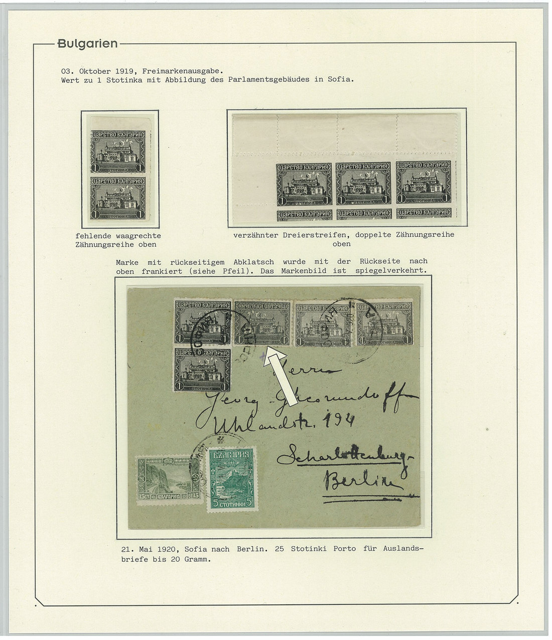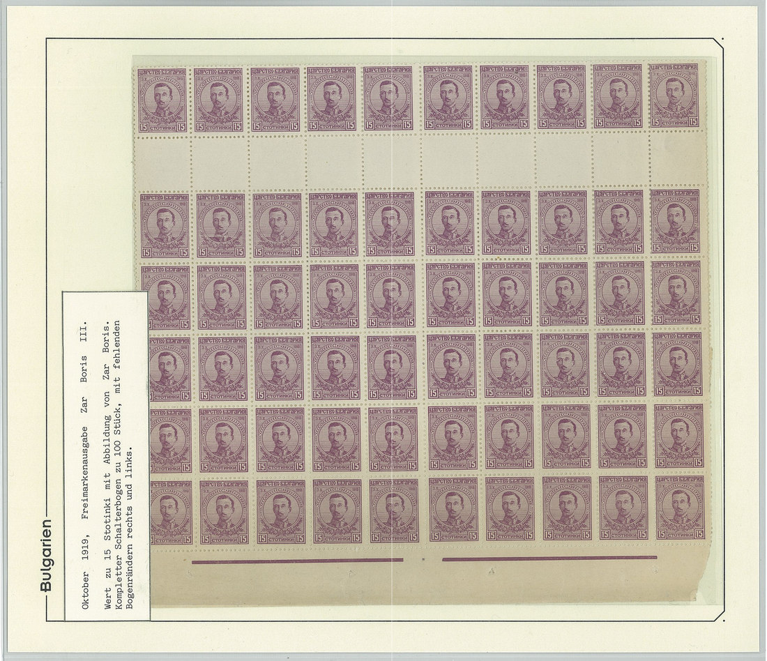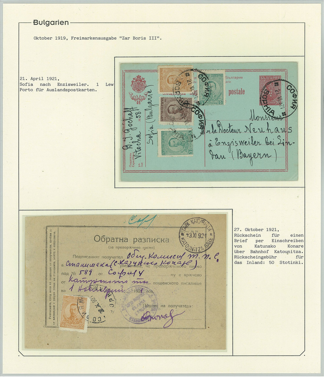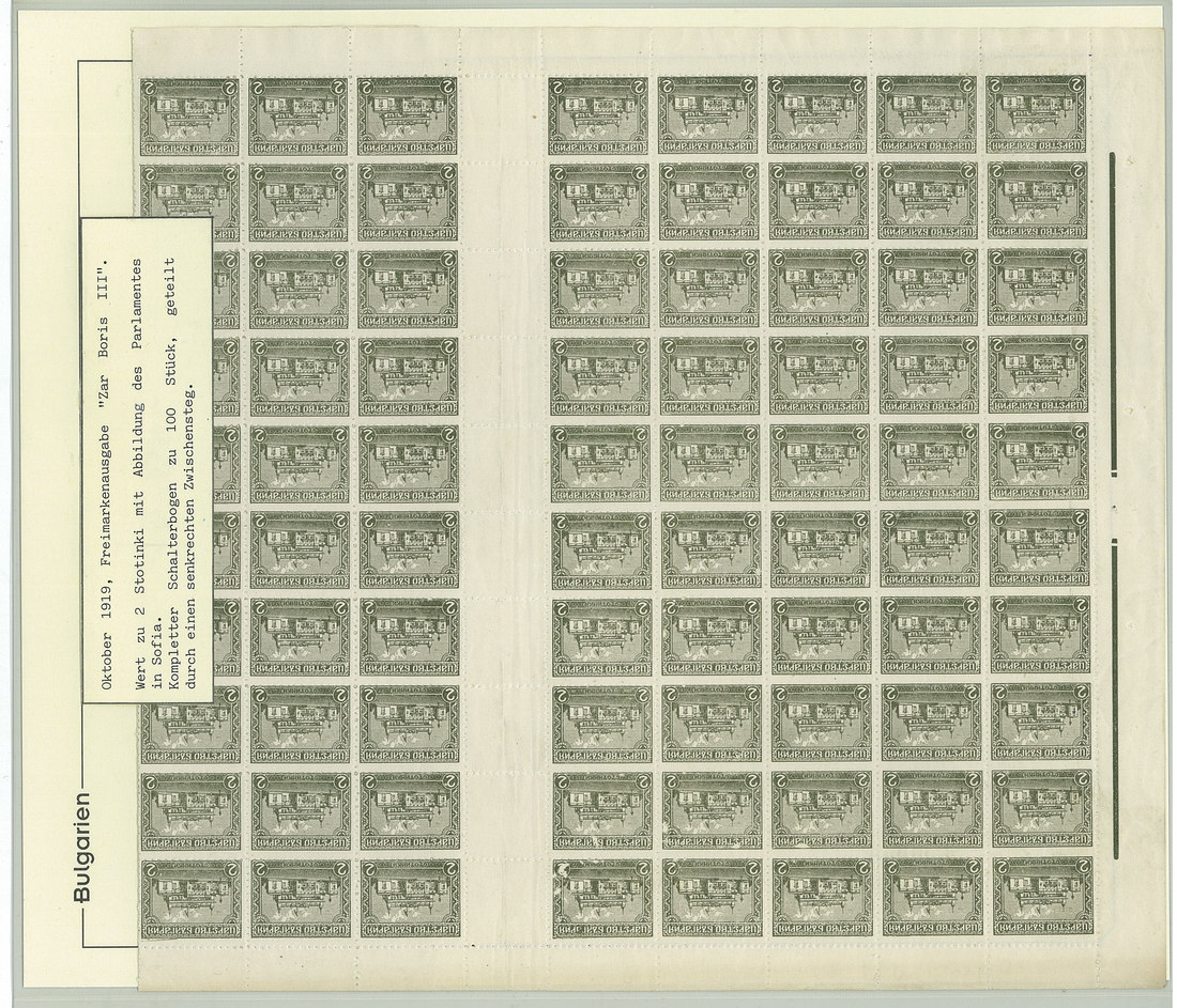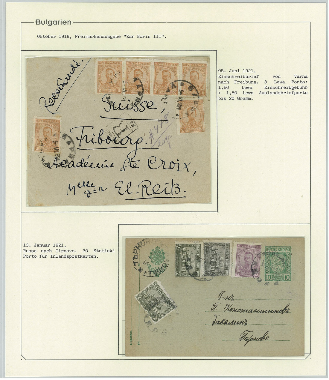 BulgariaLater Issues1919-20, Tsar Boris III. A comprehensive collection mounted on exhibition pages, comprising over 800 stamps including complete sheets, abundant varieties incl. the rare fiscal stamps paper, proofs and imperforates; and 35 items in a good array of postal documents, being mainly covers sent abroad. Viewing essential. Mi. 126-134. Photo