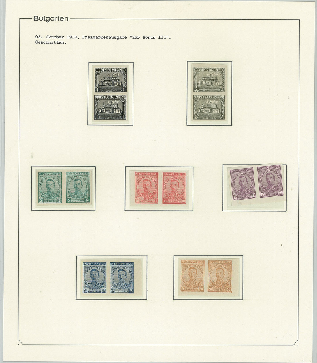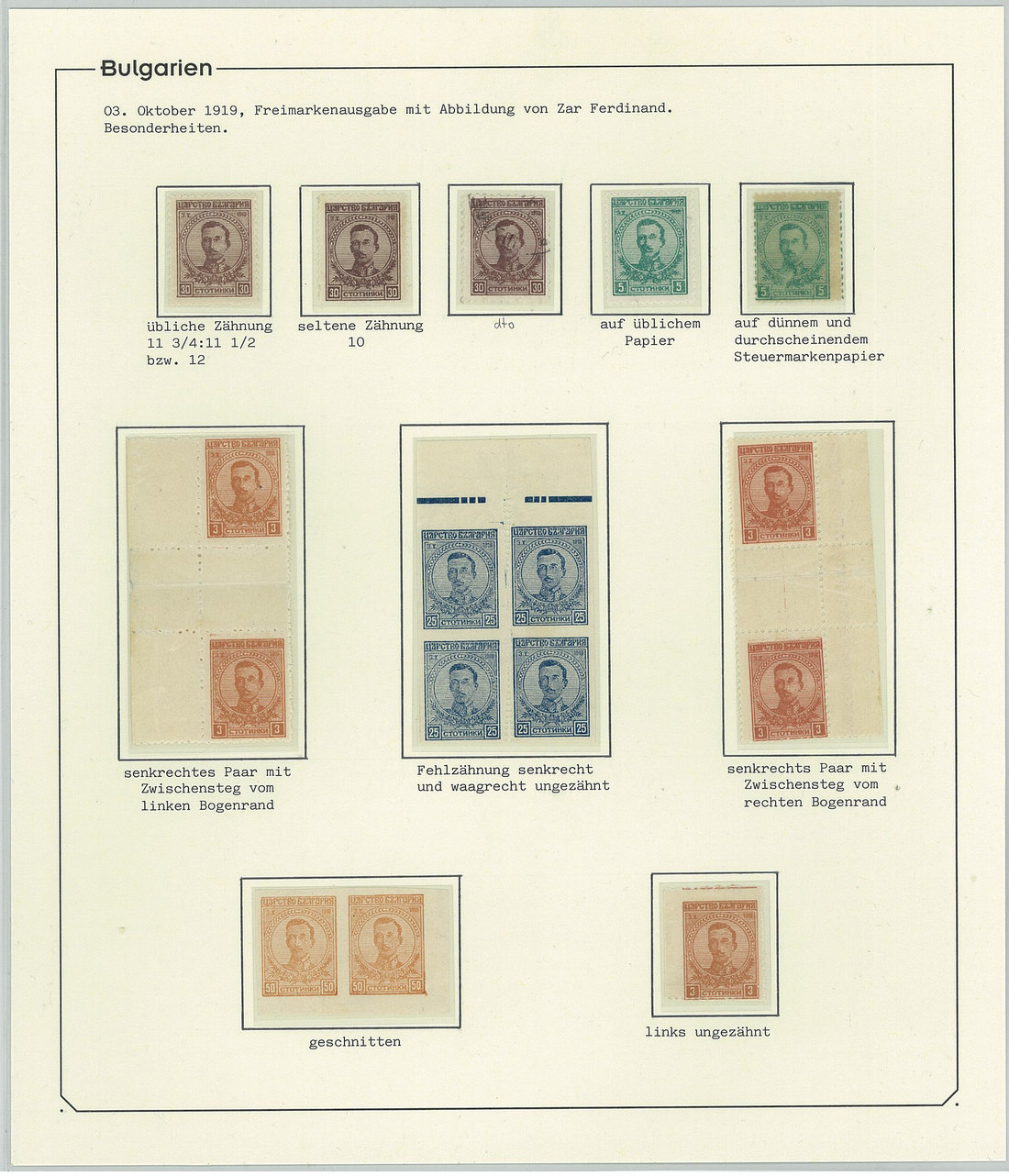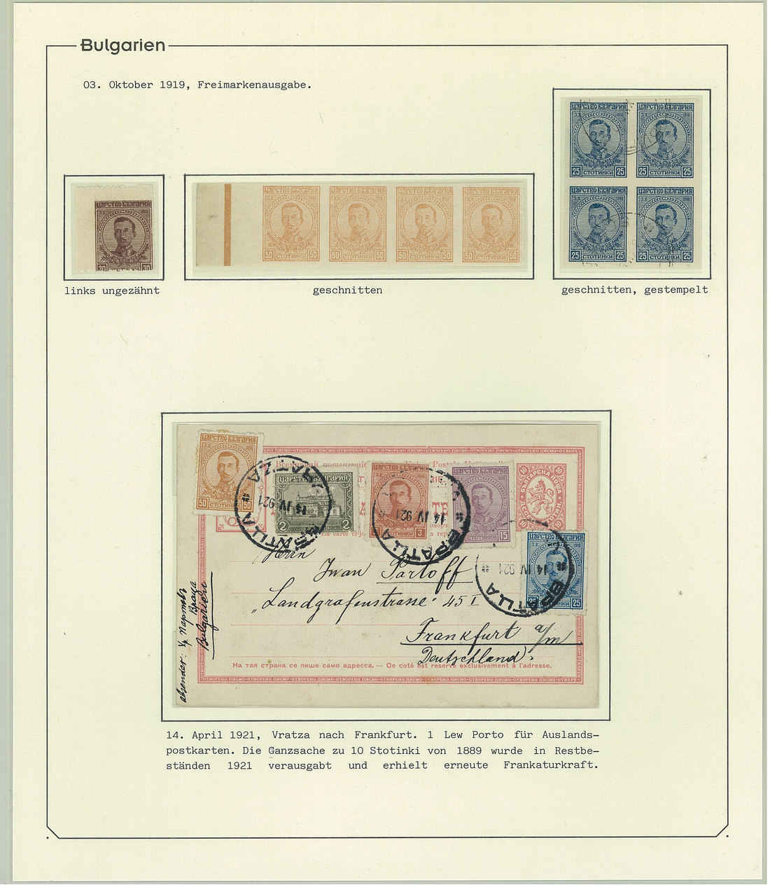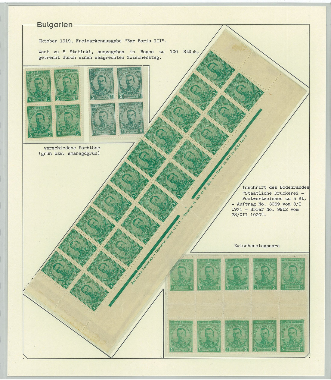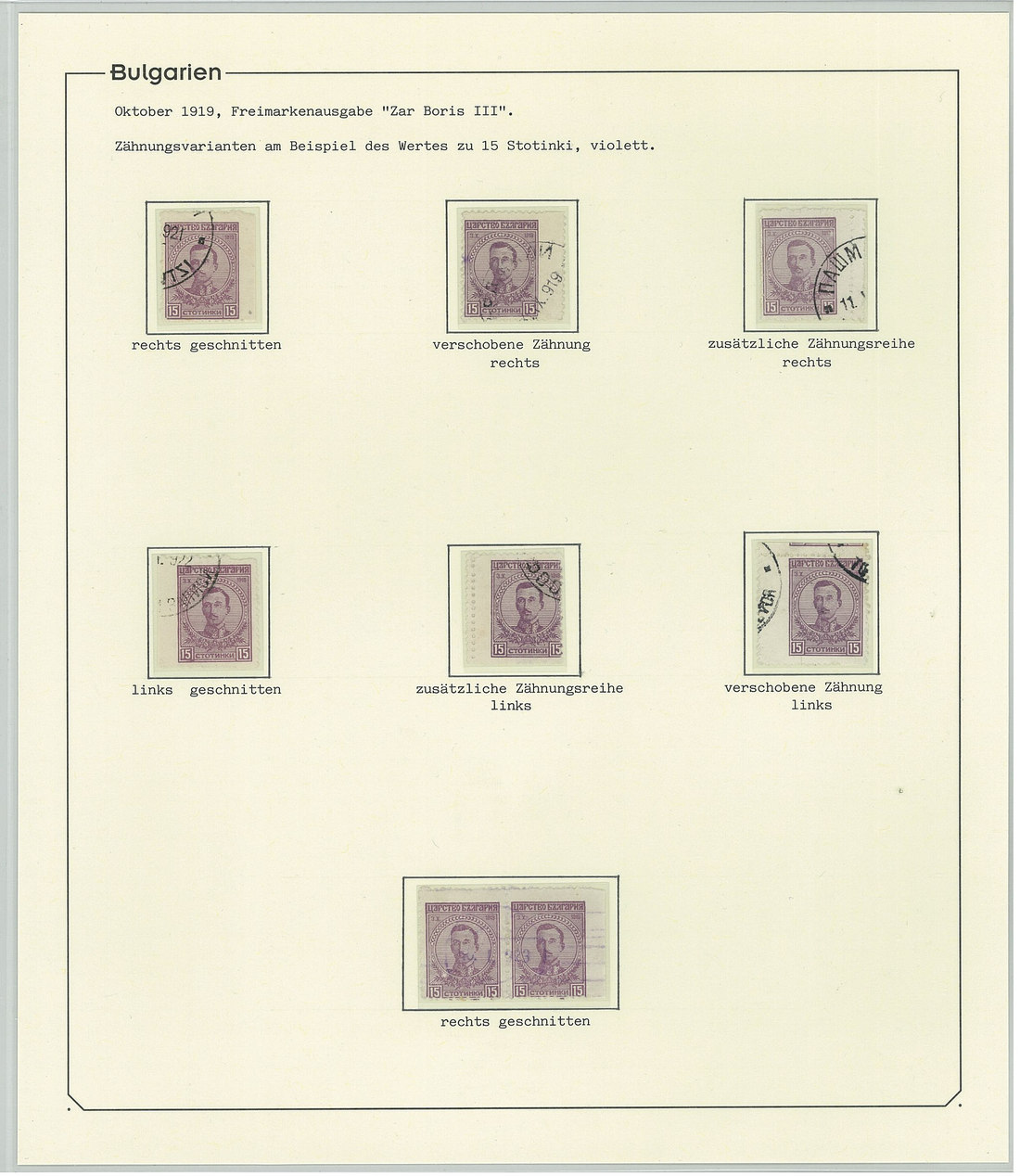 BulgariaLater Issues1919-20, Tsar Boris III. A comprehensive collection mounted on exhibition pages, comprising over 800 stamps including complete sheets, abundant varieties incl. the rare fiscal stamps paper, proofs and imperforates; and 35 items in a good array of postal documents, being mainly covers sent abroad. Viewing essential. Mi. 126-134. Photo