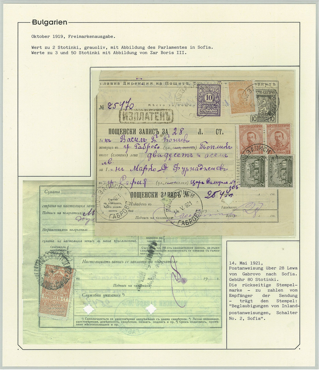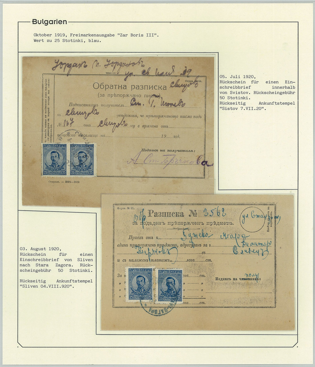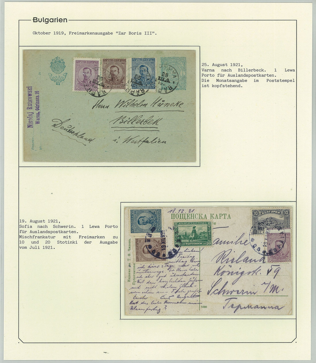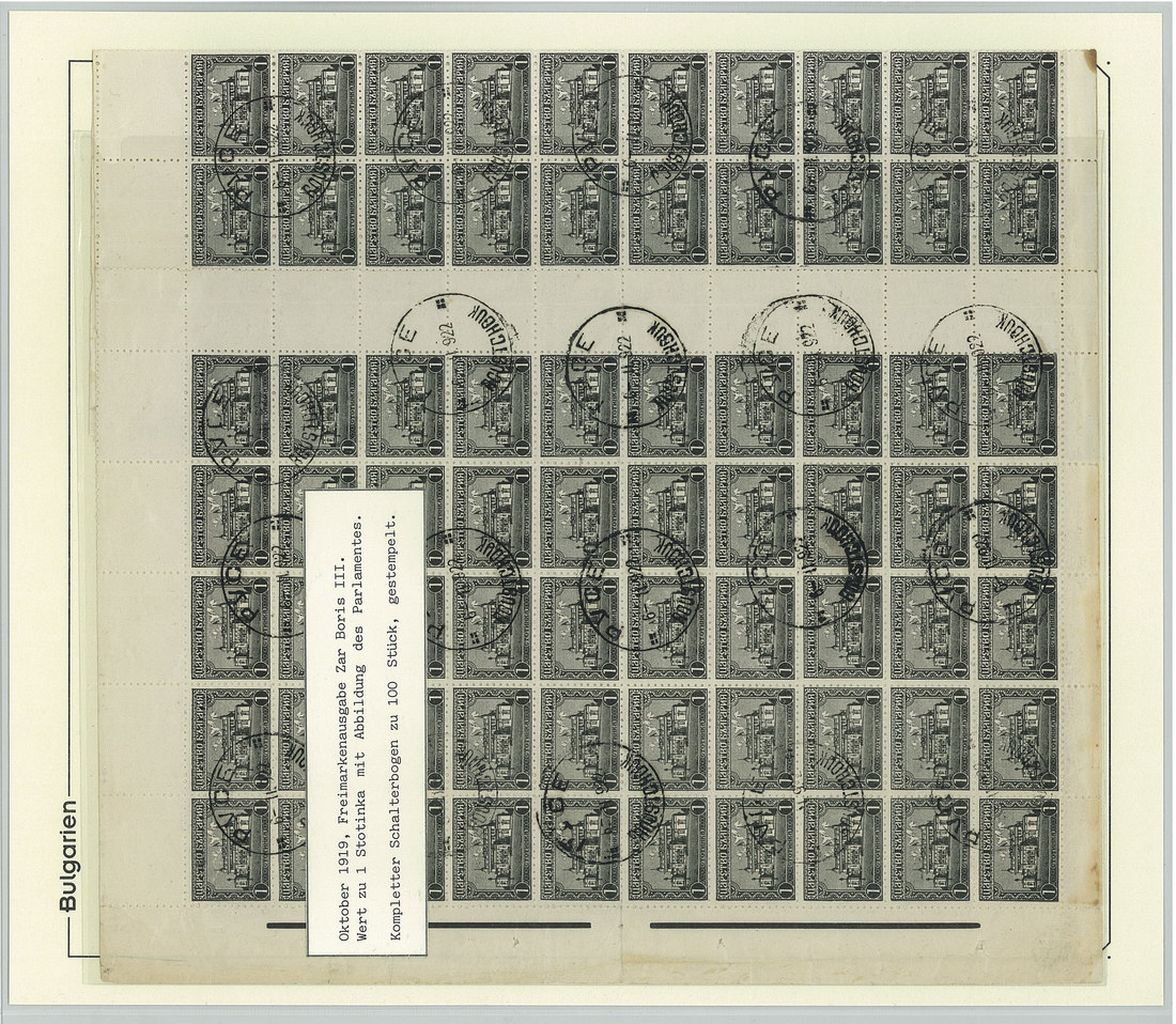 BulgariaLater Issues1919-20, Tsar Boris III. A comprehensive collection mounted on exhibition pages, comprising over 800 stamps including complete sheets, abundant varieties incl. the rare fiscal stamps paper, proofs and imperforates; and 35 items in a good array of postal documents, being mainly covers sent abroad. Viewing essential. Mi. 126-134. Photo