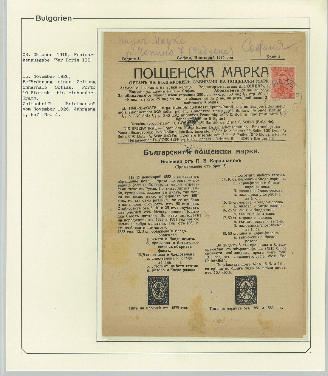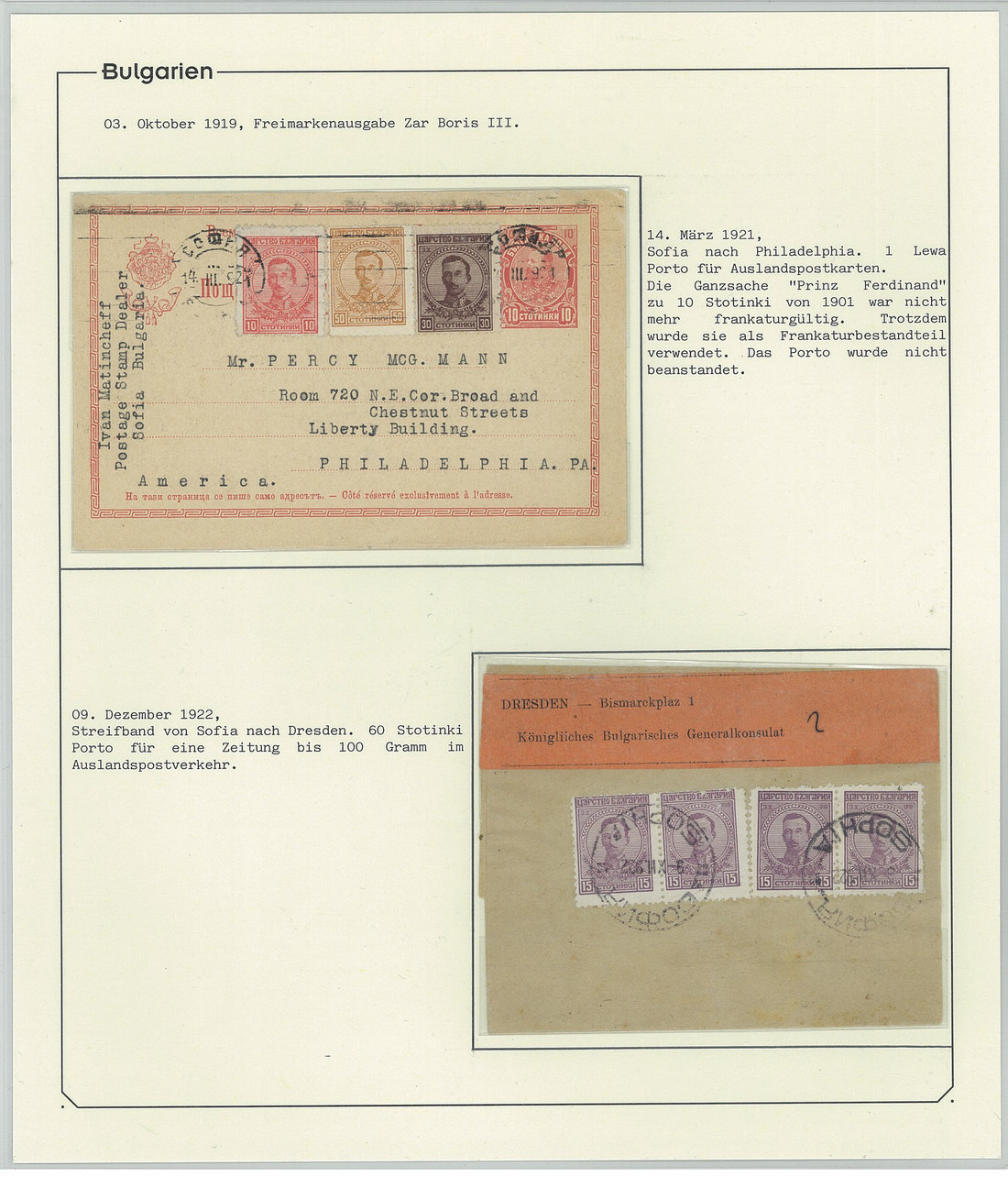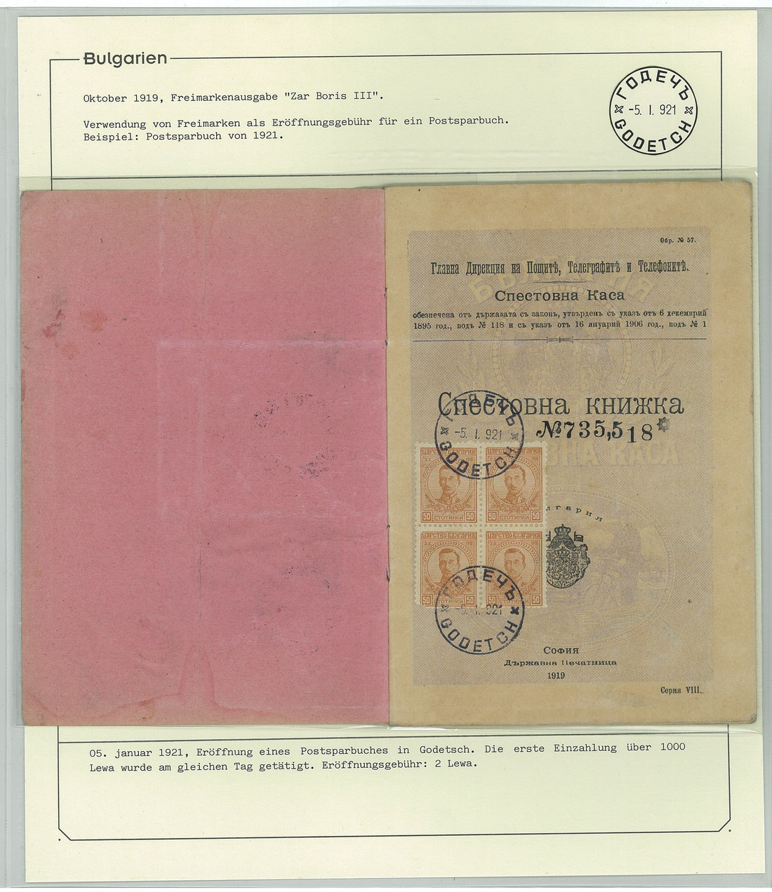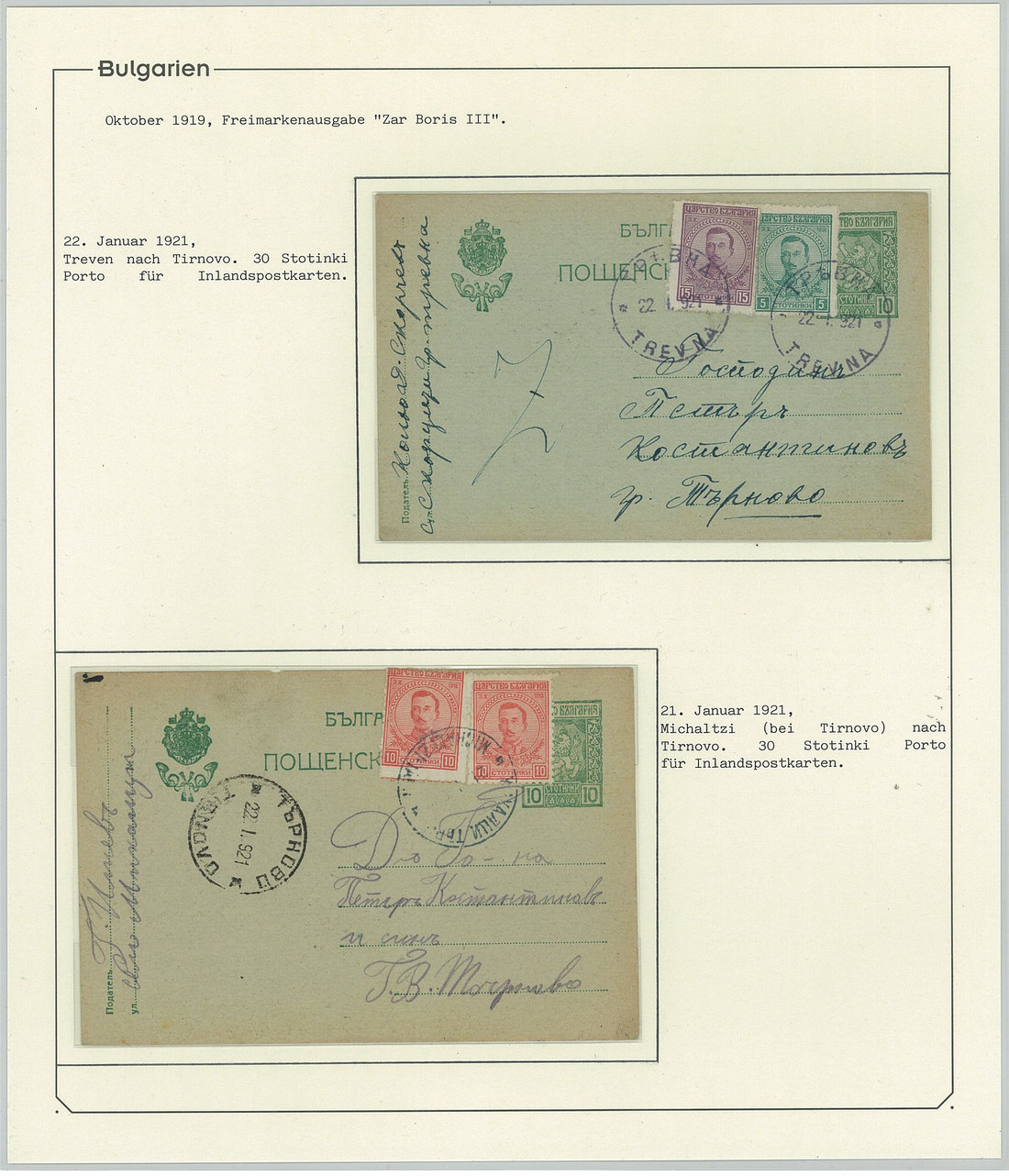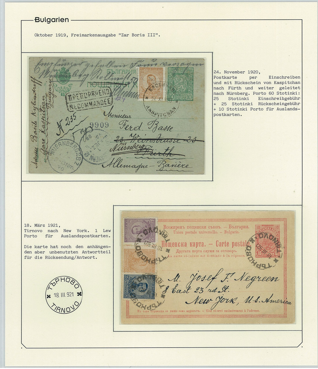 BulgariaLater Issues1919-20, Tsar Boris III. A comprehensive collection mounted on exhibition pages, comprising over 800 stamps including complete sheets, abundant varieties incl. the rare fiscal stamps paper, proofs and imperforates; and 35 items in a good array of postal documents, being mainly covers sent abroad. Viewing essential. Mi. 126-134. Photo