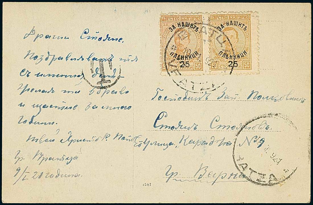 BulgariaLater Issues1920, P.O.W. surtax, 25st. on 50st. pair, tied by Vratza c.d.s. on postcard to Sofia. The postcard was erroneously struck with "T" marking, as the franking correctly paid the 50st. inland postcard rate of that time, this being another proof of the anarchic situation of the post after the war. Only 10 to 15 non-philatelic covers recorded in this issue, being one of the rarest applied on mail carried through the post. Cert. Hitzler. Mi. 141. Photo