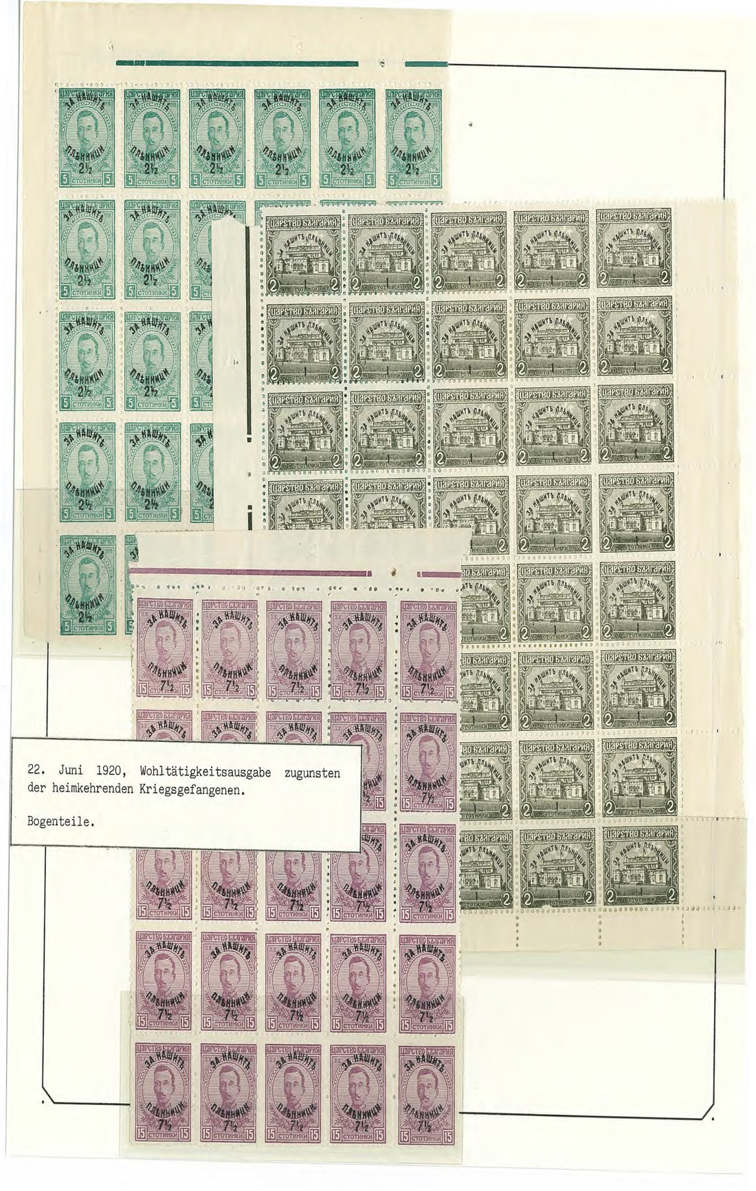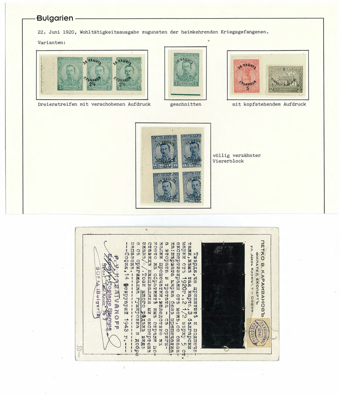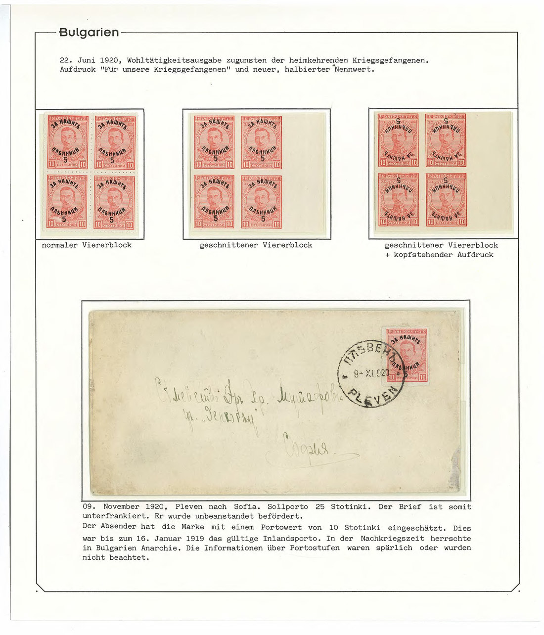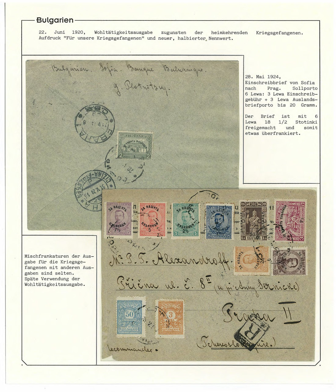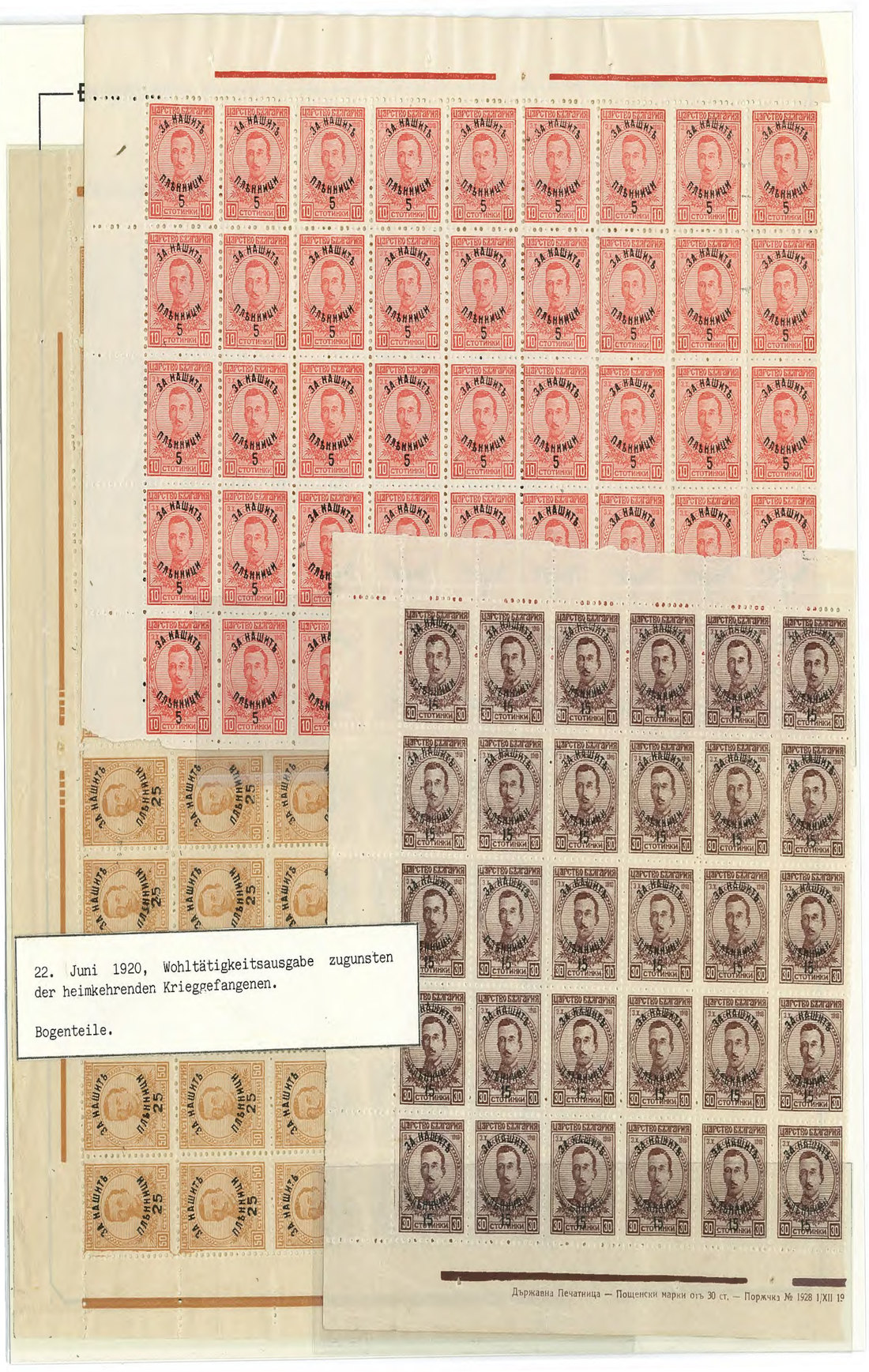 BulgariaLater Issues1920, Prisoners of War Surtax. A specialized collection containing over 400 stamps with part sheets, overprint varieties (incl. one Karaivanoff cert.) and imperforates, as well as five covers, of which one being an exceedingly rare non-philatelic usage (cert. Hitzler) and, as usually found, underfranked usages. A remarkable and very rare assembly. Mi. 135-144. Photo