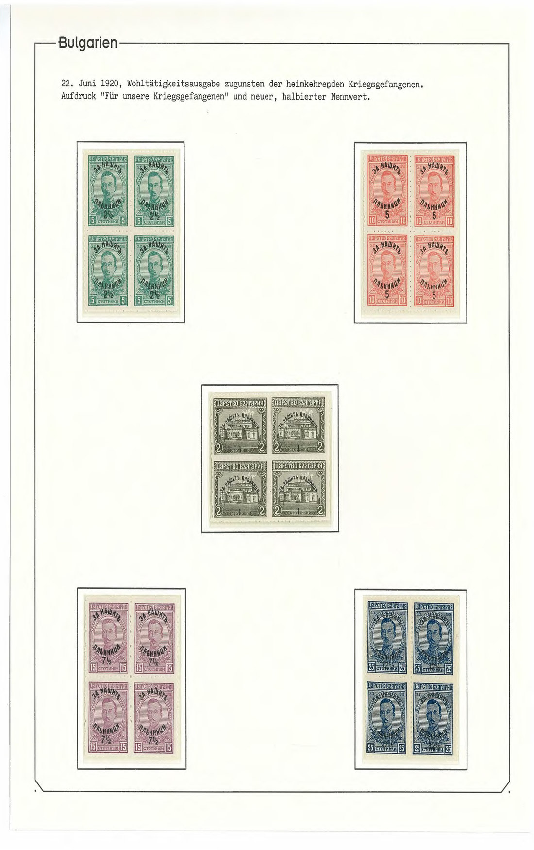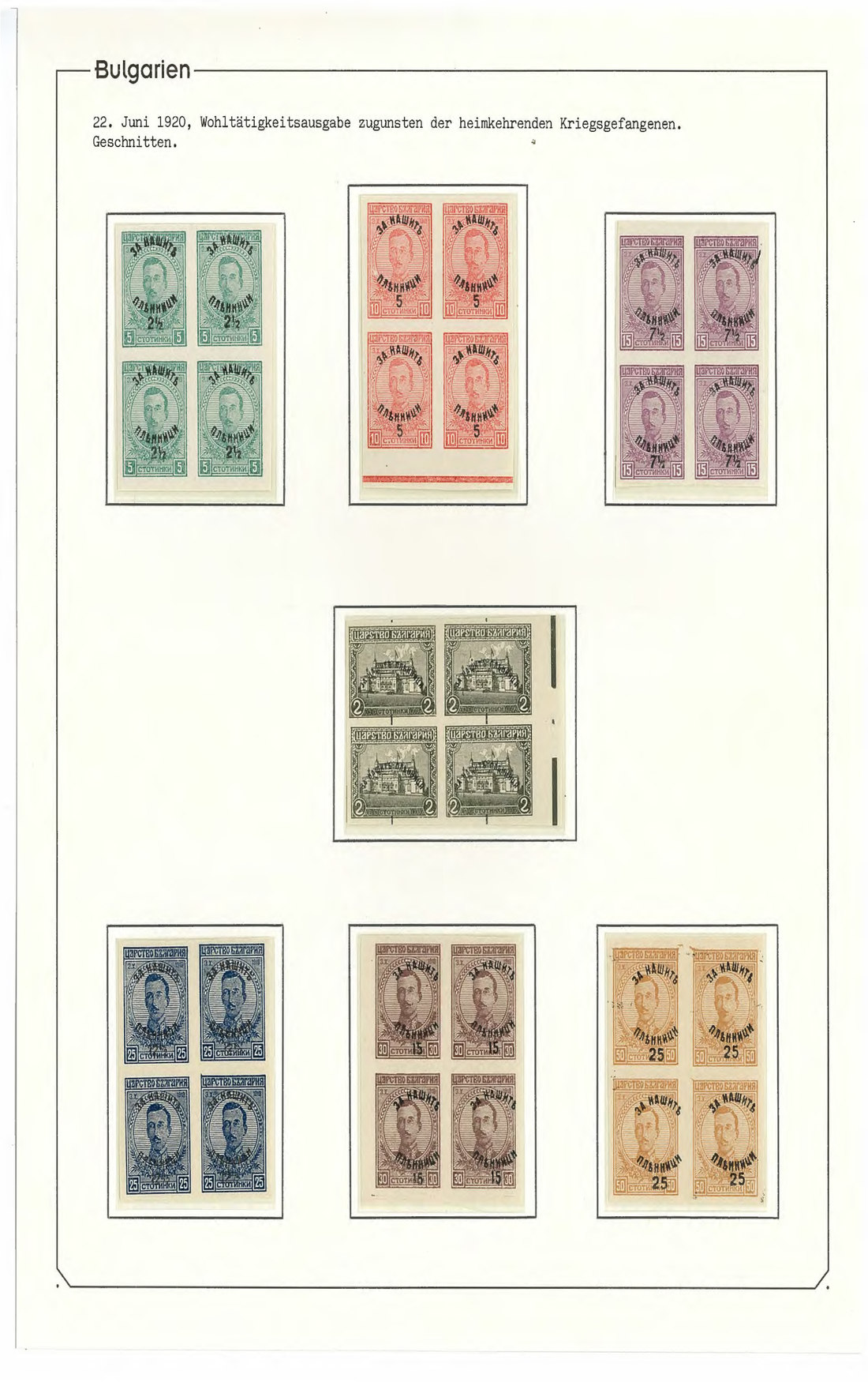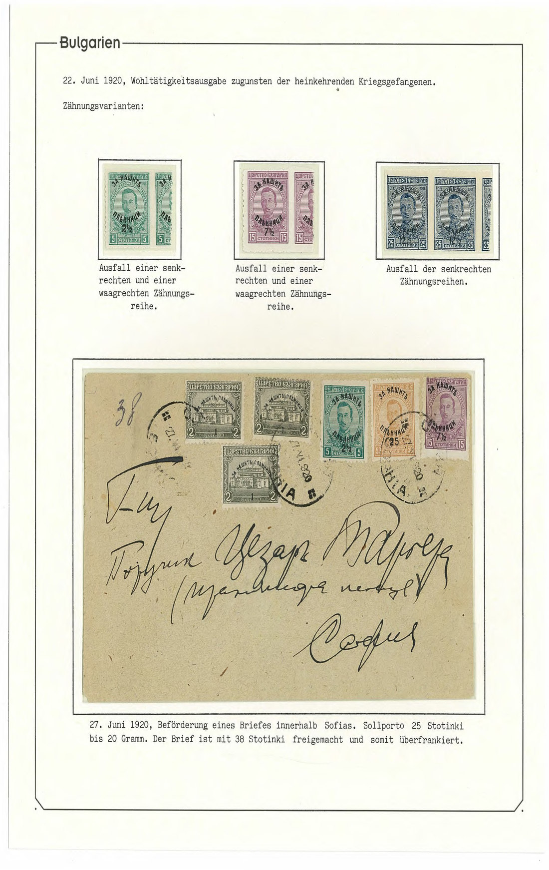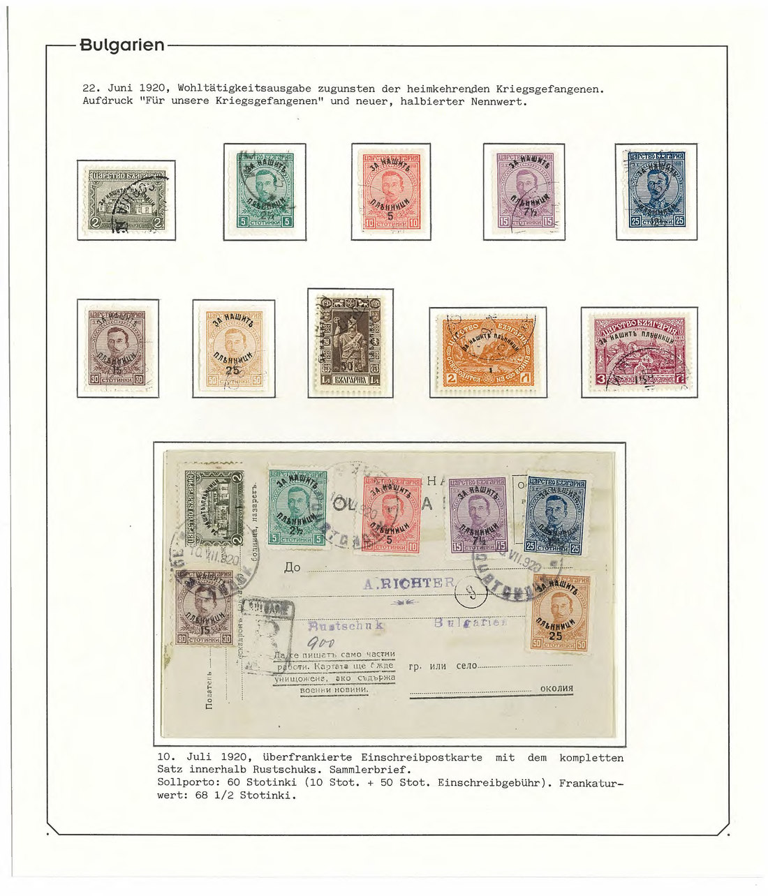 BulgariaLater Issues1920, Prisoners of War Surtax. A specialized collection containing over 400 stamps with part sheets, overprint varieties (incl. one Karaivanoff cert.) and imperforates, as well as five covers, of which one being an exceedingly rare non-philatelic usage (cert. Hitzler) and, as usually found, underfranked usages. A remarkable and very rare assembly. Mi. 135-144. Photo