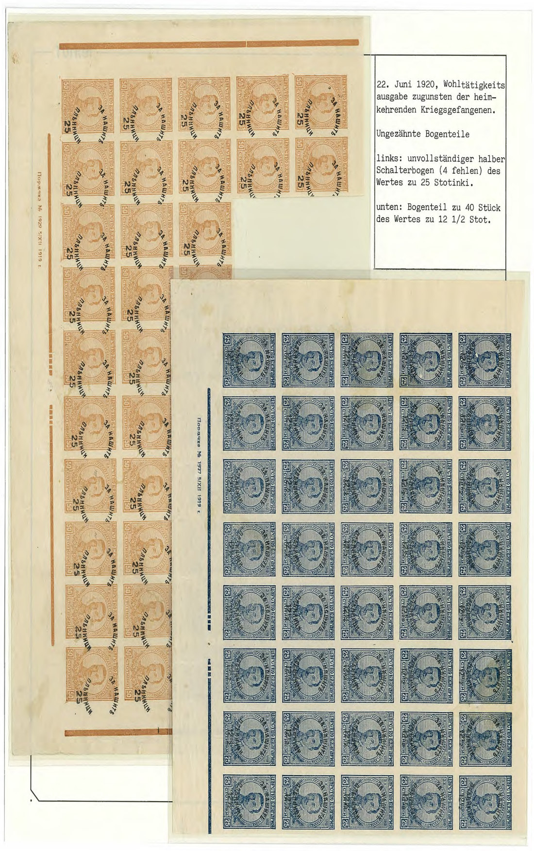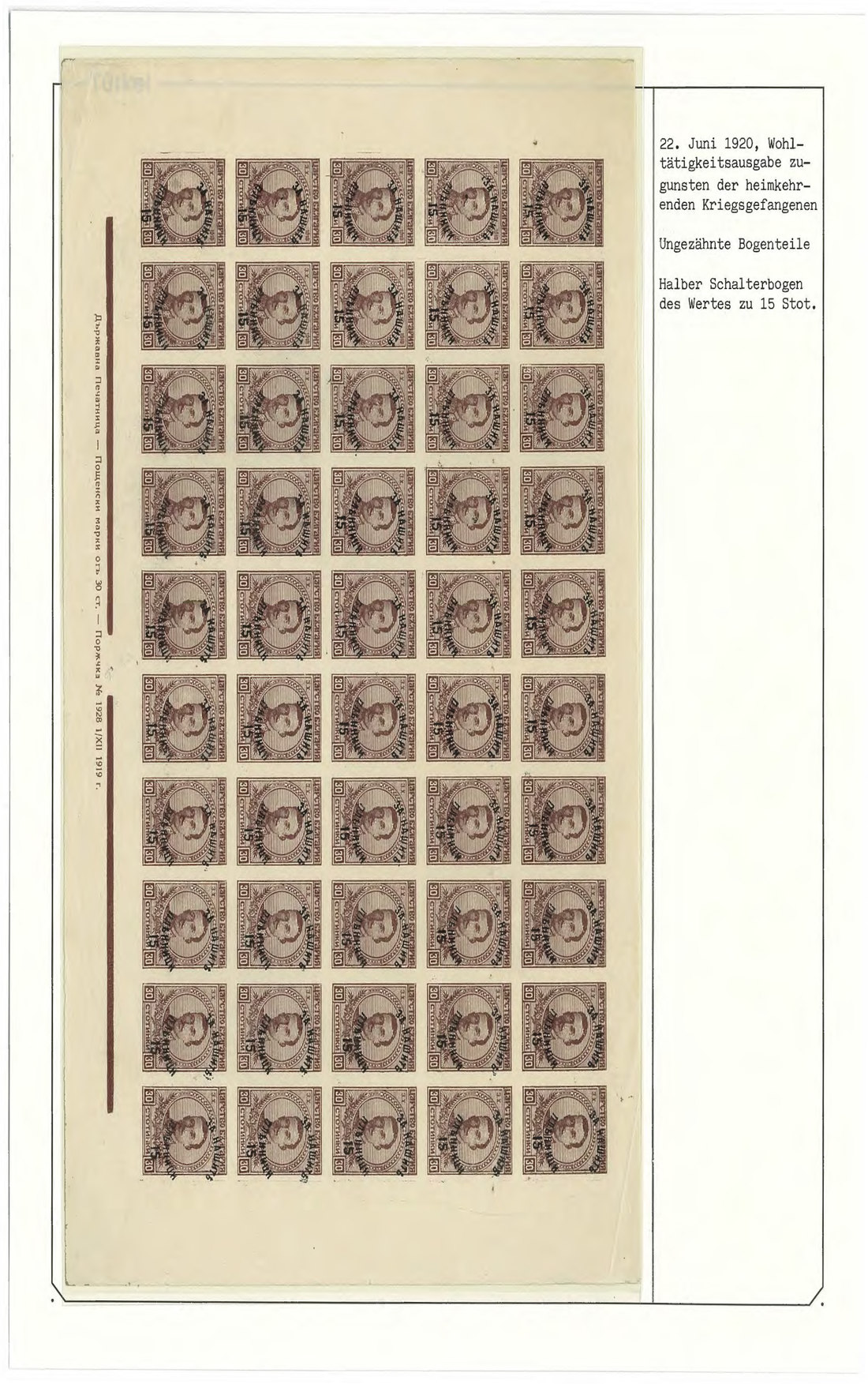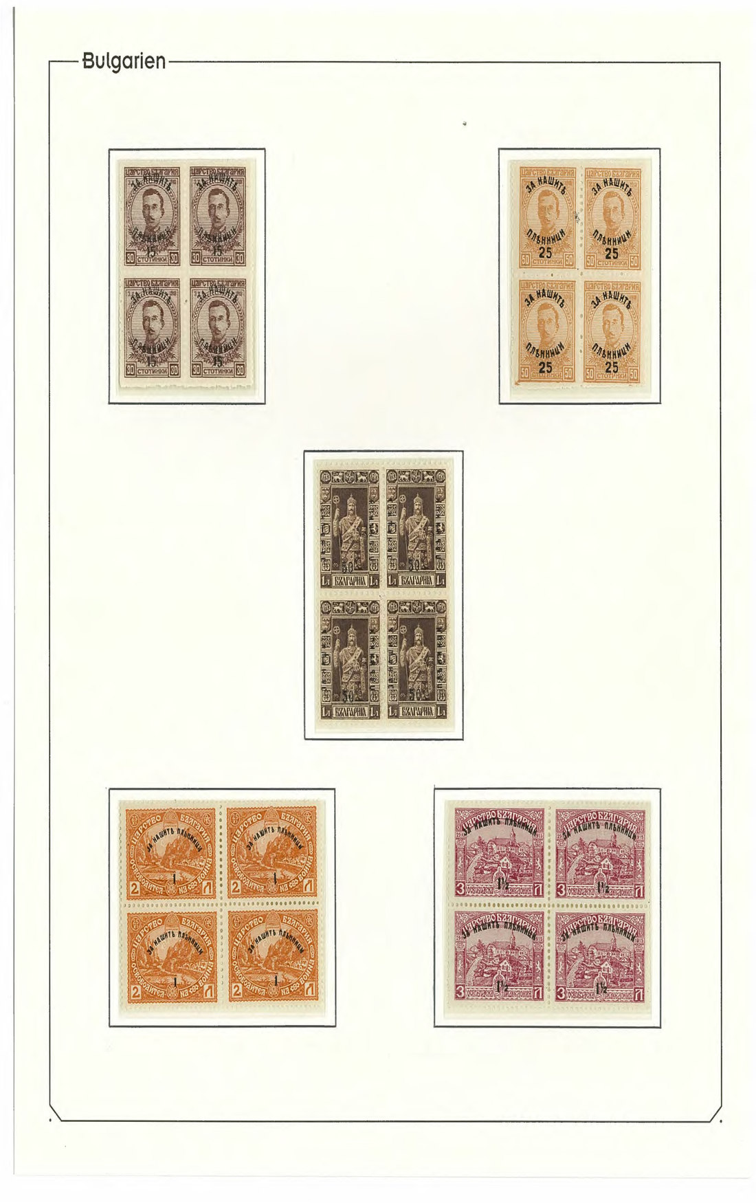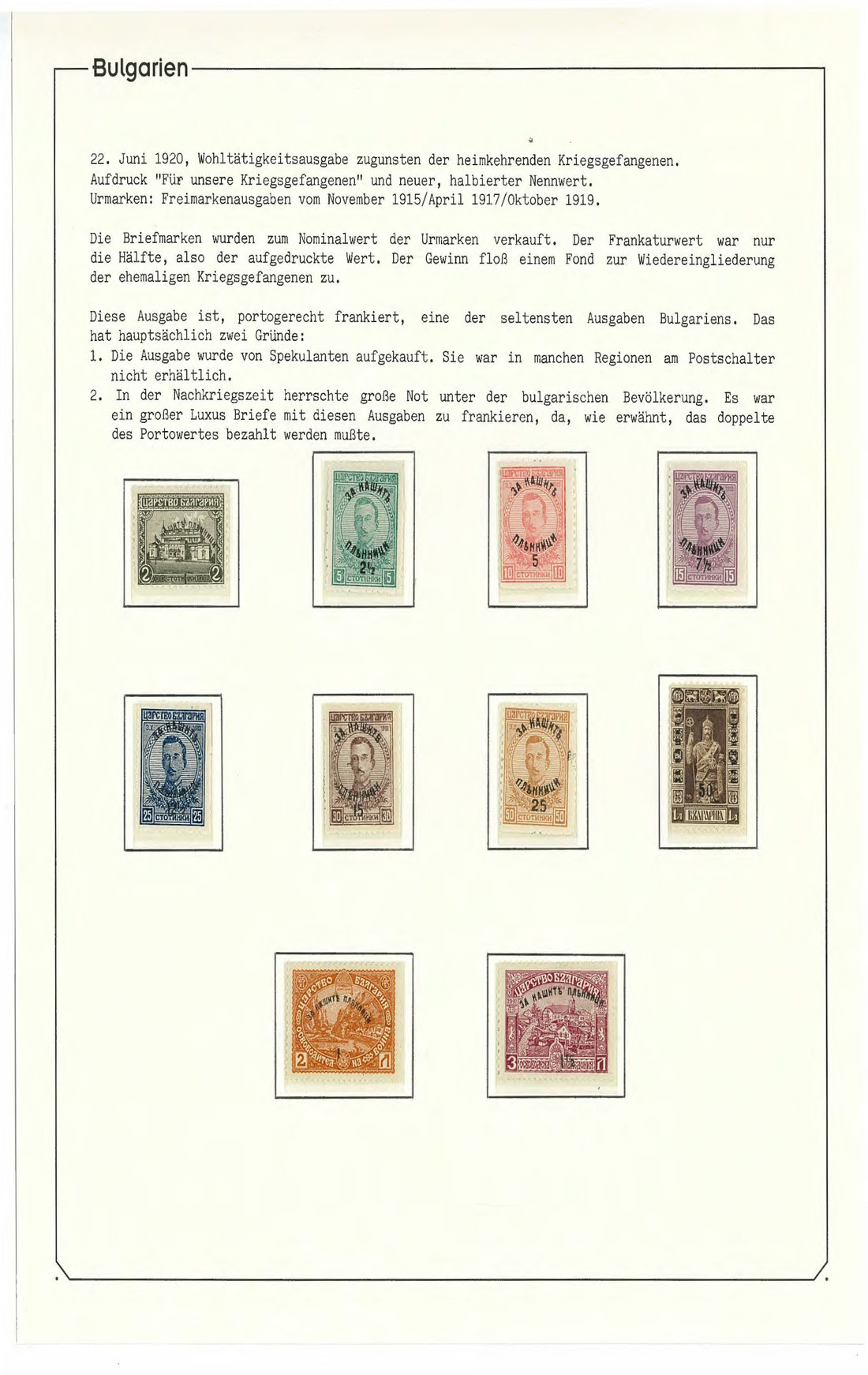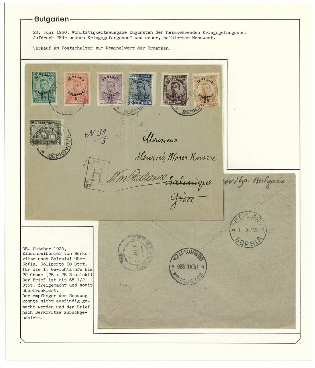 BulgariaLater Issues1920, Prisoners of War Surtax. A specialized collection containing over 400 stamps with part sheets, overprint varieties (incl. one Karaivanoff cert.) and imperforates, as well as five covers, of which one being an exceedingly rare non-philatelic usage (cert. Hitzler) and, as usually found, underfranked usages. A remarkable and very rare assembly. Mi. 135-144. Photo