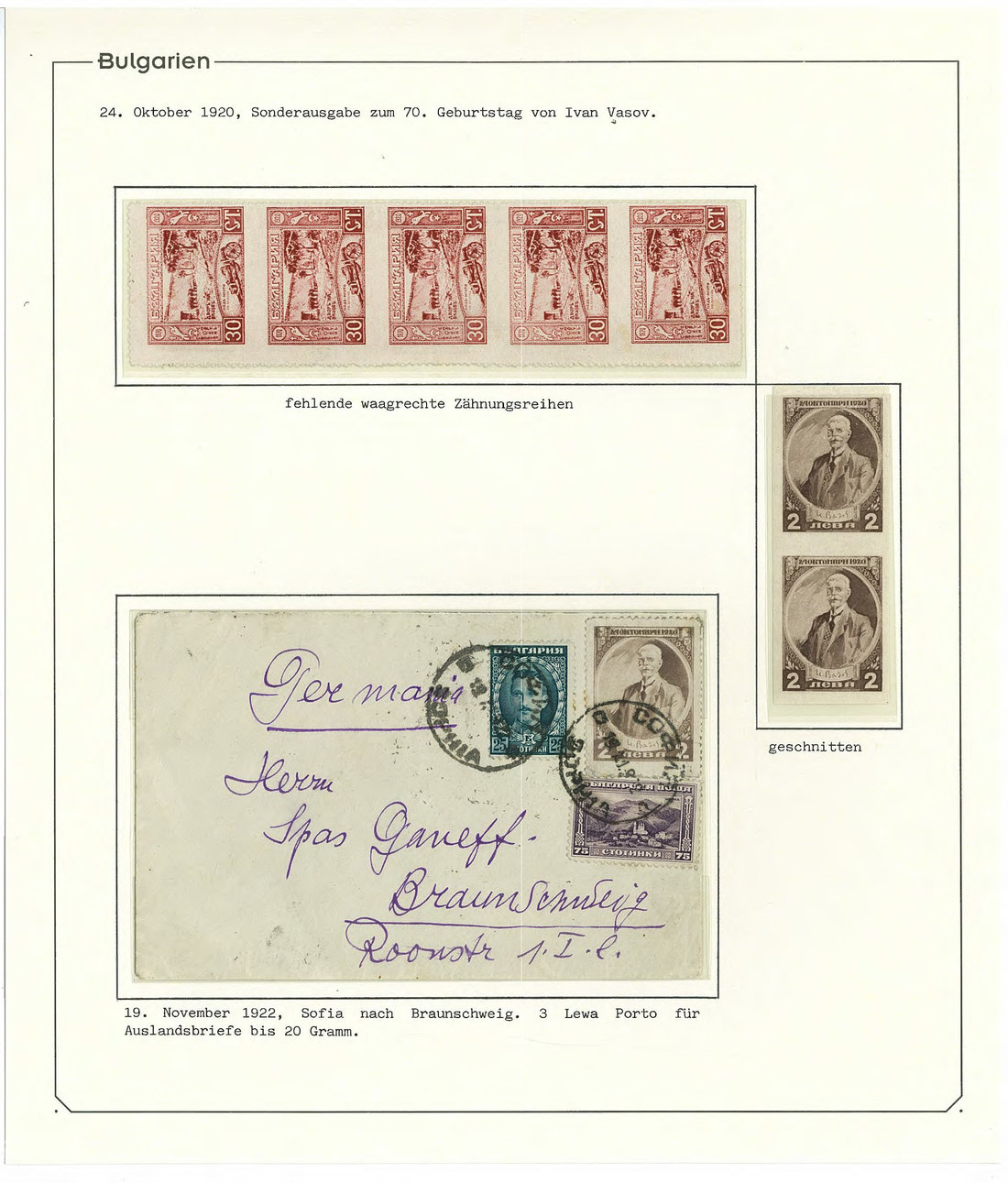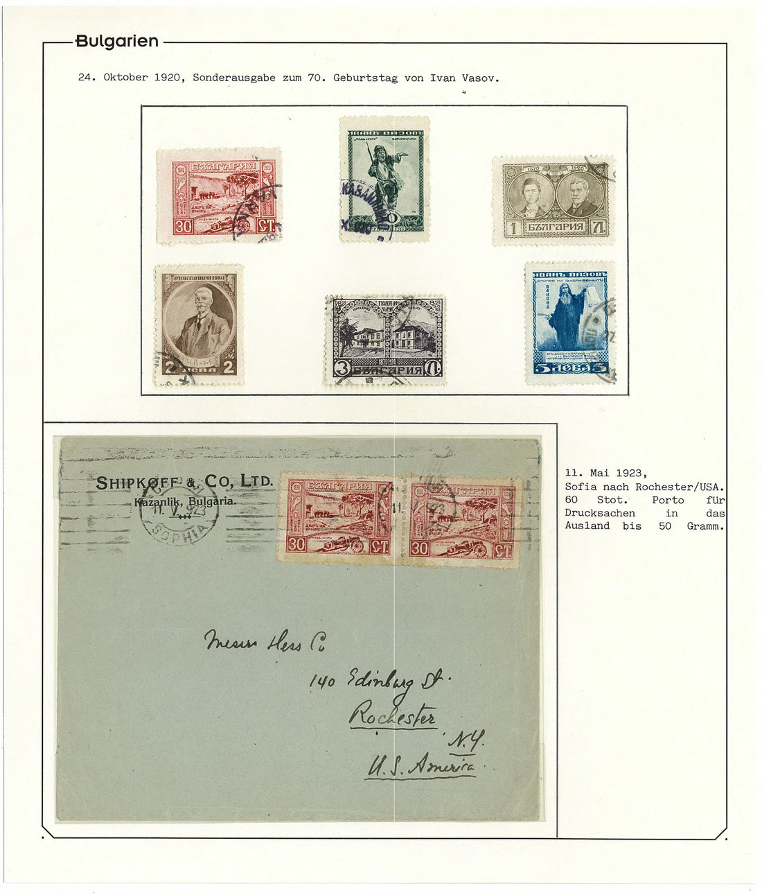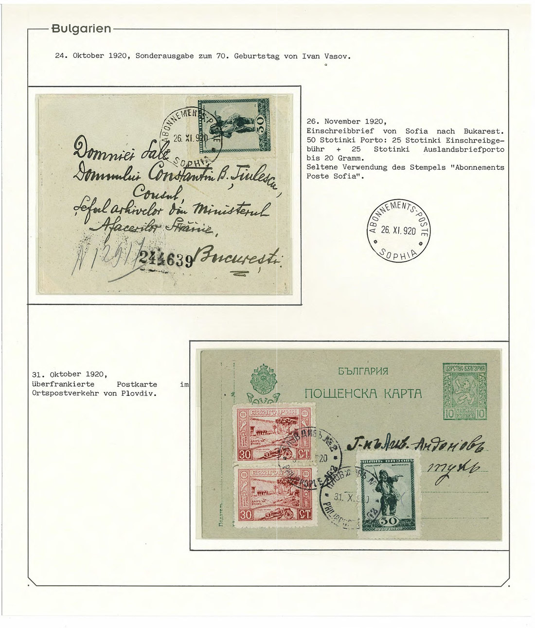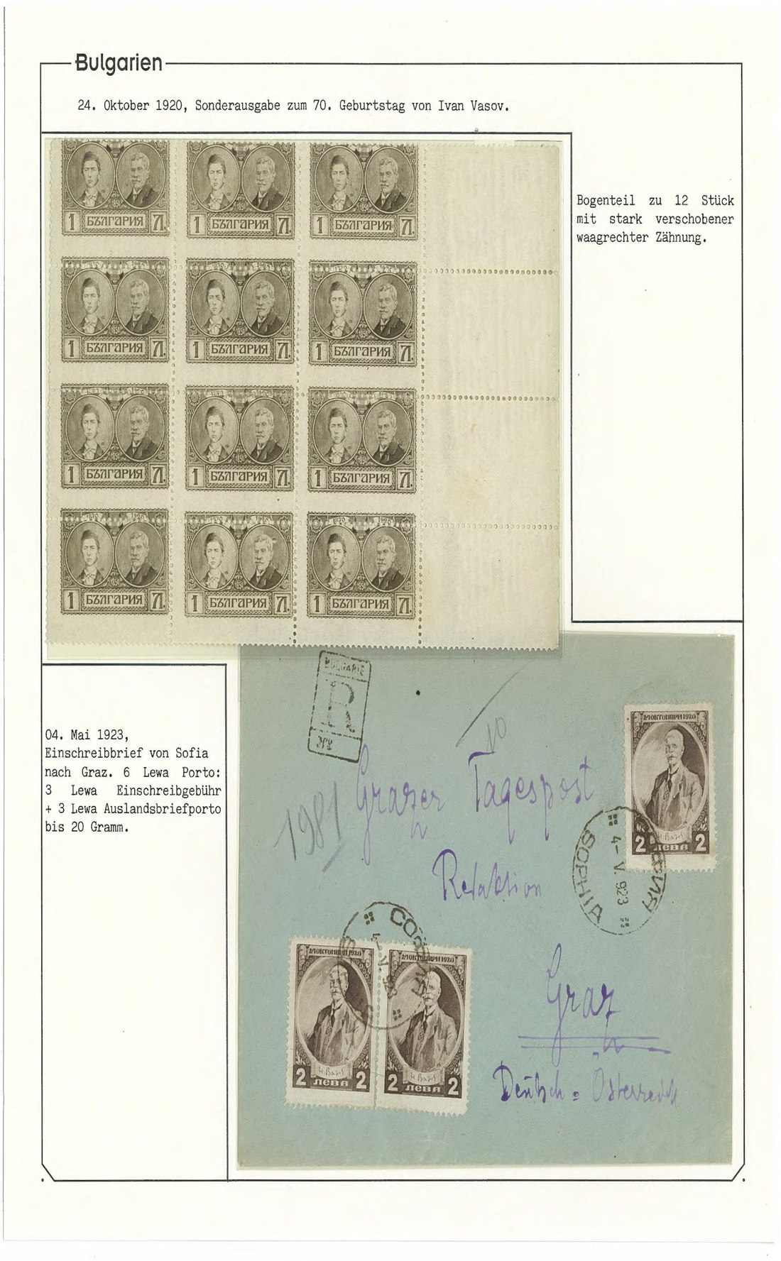 BulgariaLater Issues1920, Ivan Vasov Issue. Specialized assembly with over 100 stamps including varieties and multiples, and 18 covers, being external mail for the majority. Mi. 145-150.