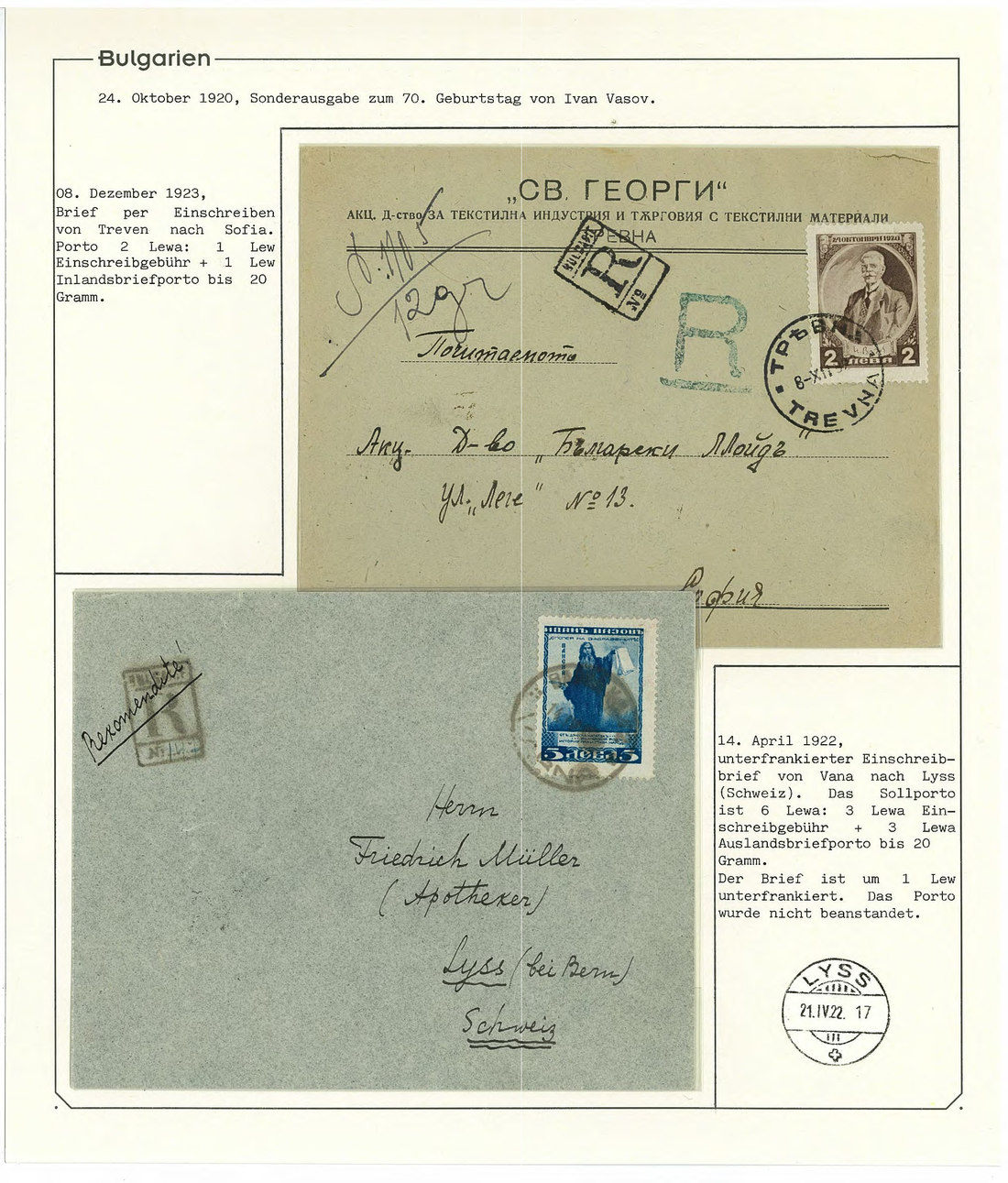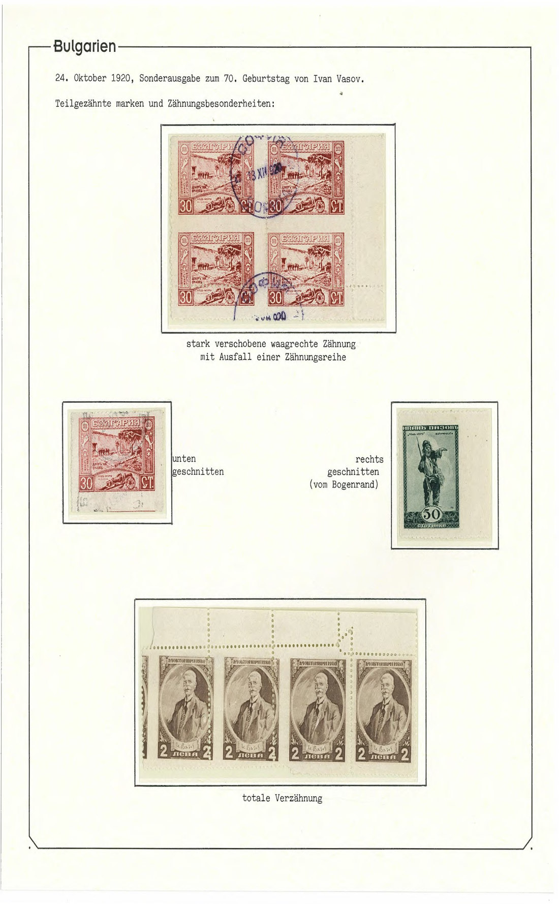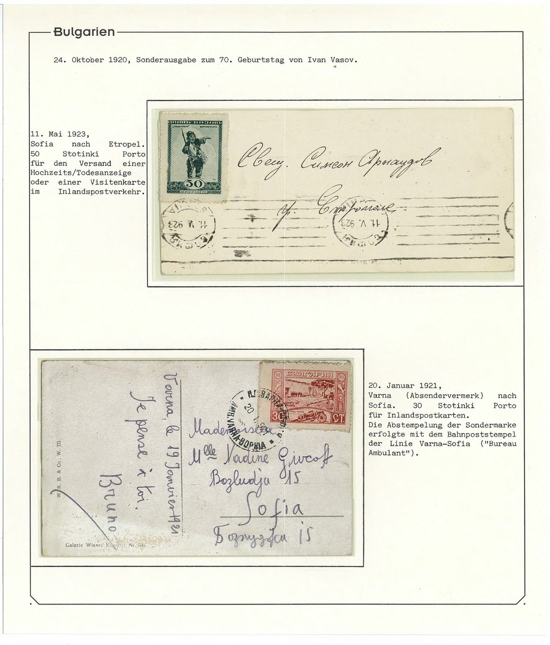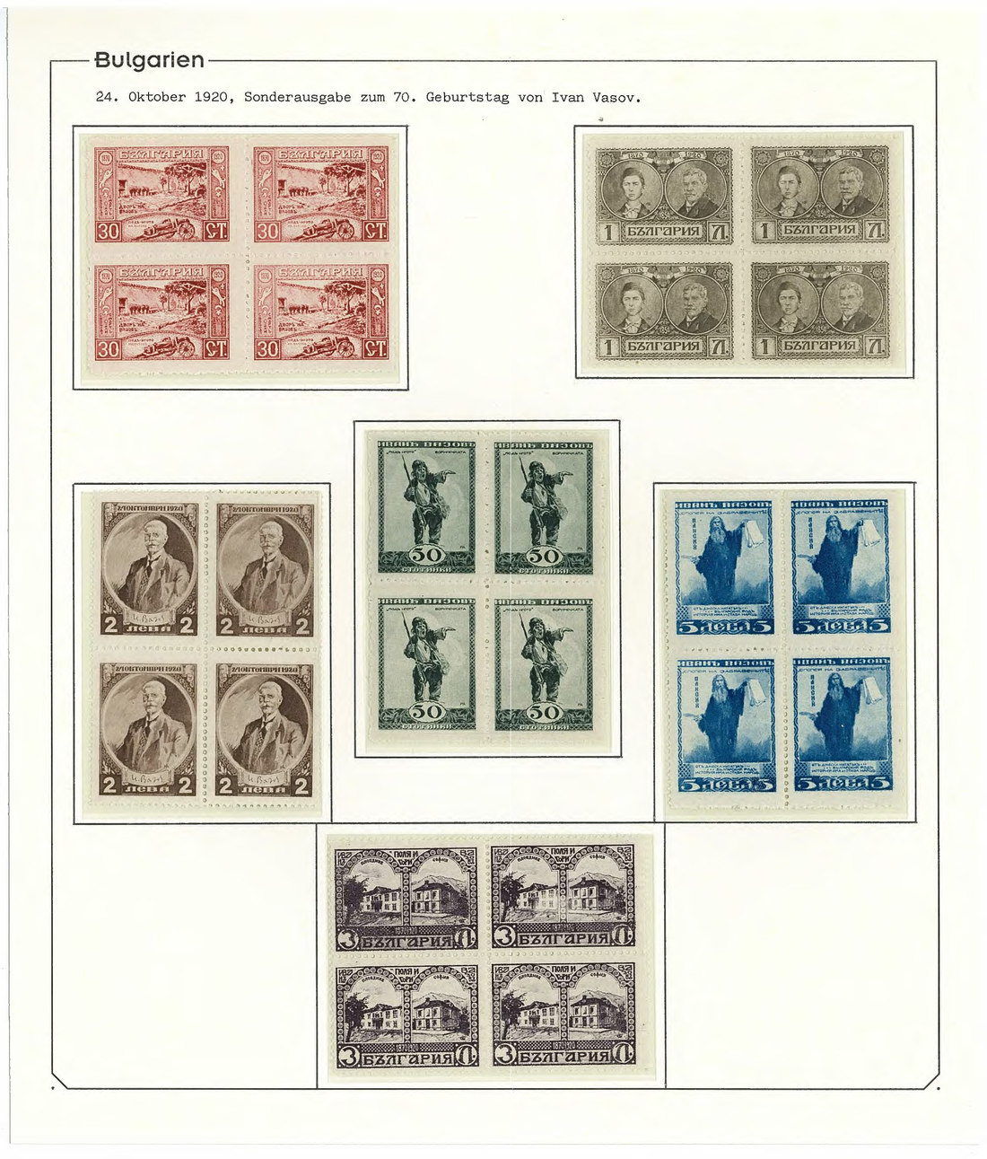 BulgariaLater Issues1920, Ivan Vasov Issue. Specialized assembly with over 100 stamps including varieties and multiples, and 18 covers, being external mail for the majority. Mi. 145-150.