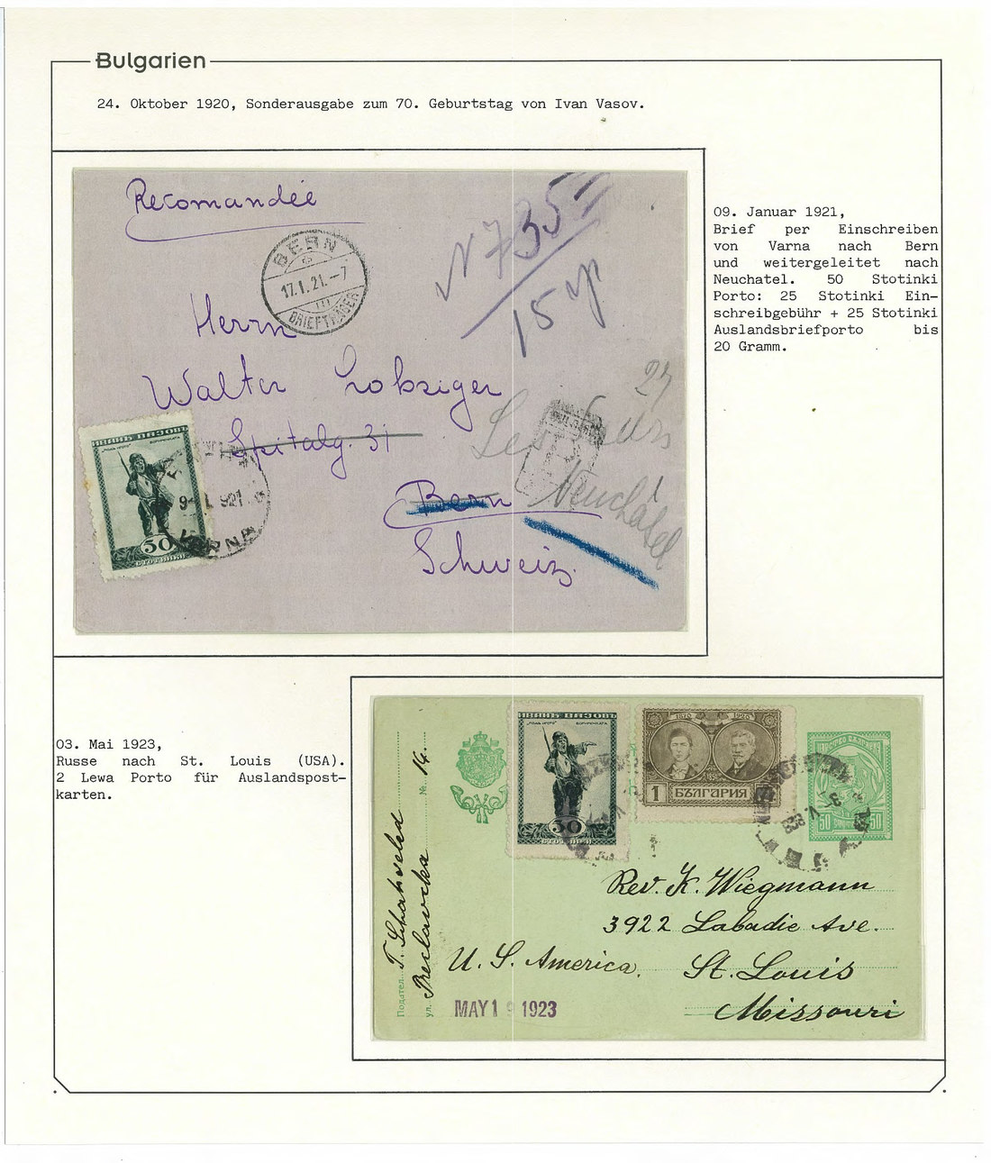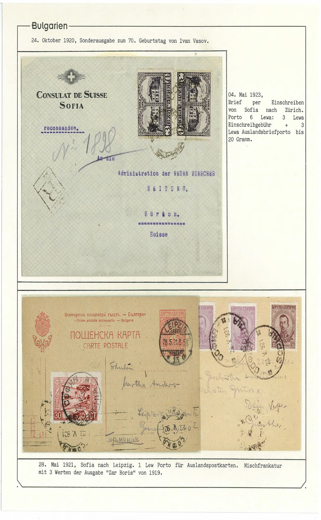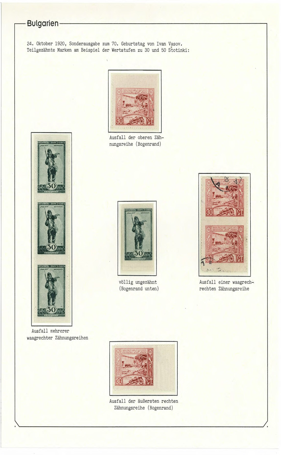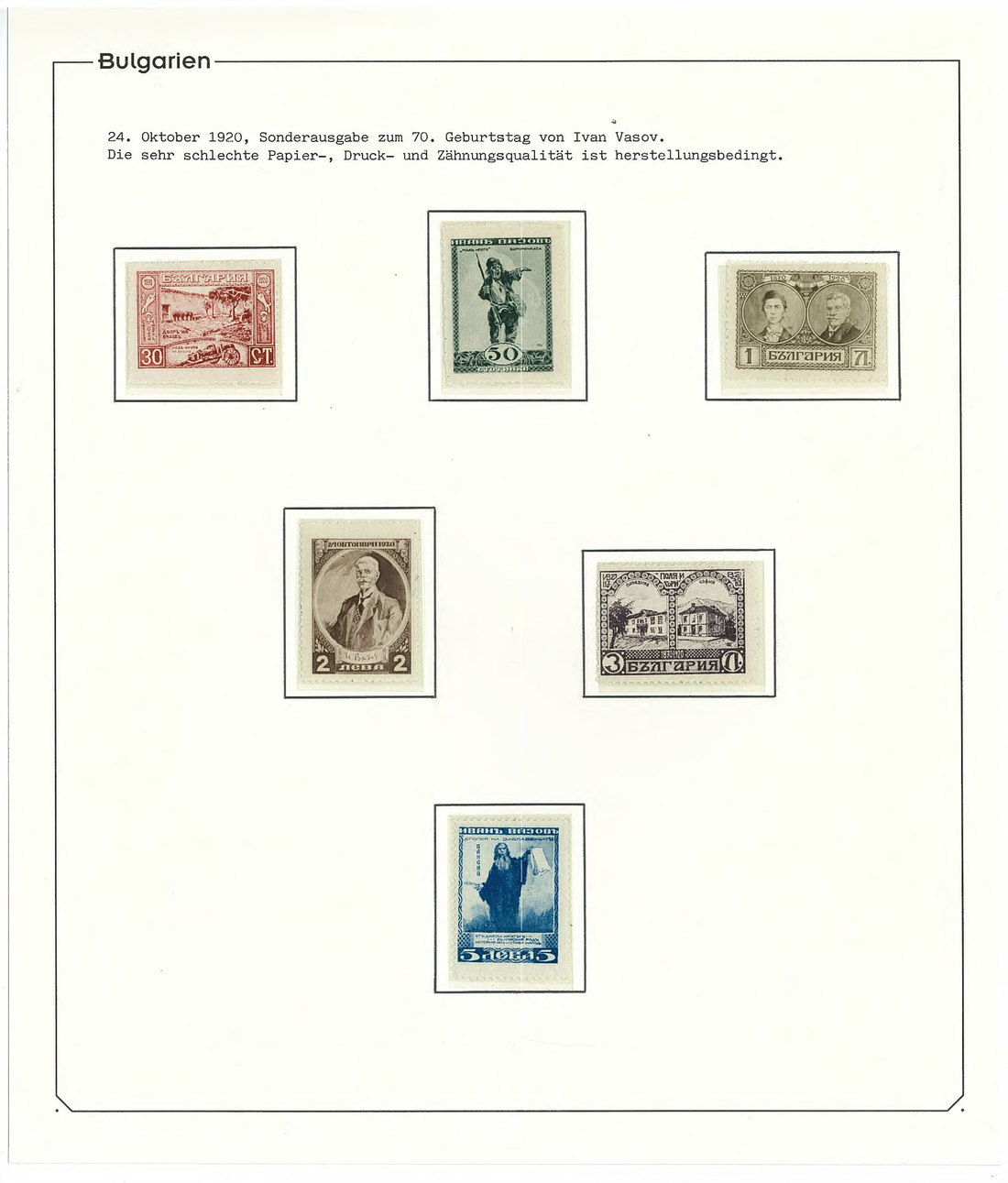 BulgariaLater Issues1920, Ivan Vasov Issue. Specialized assembly with over 100 stamps including varieties and multiples, and 18 covers, being external mail for the majority. Mi. 145-150.