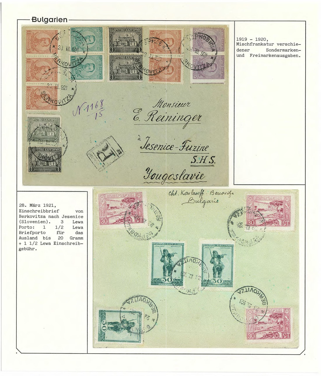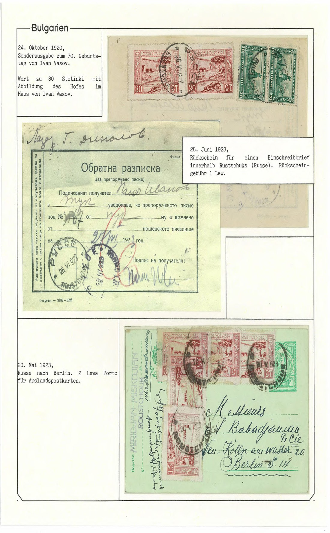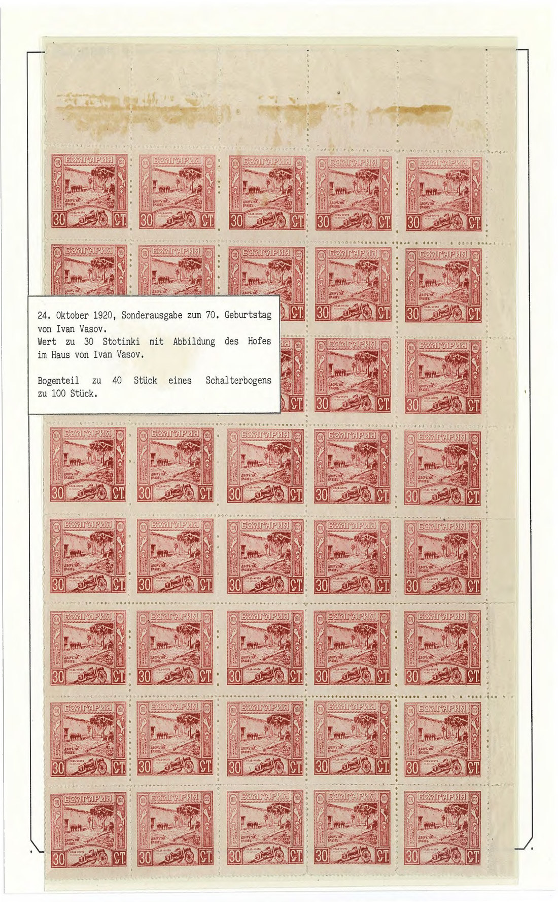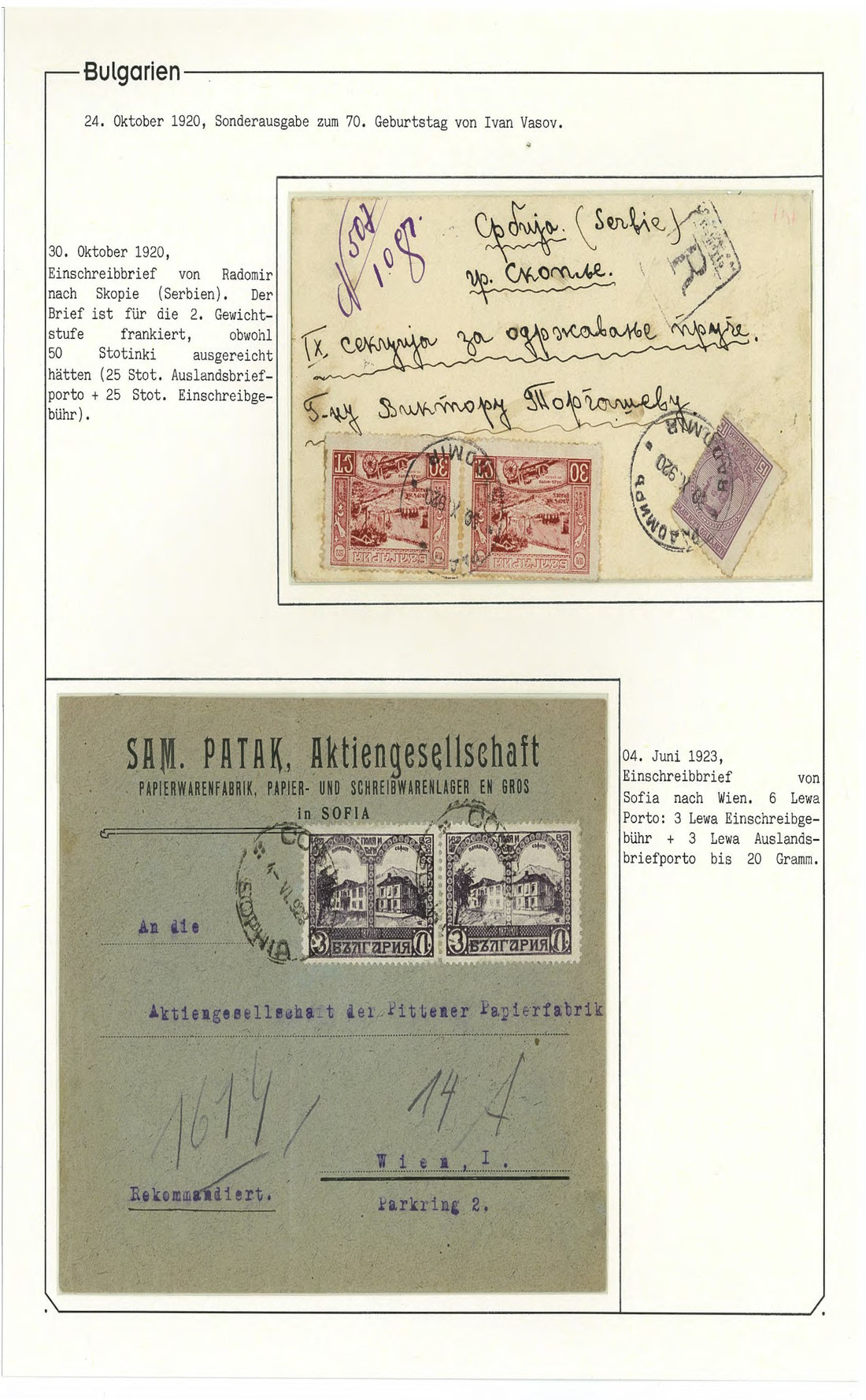 BulgariaLater Issues1920, Ivan Vasov Issue. Specialized assembly with over 100 stamps including varieties and multiples, and 18 covers, being external mail for the majority. Mi. 145-150.
