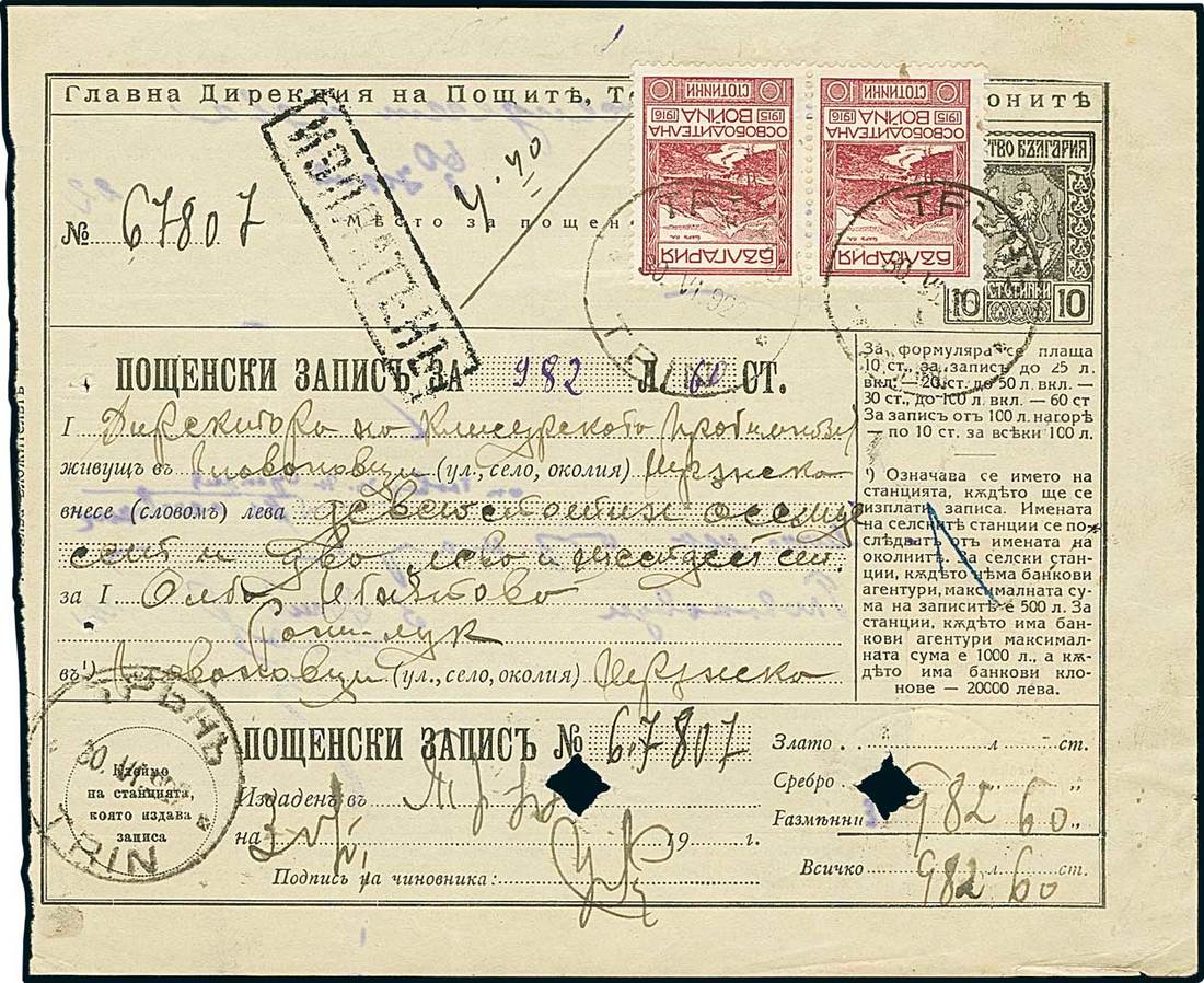 BulgariaLater Issues1921, Occupation of Macedonia, 10st. (Mt. Shar) in pair used on 30 June 1922 10st. stationery money order form from Trin to Glanovtzi, tied by c.d.s. on dispatch, with 4,40 leva being paid in cash (figure denoted in manuscript in centre at top). As a consequence of a Yugoslavian protest regarding the commemoration of the occupation of Macedonia in this issue printed in Berlin (it was intended to be sold in 1917 and was delivered in 1921), these stamps were withdrawn shortly after being into circulation, having been valid for only 17 days from 11 to 28 June 1921; this extraordinary usage, two days after the period of validity on 30 June, demonstrates that it was exceptionally accepted for internal mail -on this day, it was sent an official note to postal clerks warning them of not accepting this issue for postage-. This is one of the rarest semi-modern issues, non-philatelically used, on cover; on money order form, it represents a unique usage, further enhanced by being accepted out of the period of validity and representing the latest use recorded of this issue. Cert. Hitzler. Mi. 153. Photo