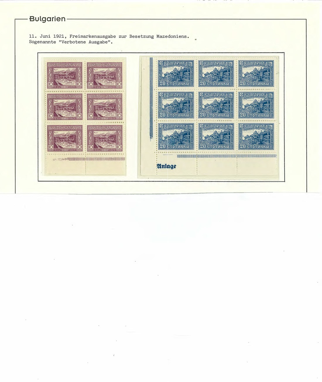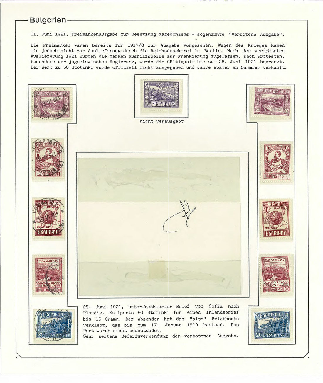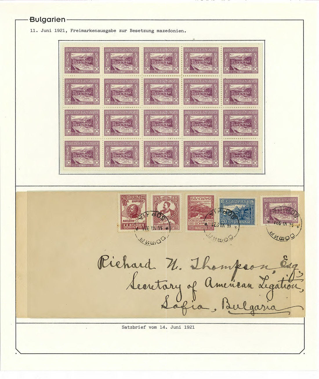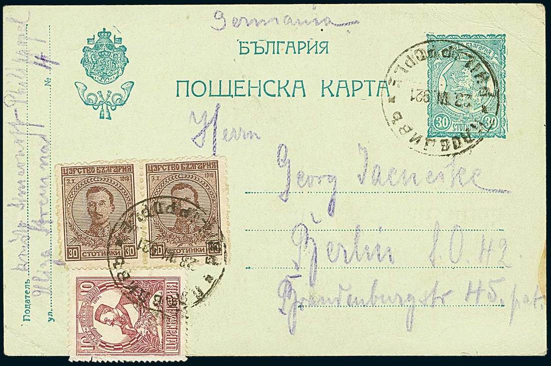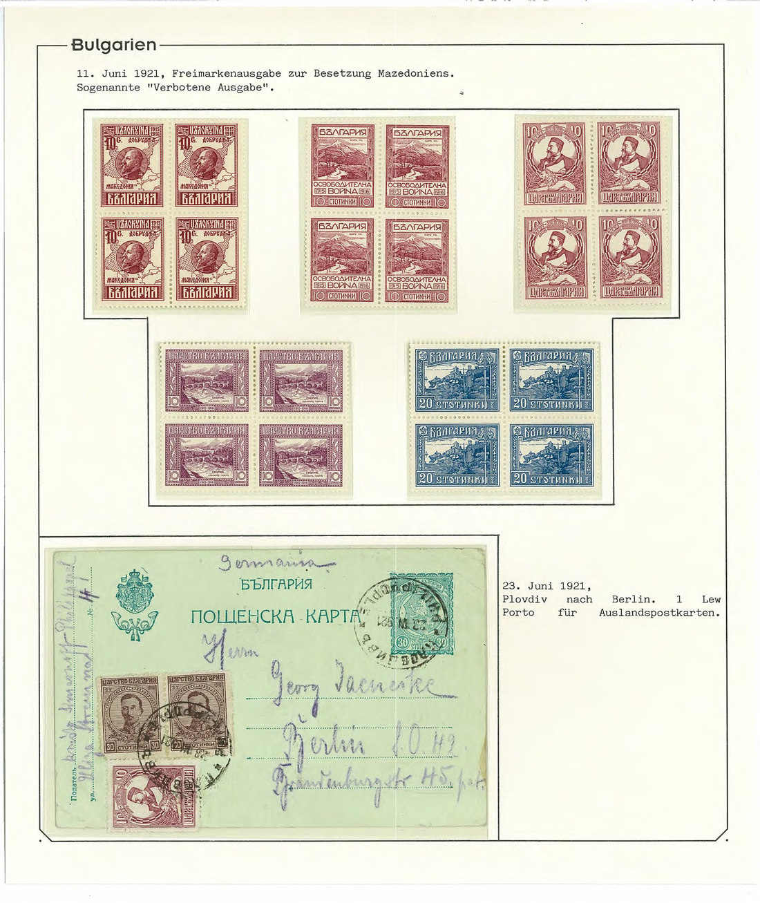 BulgariaLater Issues1921, Occupation of Macedonia Issue. A remarkable group of some stamps including multiples with marginal imprints, three philatelic covers and one exceedingly rare usage on external correspondence of 10 st. (Tsar Ferdinand) on postal stationery card with additional franking correctly paying the rate (adhesive slightly damaged in margin) with Hitzler certificate. Very desirable. Mi. 151-155. Photo