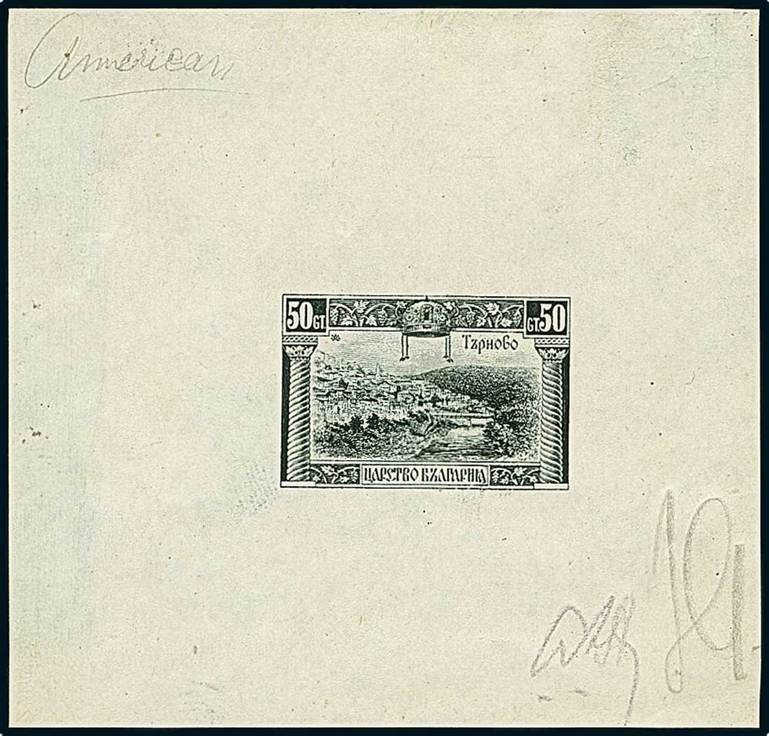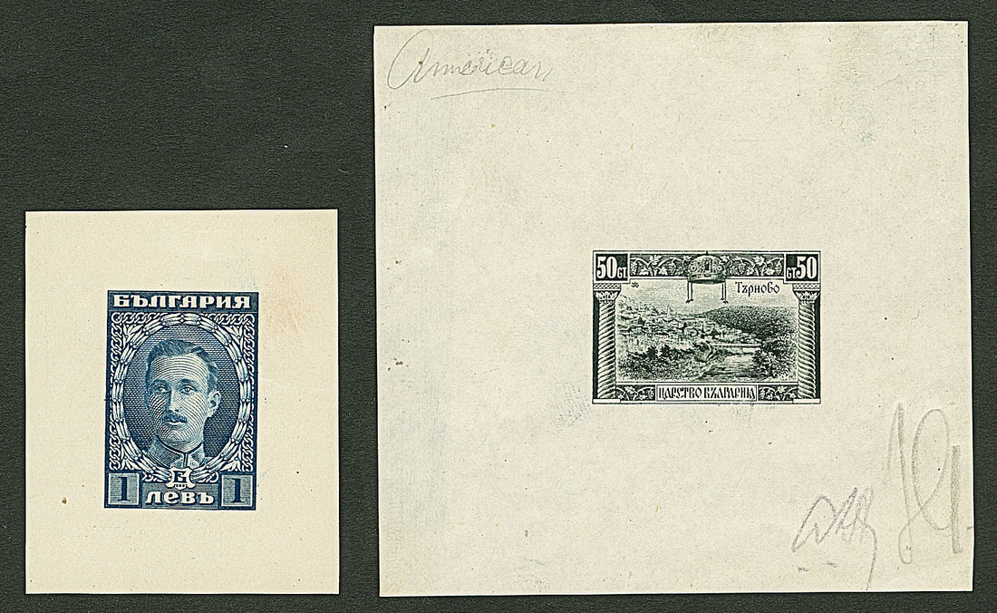 BulgariaLater Issues1921, Tirnovo and Tsar Boris III, 50st. black, initialled die proof on wove paper, marked "American", and 1l. blue engraved proof on thick card paper. A very rare and delightful duo. Popov 159PR1, 166PR1. Photo