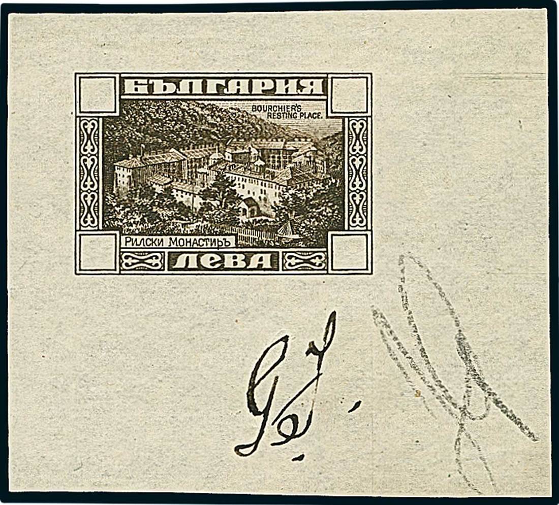 BulgariaLater Issues1921, Rila Monastery, three die proofs on wove paper in three different dark brown shades, one with blank value tablets, the others representing the 1½l. and 2l. denominations, all initialled and one marked "too heavy". A unique group. Popov E1, 172PR1, 173PR1. Photo