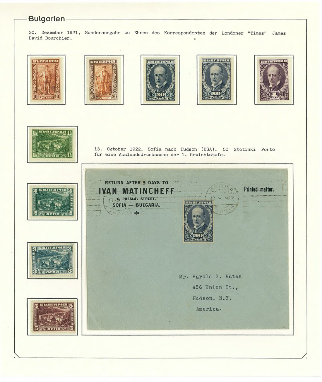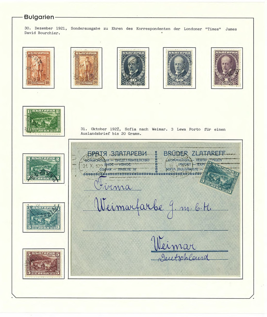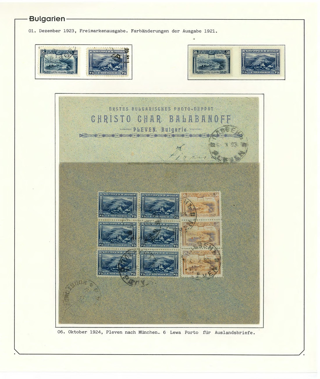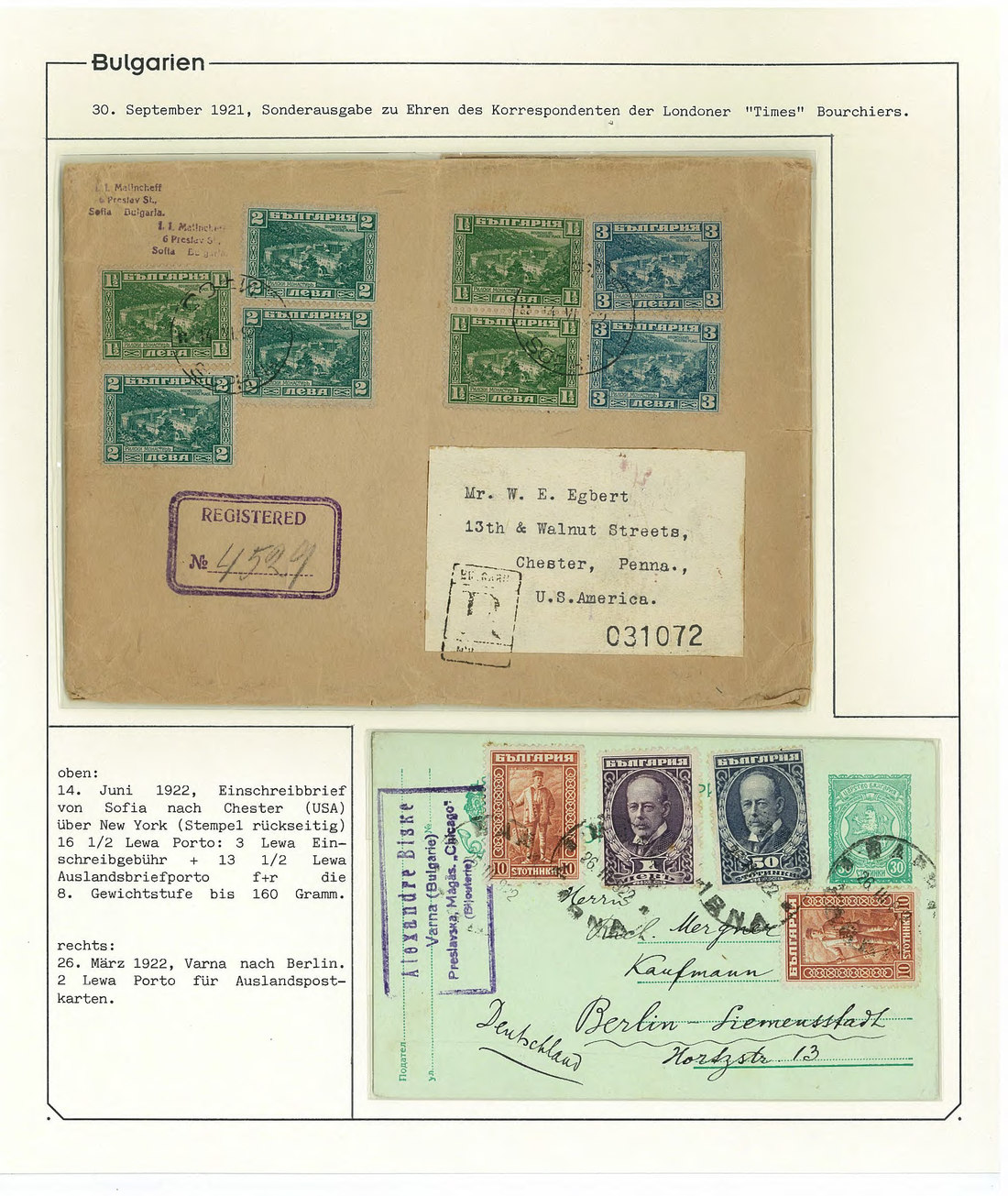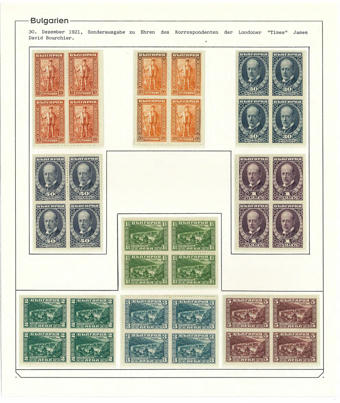 BulgariaLater Issues1921, James Borchier Issue. An attractive lot including the set in n.h. blocks of four, punched specimen pairs, Rila Monastery die proof initialled, and 17 covers sent abroad. Also the 1923 Shipka Monastery Issues with some mint multiples and one cover. Mi. 167-177.