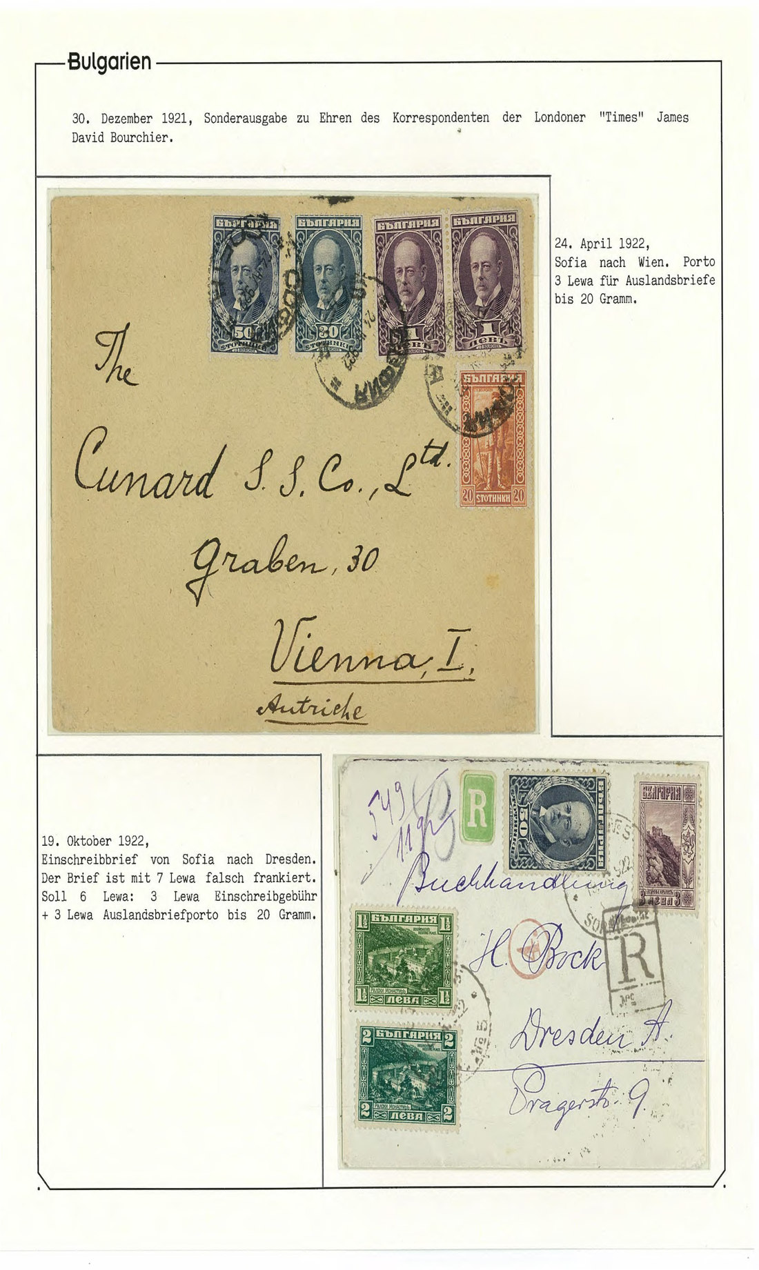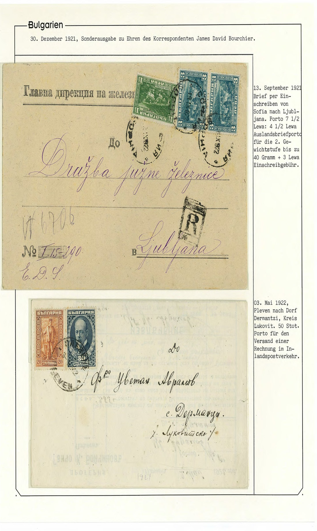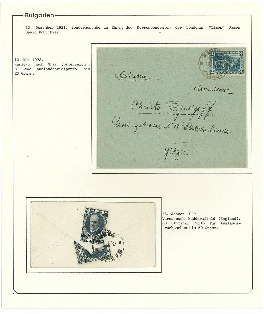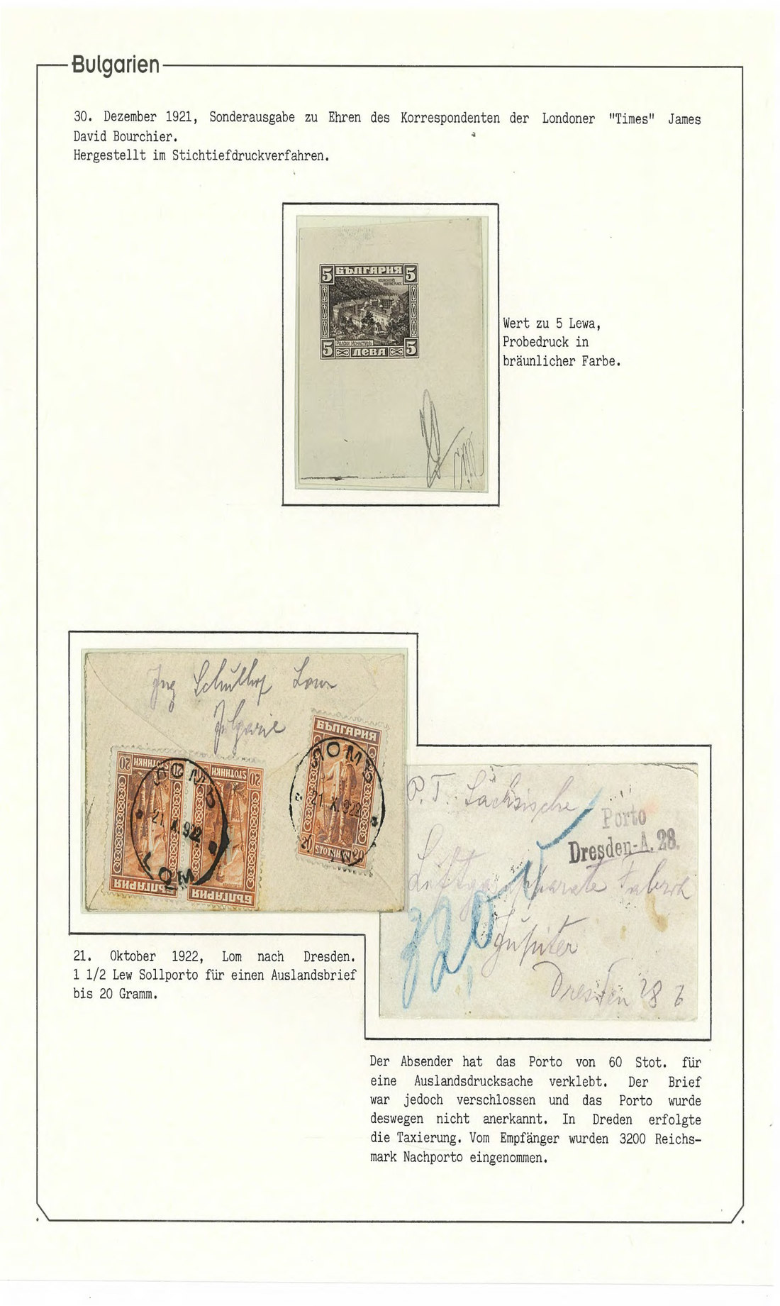 BulgariaLater Issues1921, James Borchier Issue. An attractive lot including the set in n.h. blocks of four, punched specimen pairs, Rila Monastery die proof initialled, and 17 covers sent abroad. Also the 1923 Shipka Monastery Issues with some mint multiples and one cover. Mi. 167-177.