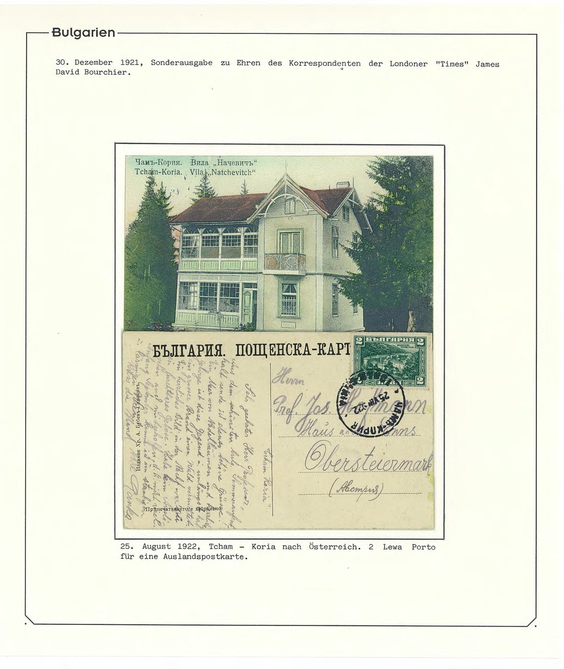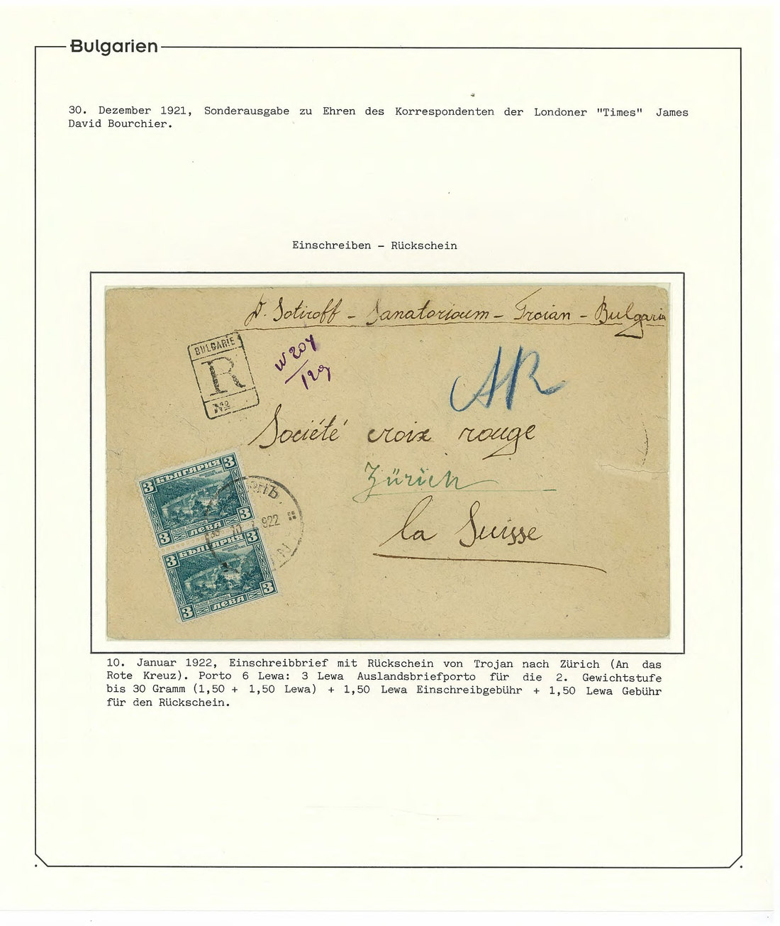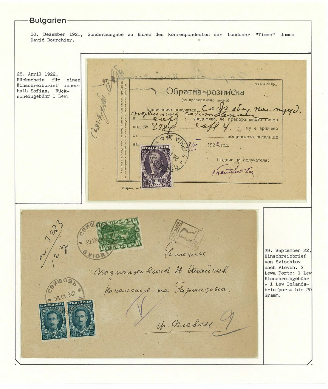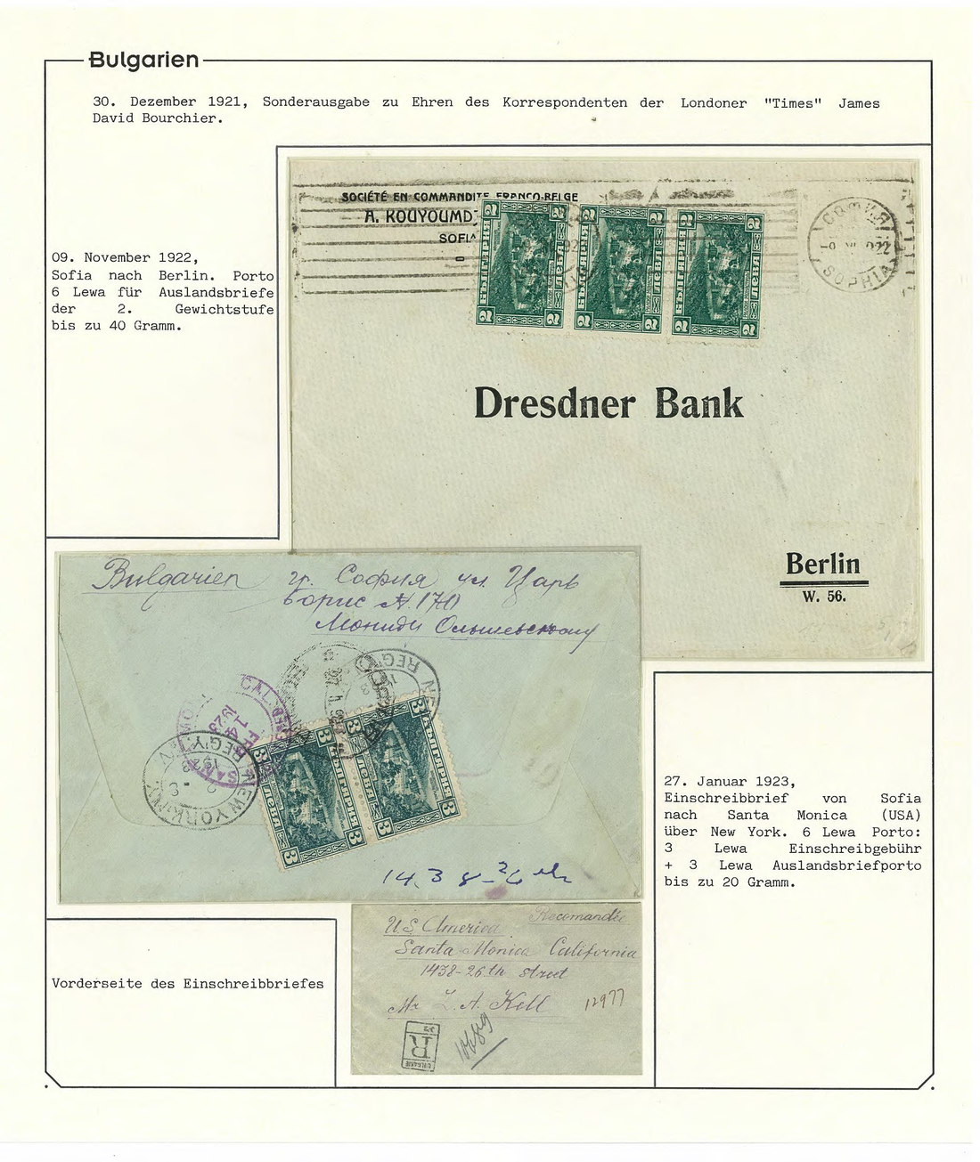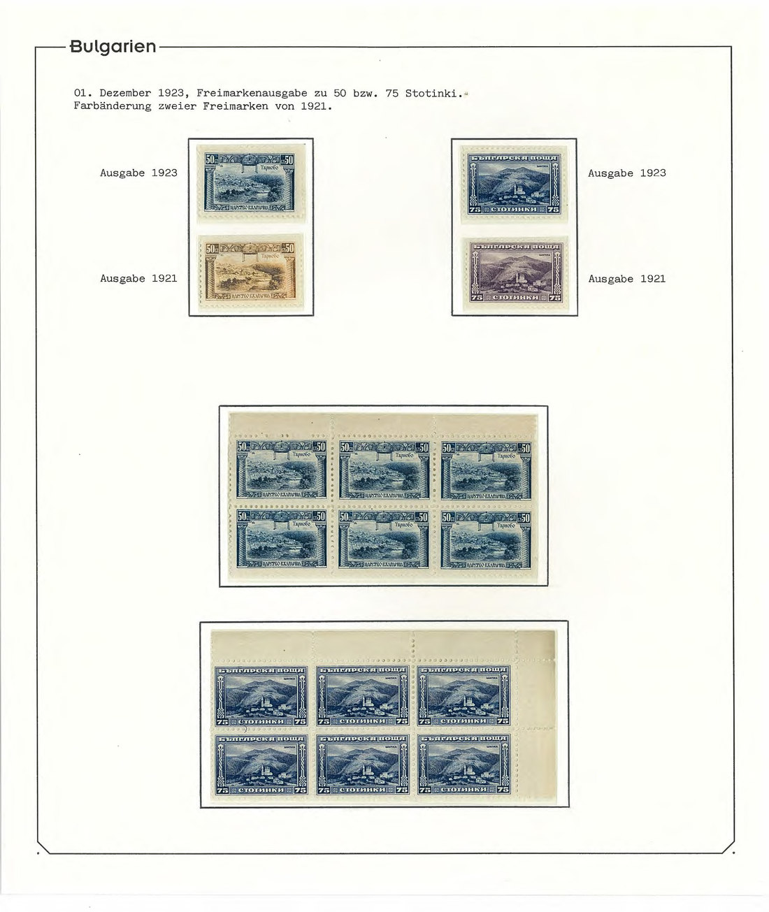 BulgariaLater Issues1921, James Borchier Issue. An attractive lot including the set in n.h. blocks of four, punched specimen pairs, Rila Monastery die proof initialled, and 17 covers sent abroad. Also the 1923 Shipka Monastery Issues with some mint multiples and one cover. Mi. 167-177.