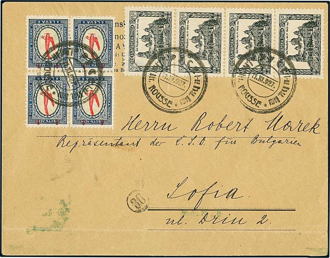 BulgariaLater Issues1927, 1l. on 6l. blue and pale yellow-olive, inverted surcharge, an extraordinary block of four, together with 1926 50st. strip of four, on 11 November 1927 cover from Ruse to Sofia, tied by bilingual "I. Post. Aér. Rousse" c.d.s., properly paying the 4 leva airmail fee and the 2 leva domestic single postage. Cover with horizontal crease at base of absolutely no significance and mentioned for correctness. The great gem of airmail Bulgarian stamps, being one of just two covers recorded exhibiting the "inverted surcharge" variety in block of four. A world and sought-after rarity of airmail philately. Cert. Hitzler. (Unlisted in Michel); Popov 206AK1. Photo