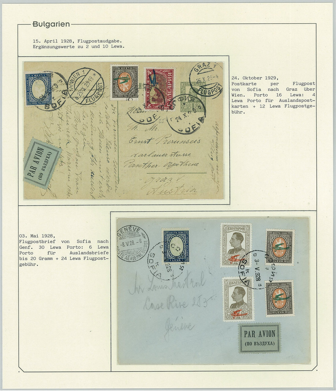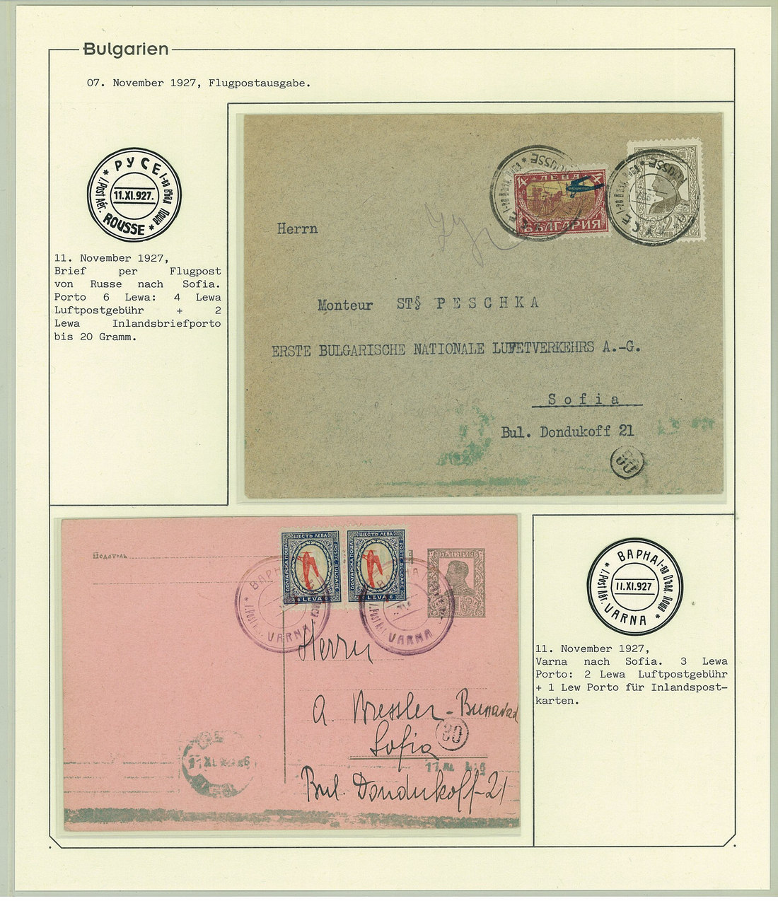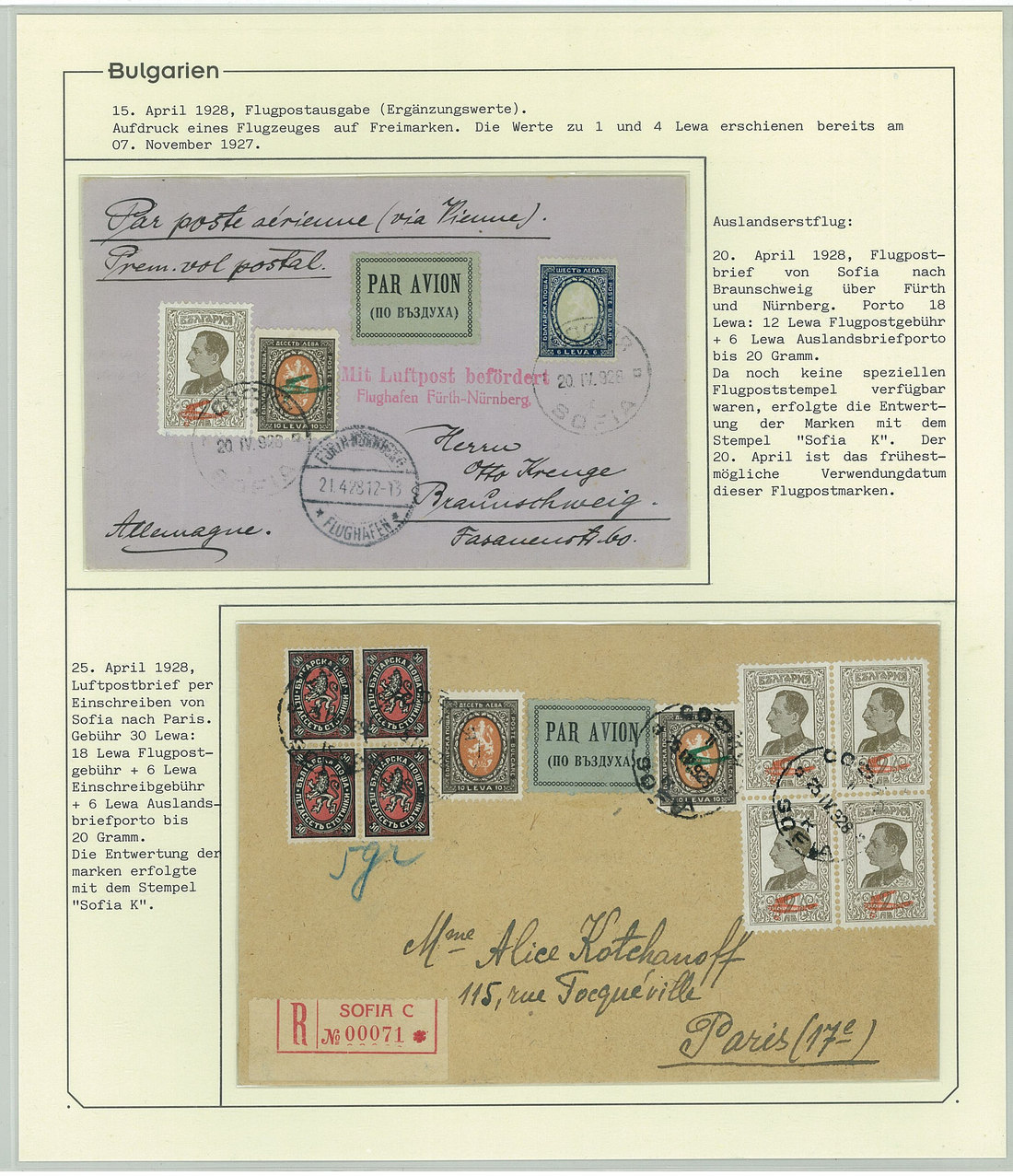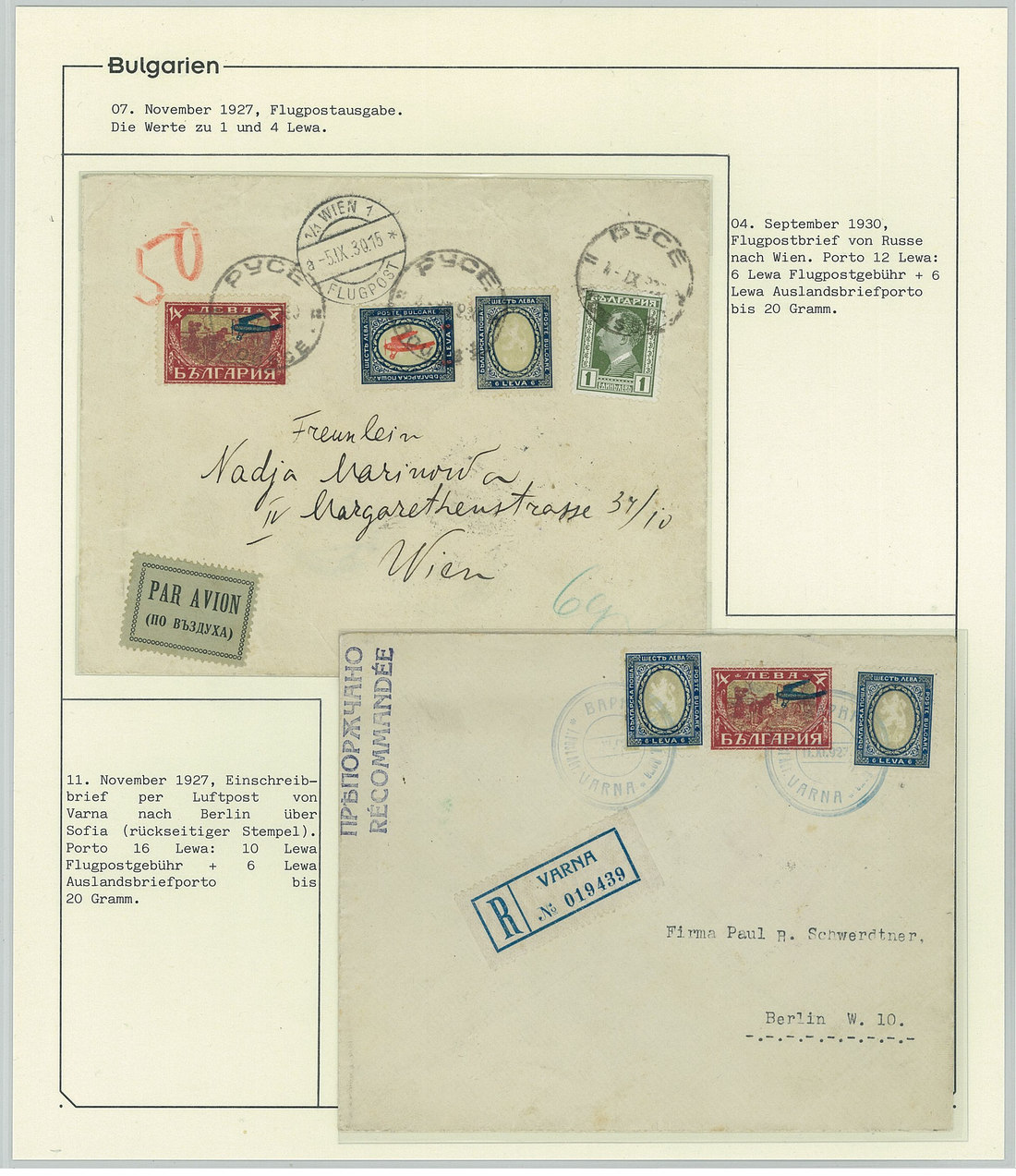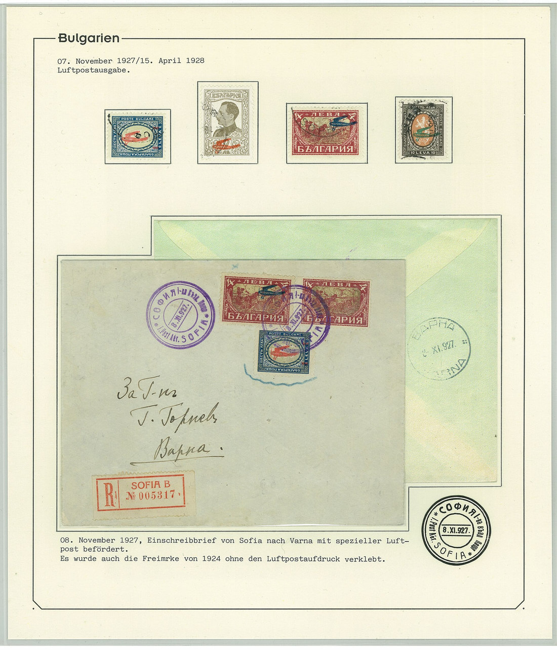 BulgariaLater Issues1927-28, Airmail Issues. An interesting collection with rare 1927-28 official publication featuring scheduled flights and postal rates, stamps with few varieties and 35 covers, mainly being airmails to foreign destinations including unusual examples such as Turkey. Mi. 206-209, I-III.