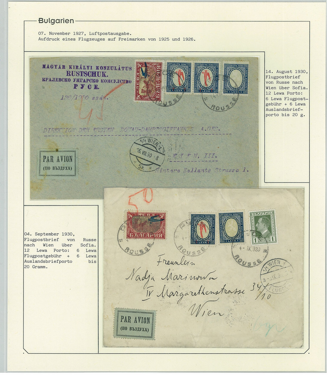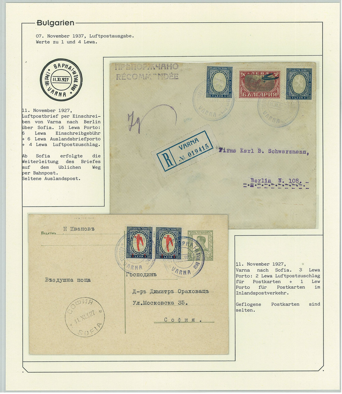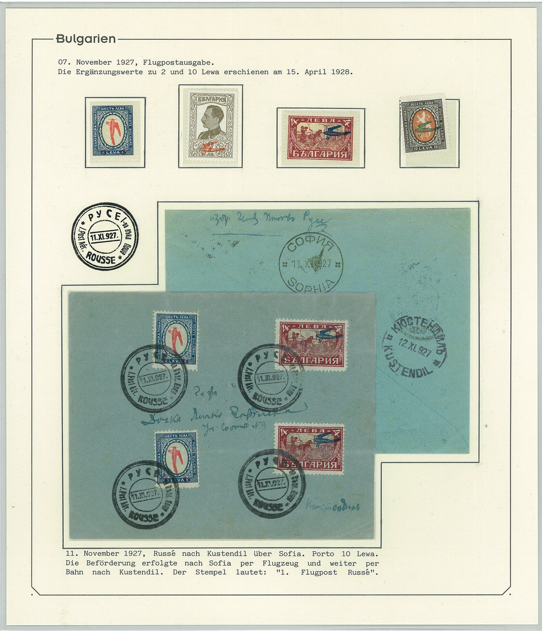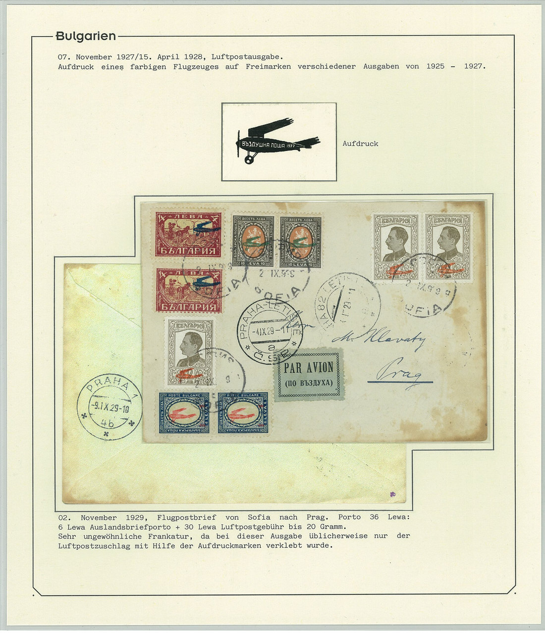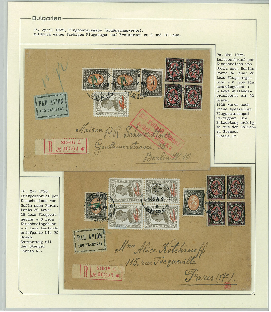 BulgariaLater Issues1927-28, Airmail Issues. An interesting collection with rare 1927-28 official publication featuring scheduled flights and postal rates, stamps with few varieties and 35 covers, mainly being airmails to foreign destinations including unusual examples such as Turkey. Mi. 206-209, I-III.
