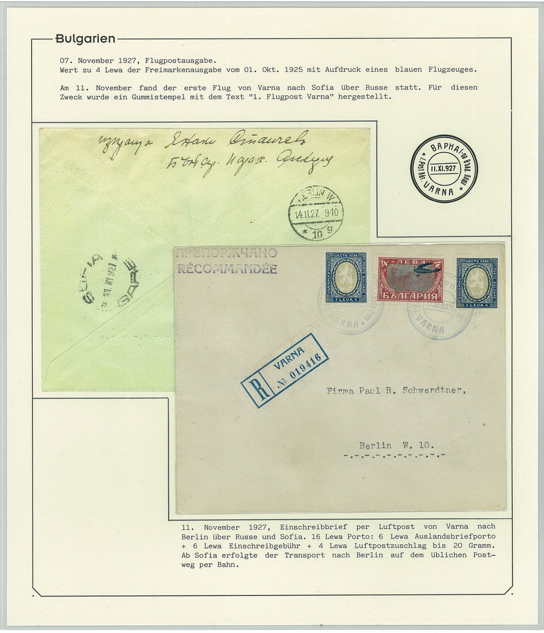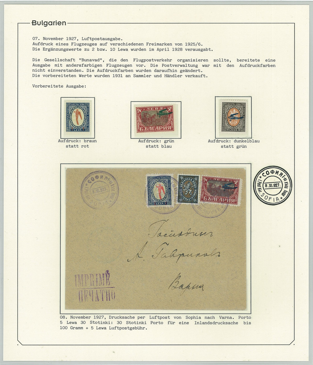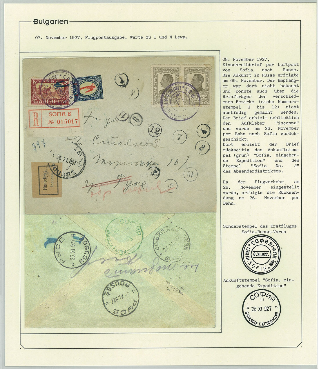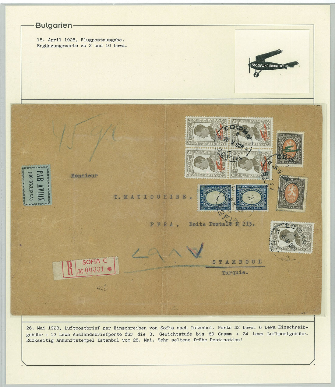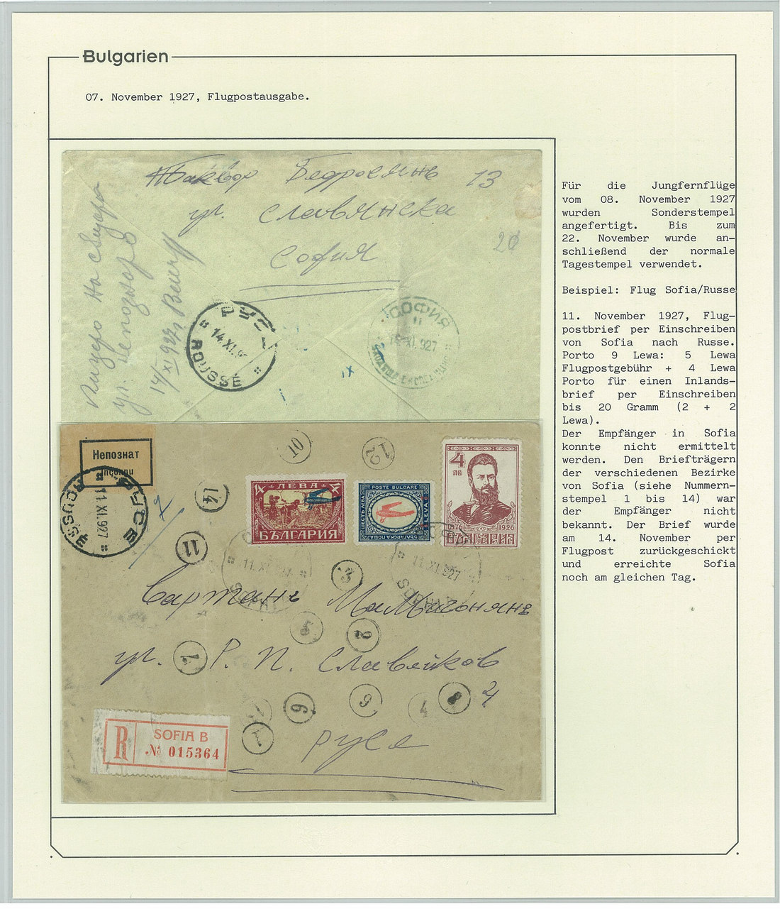 BulgariaLater Issues1927-28, Airmail Issues. An interesting collection with rare 1927-28 official publication featuring scheduled flights and postal rates, stamps with few varieties and 35 covers, mainly being airmails to foreign destinations including unusual examples such as Turkey. Mi. 206-209, I-III.