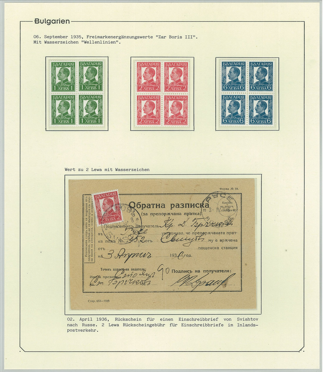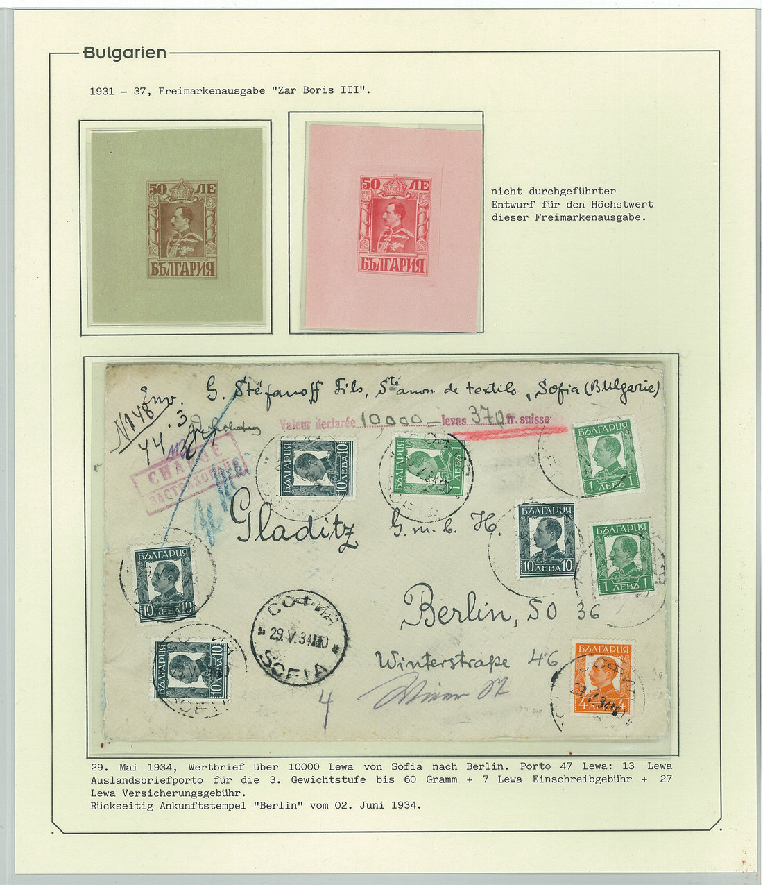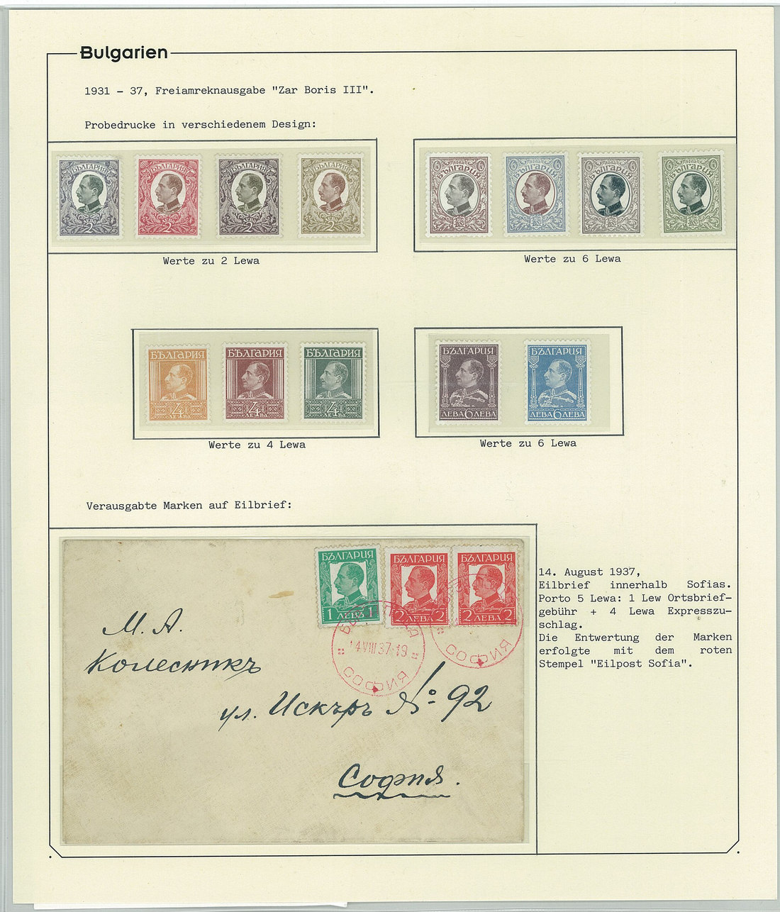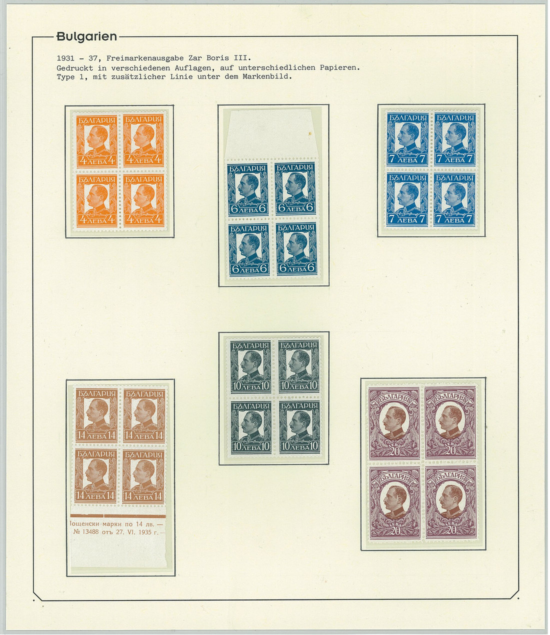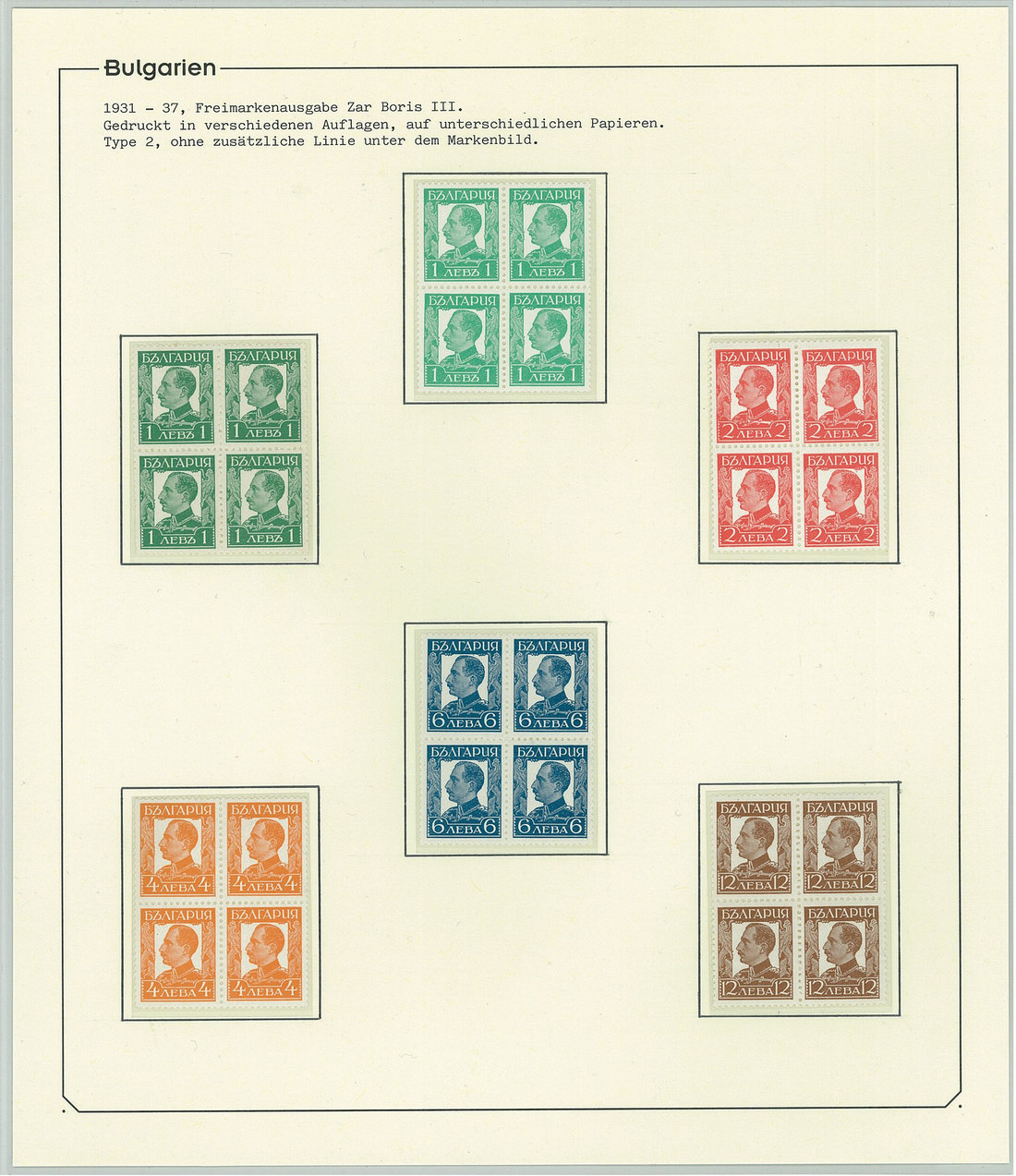 BulgariaLater Issues1931-37, Tsar Boris III. A very comprehensive specialized collection, including most of the features which are characteristic of this issue, comprising proofs of unadopted designs, scarce "wavy lines" watermarks, the set in rare n.h. blocks of four, and 44 postal items including airmails, transatlantic destinations, P.O. saving books, etc. Various Karaivanoff certificates are included. Viewing suggested. Mi. 226X-234X, 226Y-229Y. Photo