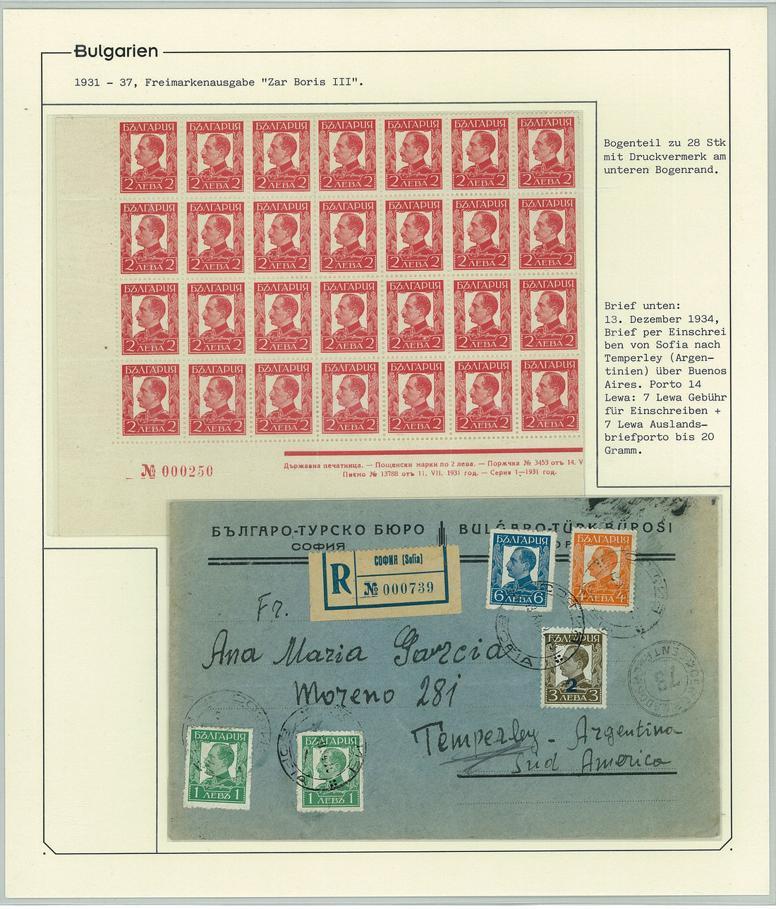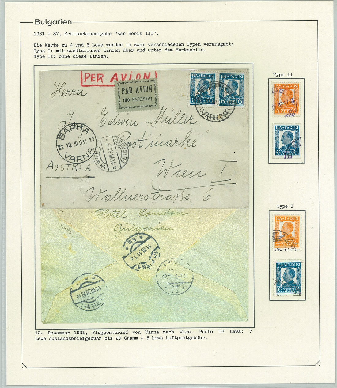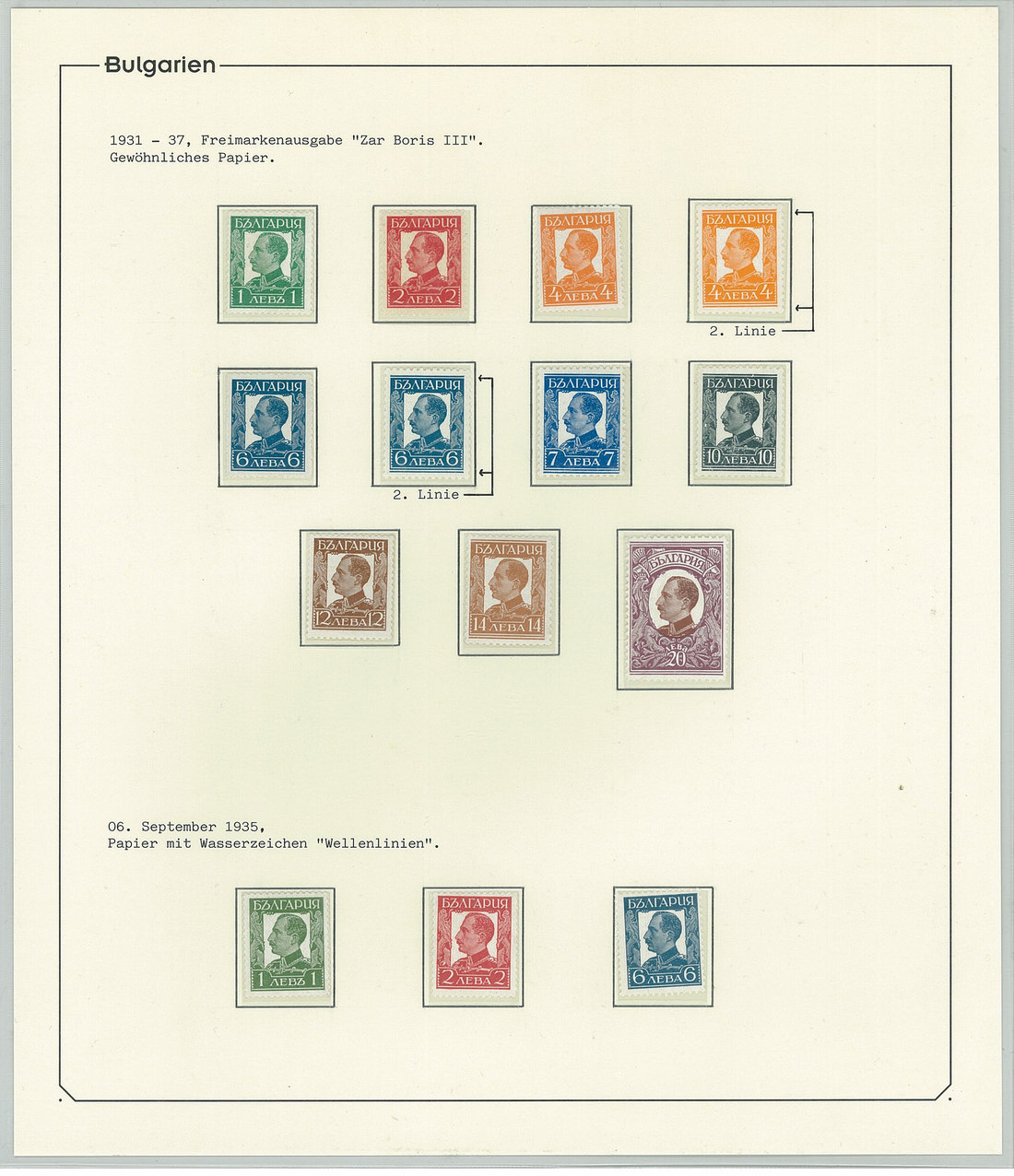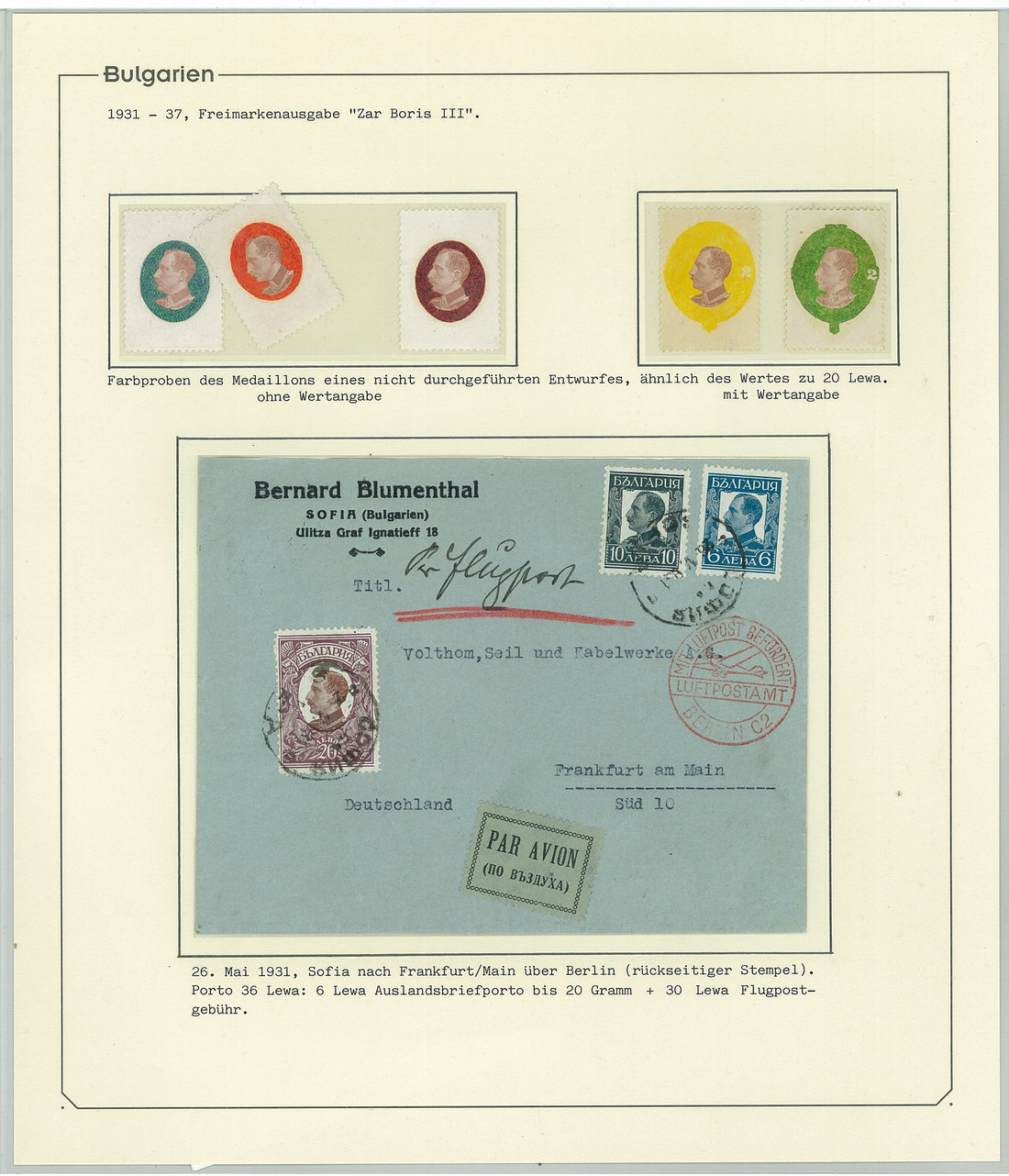 BulgariaLater Issues1931-37, Tsar Boris III. A very comprehensive specialized collection, including most of the features which are characteristic of this issue, comprising proofs of unadopted designs, scarce "wavy lines" watermarks, the set in rare n.h. blocks of four, and 44 postal items including airmails, transatlantic destinations, P.O. saving books, etc. Various Karaivanoff certificates are included. Viewing suggested. Mi. 226X-234X, 226Y-229Y. Photo