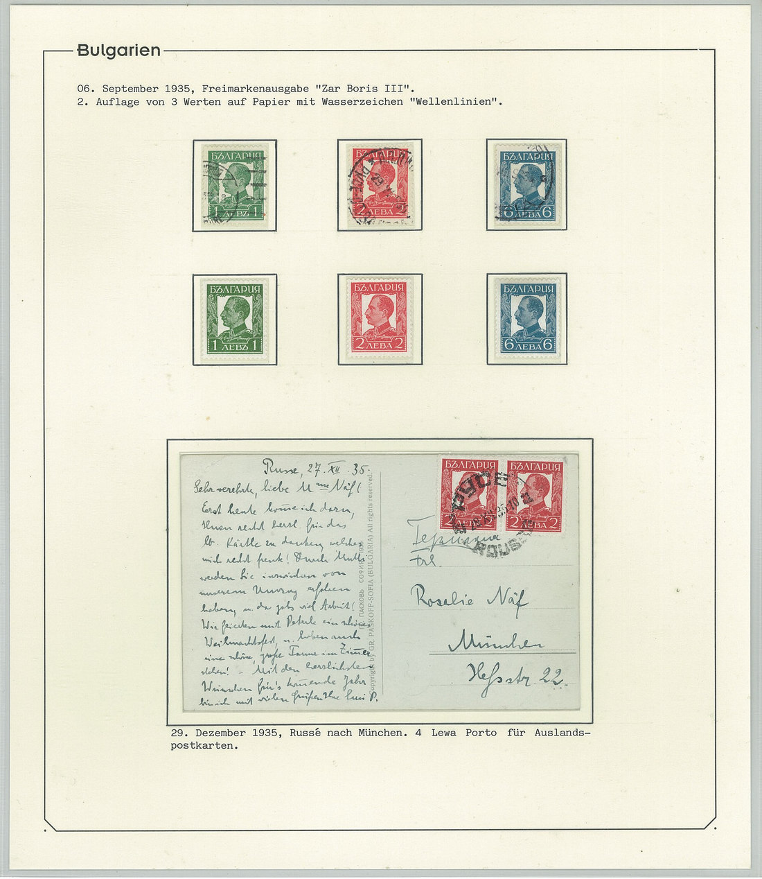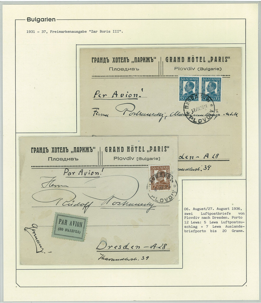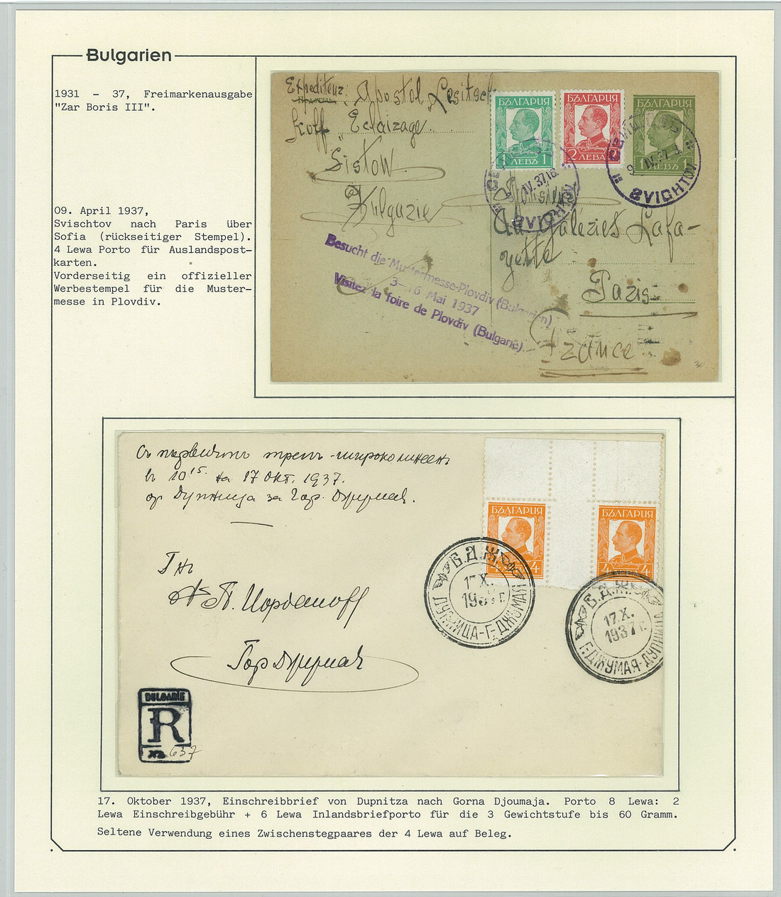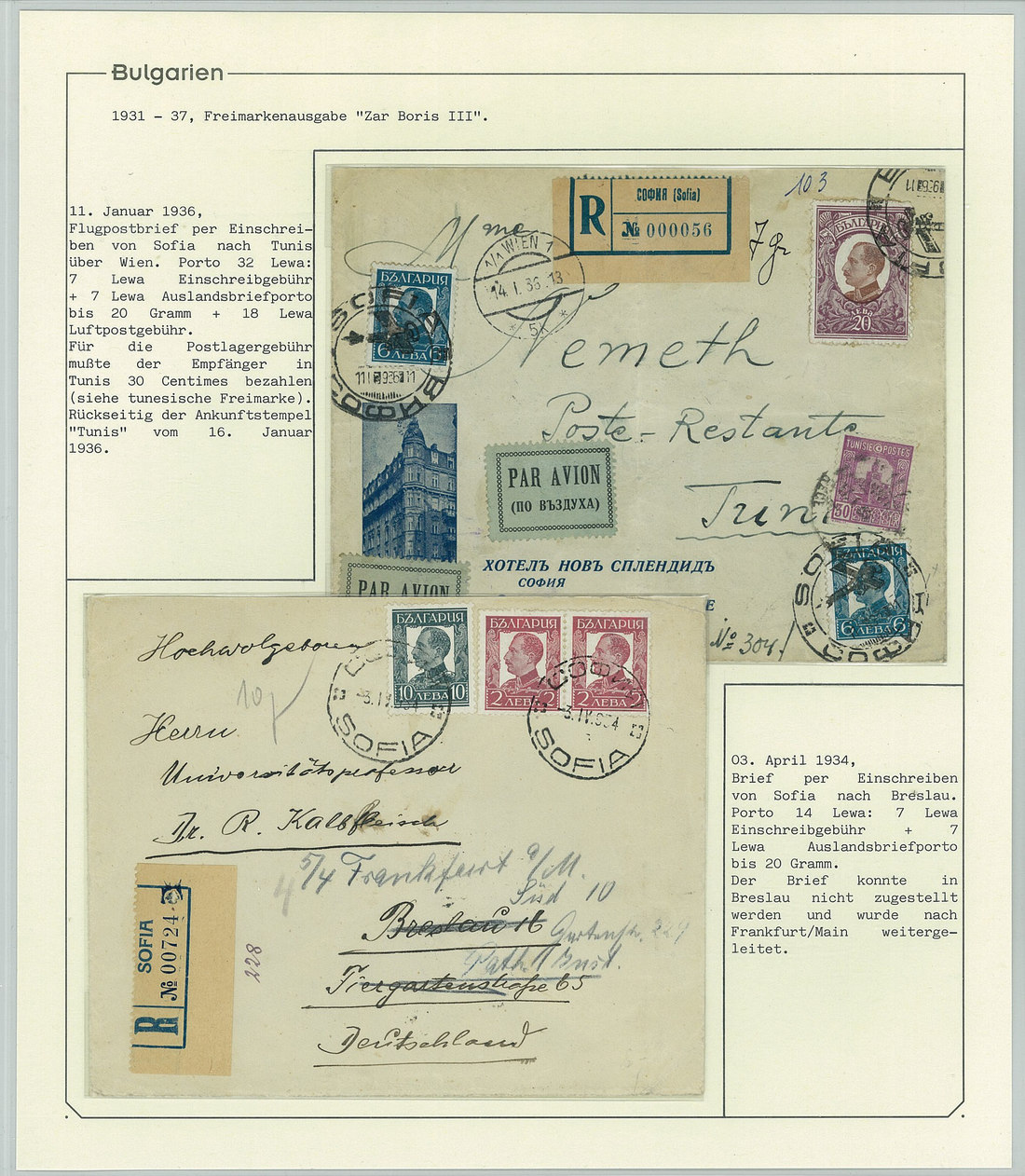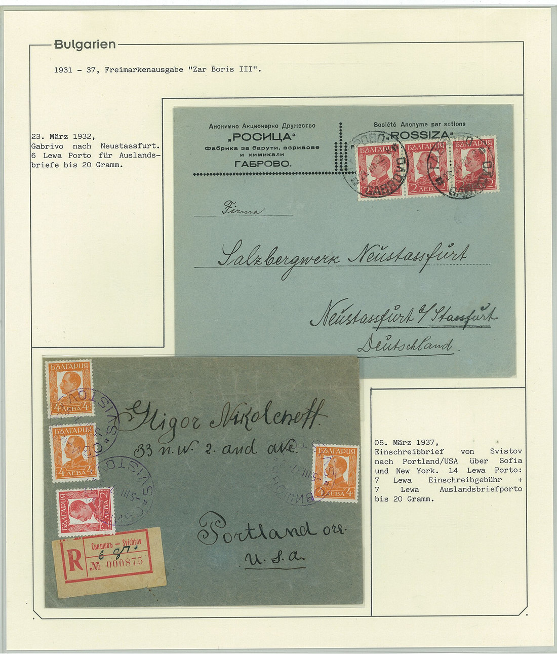 BulgariaLater Issues1931-37, Tsar Boris III. A very comprehensive specialized collection, including most of the features which are characteristic of this issue, comprising proofs of unadopted designs, scarce "wavy lines" watermarks, the set in rare n.h. blocks of four, and 44 postal items including airmails, transatlantic destinations, P.O. saving books, etc. Various Karaivanoff certificates are included. Viewing suggested. Mi. 226X-234X, 226Y-229Y. Photo