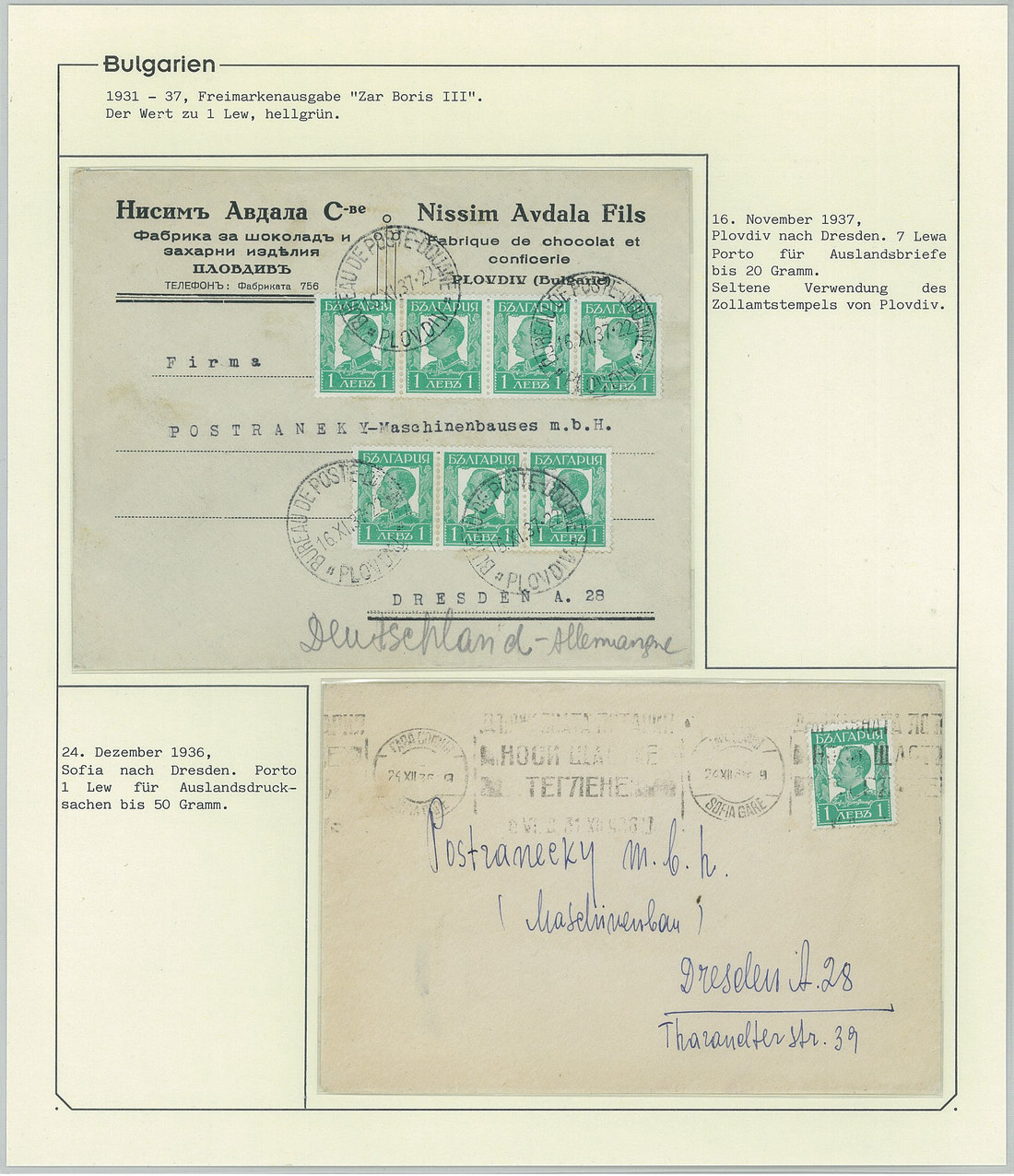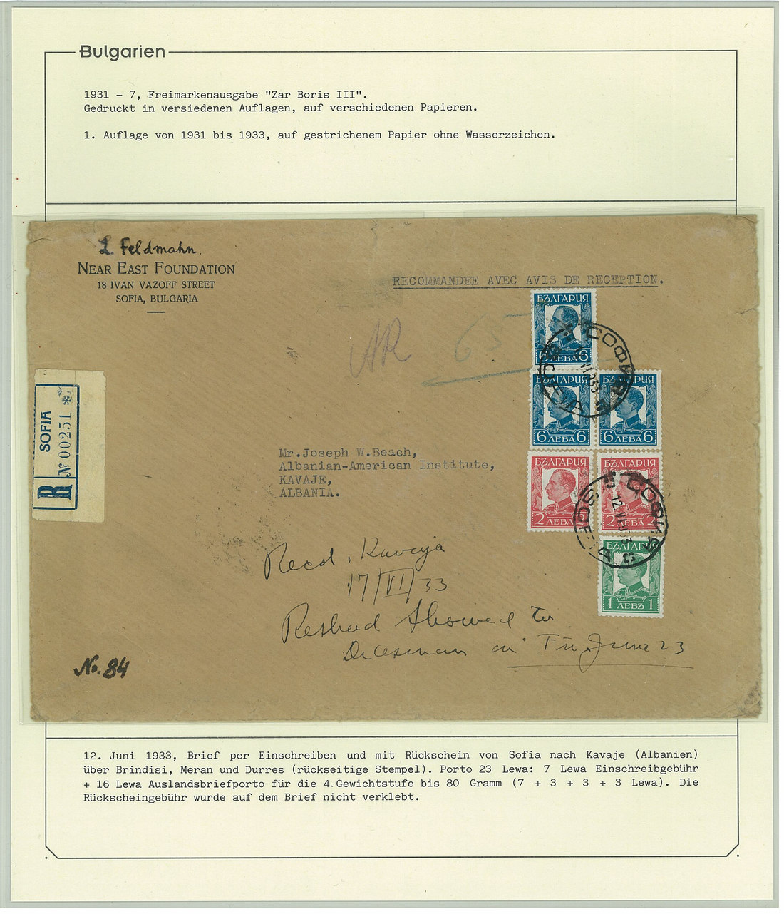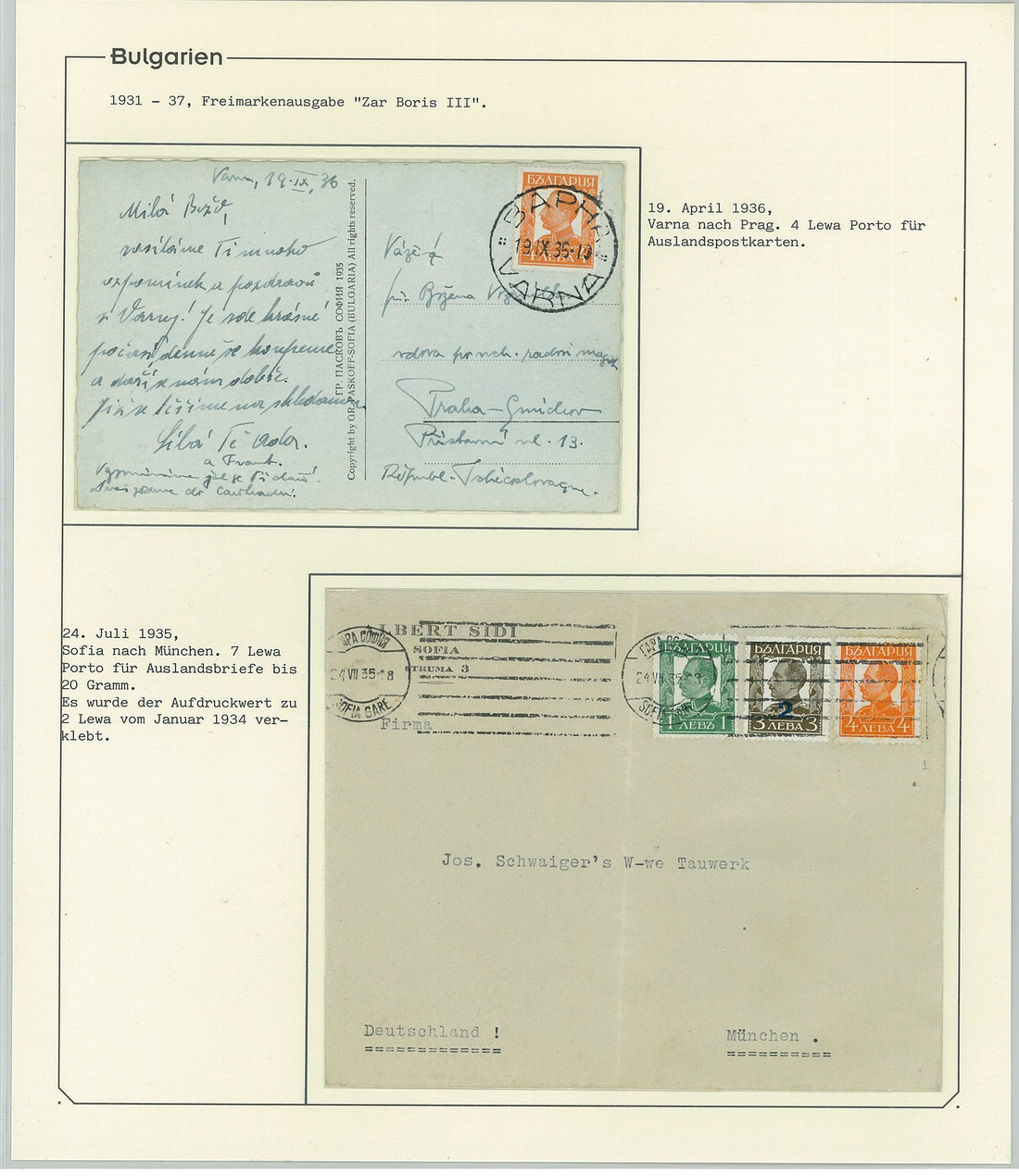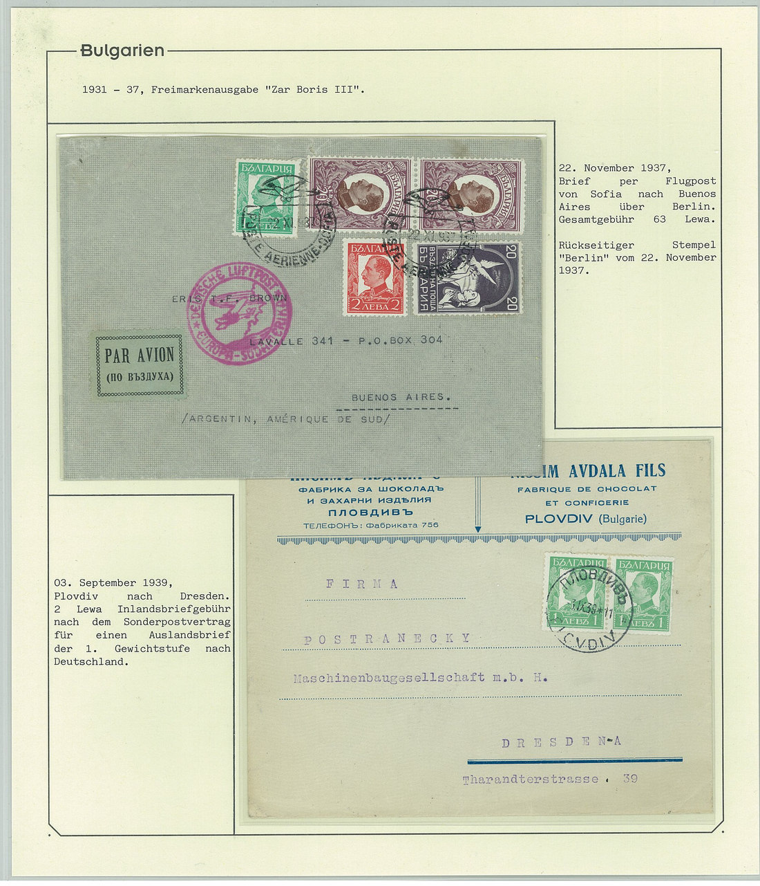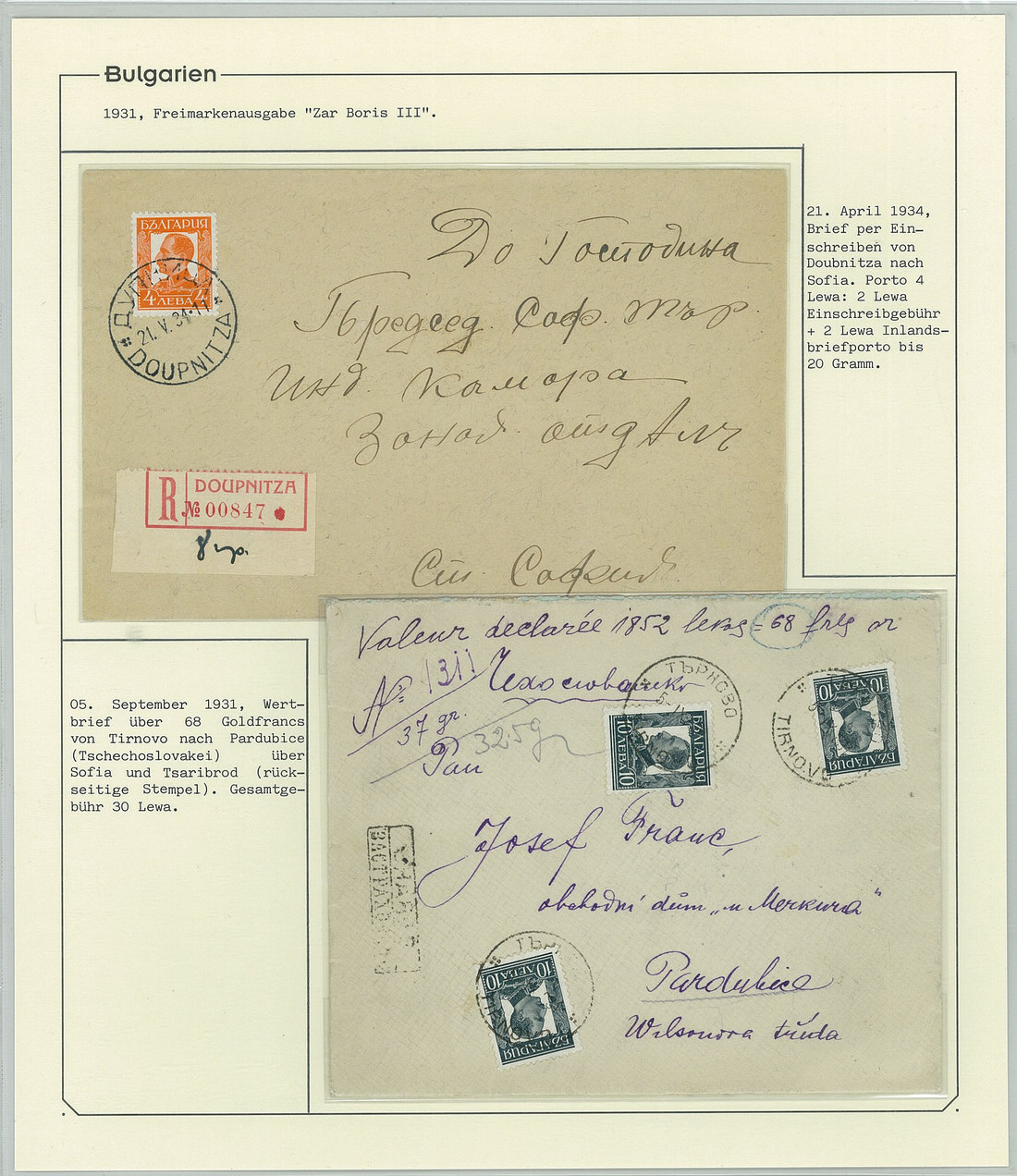 BulgariaLater Issues1931-37, Tsar Boris III. A very comprehensive specialized collection, including most of the features which are characteristic of this issue, comprising proofs of unadopted designs, scarce "wavy lines" watermarks, the set in rare n.h. blocks of four, and 44 postal items including airmails, transatlantic destinations, P.O. saving books, etc. Various Karaivanoff certificates are included. Viewing suggested. Mi. 226X-234X, 226Y-229Y. Photo