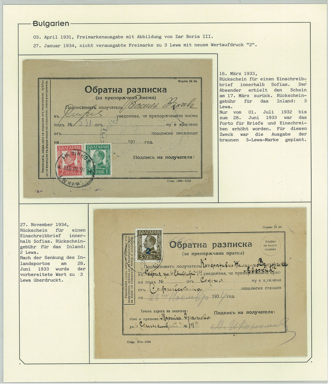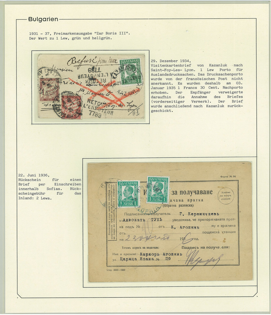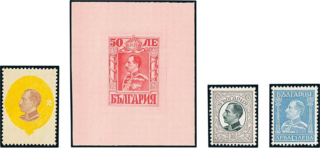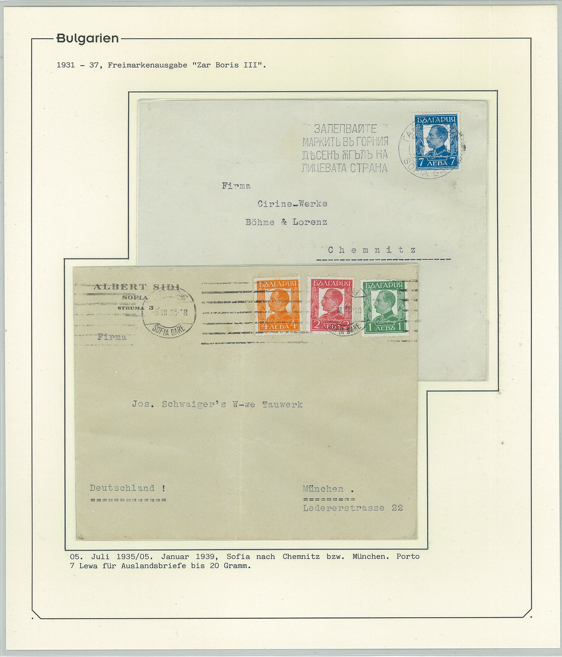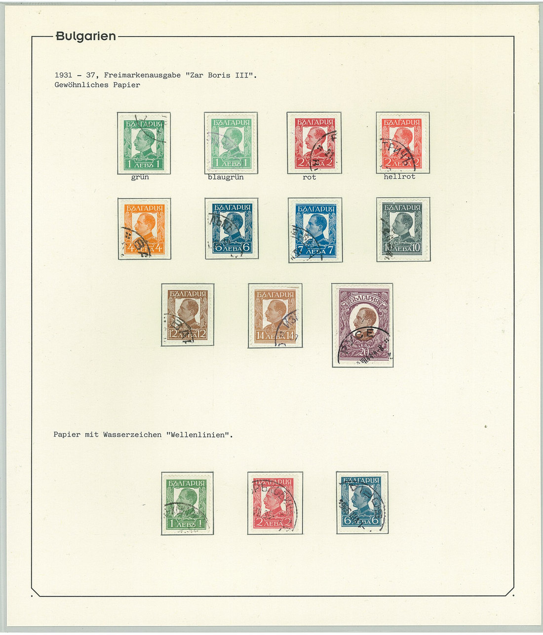 BulgariaLater Issues1931-37, Tsar Boris III. A very comprehensive specialized collection, including most of the features which are characteristic of this issue, comprising proofs of unadopted designs, scarce "wavy lines" watermarks, the set in rare n.h. blocks of four, and 44 postal items including airmails, transatlantic destinations, P.O. saving books, etc. Various Karaivanoff certificates are included. Viewing suggested. Mi. 226X-234X, 226Y-229Y. Photo