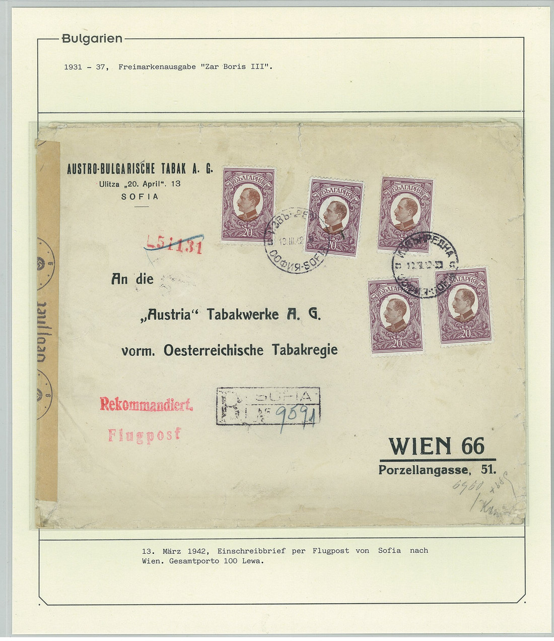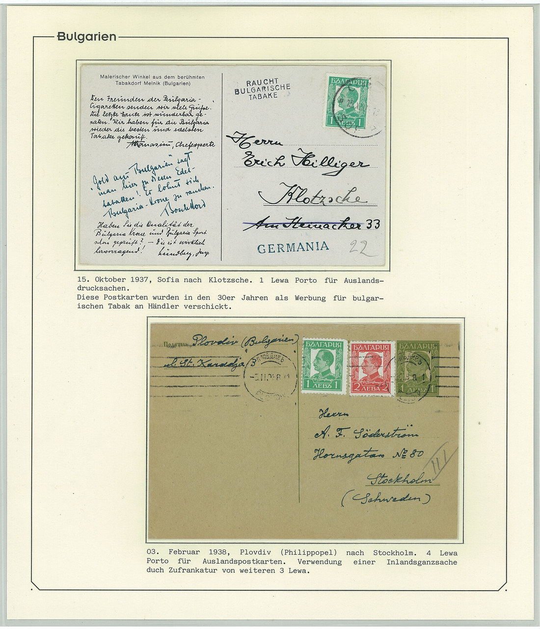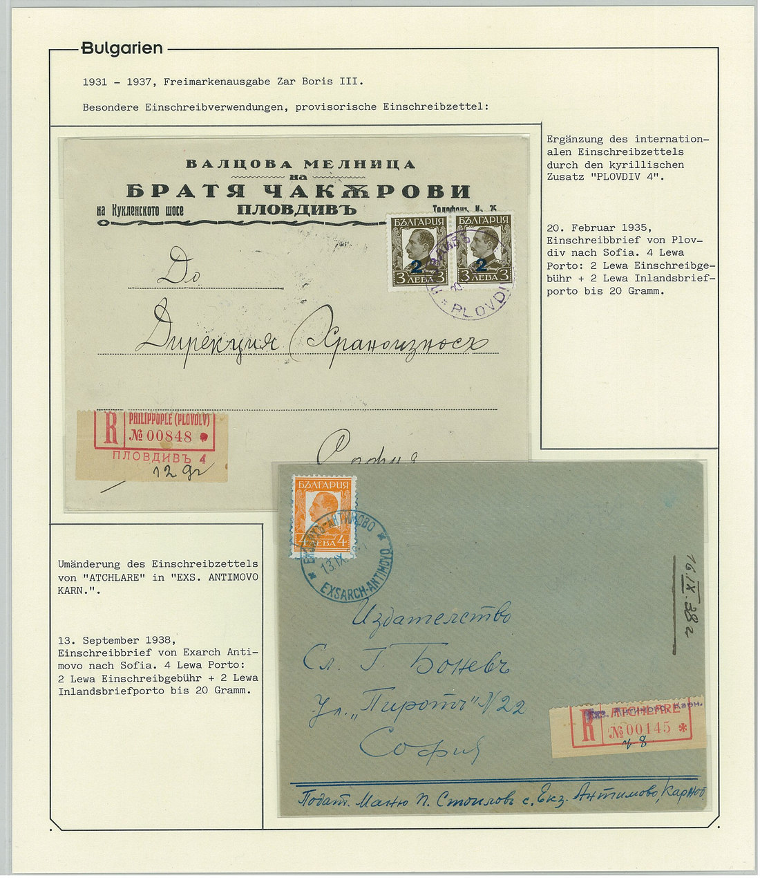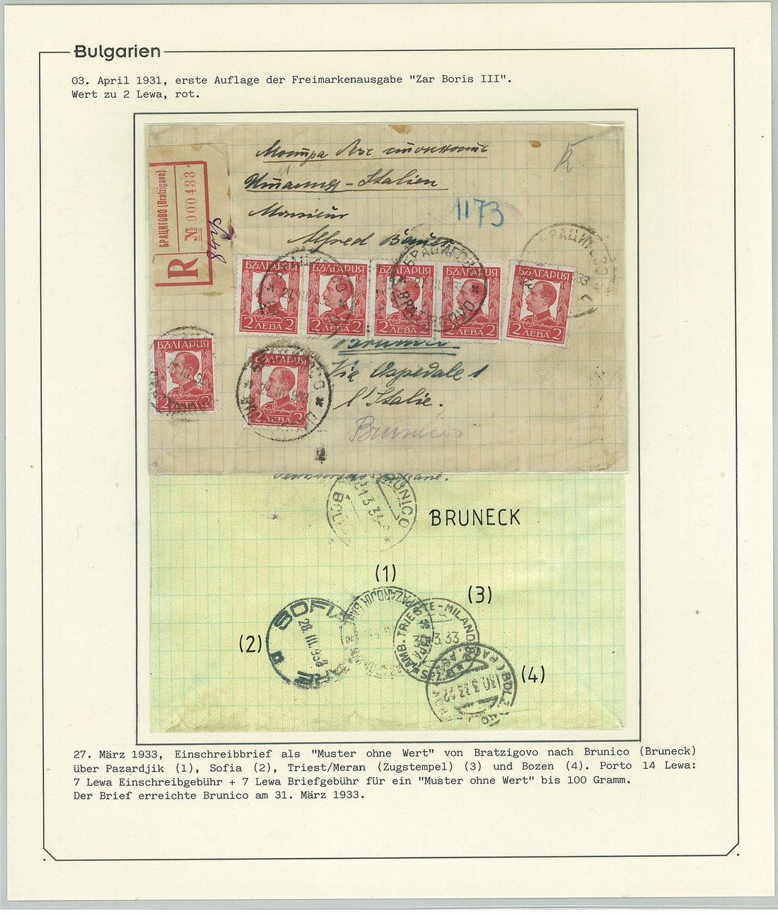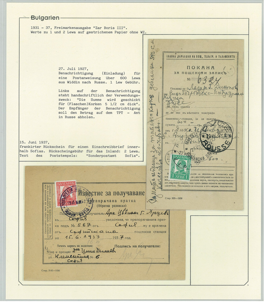 BulgariaLater Issues1931-37, Tsar Boris III. A very comprehensive specialized collection, including most of the features which are characteristic of this issue, comprising proofs of unadopted designs, scarce "wavy lines" watermarks, the set in rare n.h. blocks of four, and 44 postal items including airmails, transatlantic destinations, P.O. saving books, etc. Various Karaivanoff certificates are included. Viewing suggested. Mi. 226X-234X, 226Y-229Y. Photo