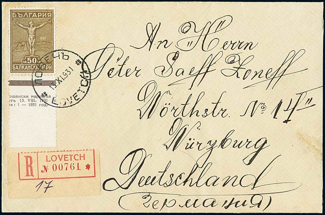 BulgariaLater Issues1931, Victory, 50l. brown, a superb example with complete sheet margin and imprint, on registered cover to Würzburg (Germany), tied by "Lovetch" c.d.s, with Sofia transit and arrival on back. A rare single franking. Mi. 248. Photo