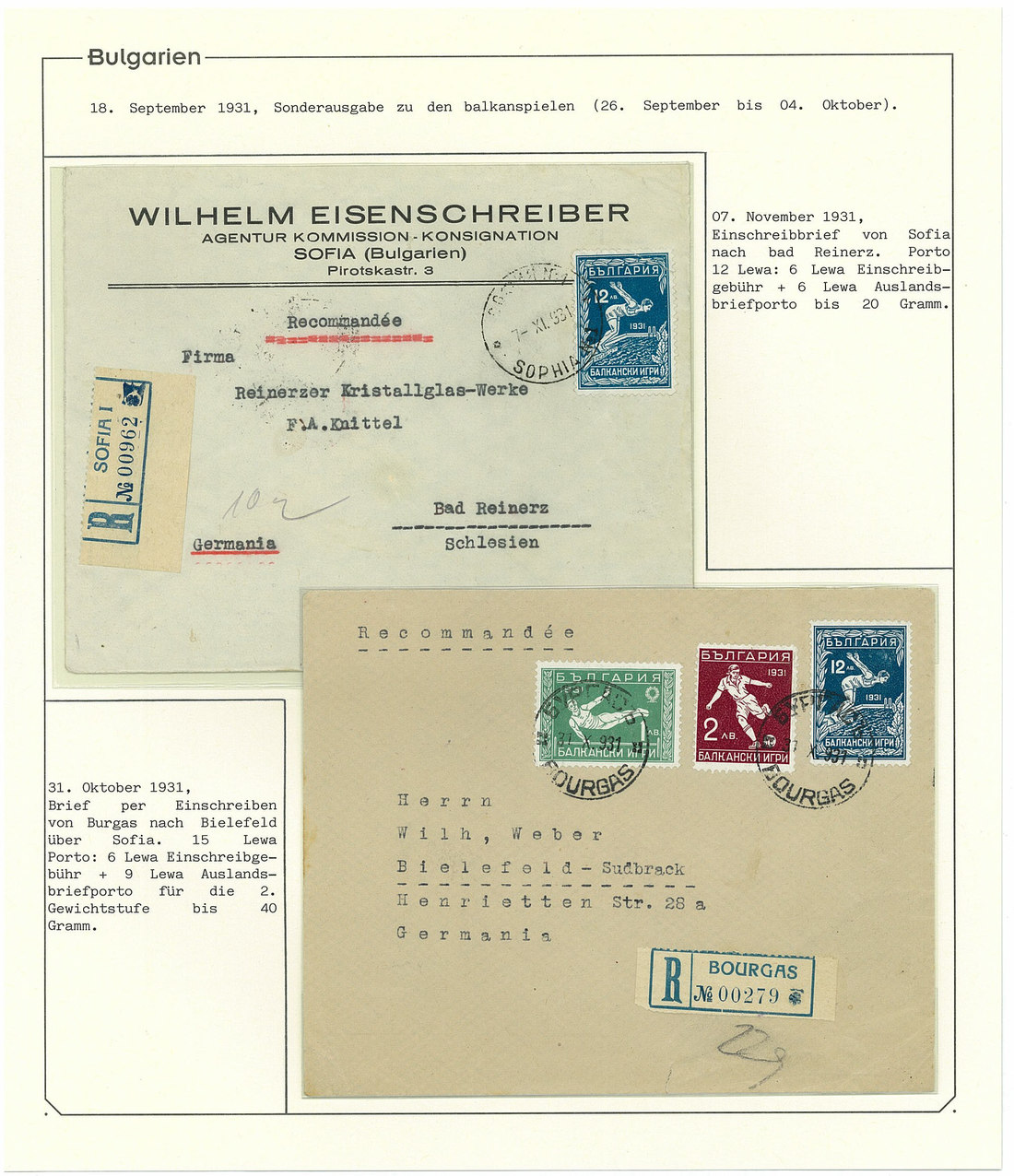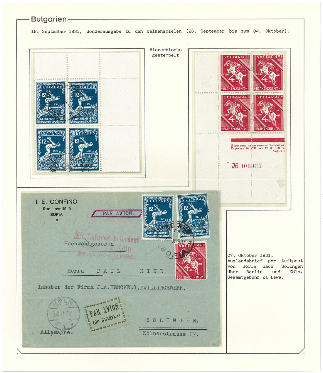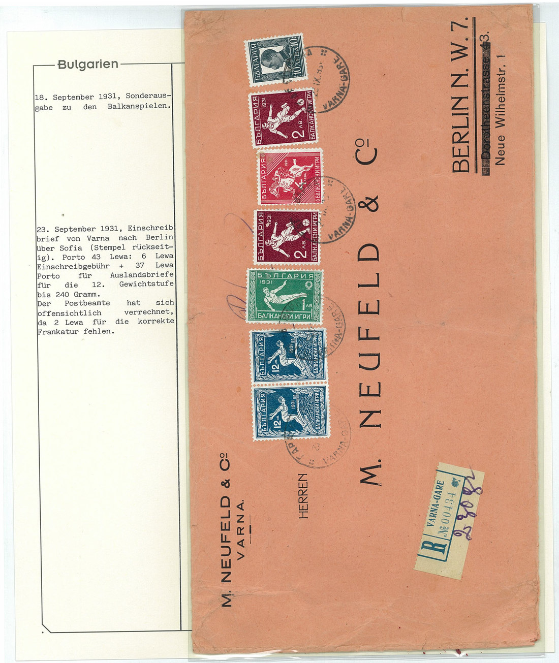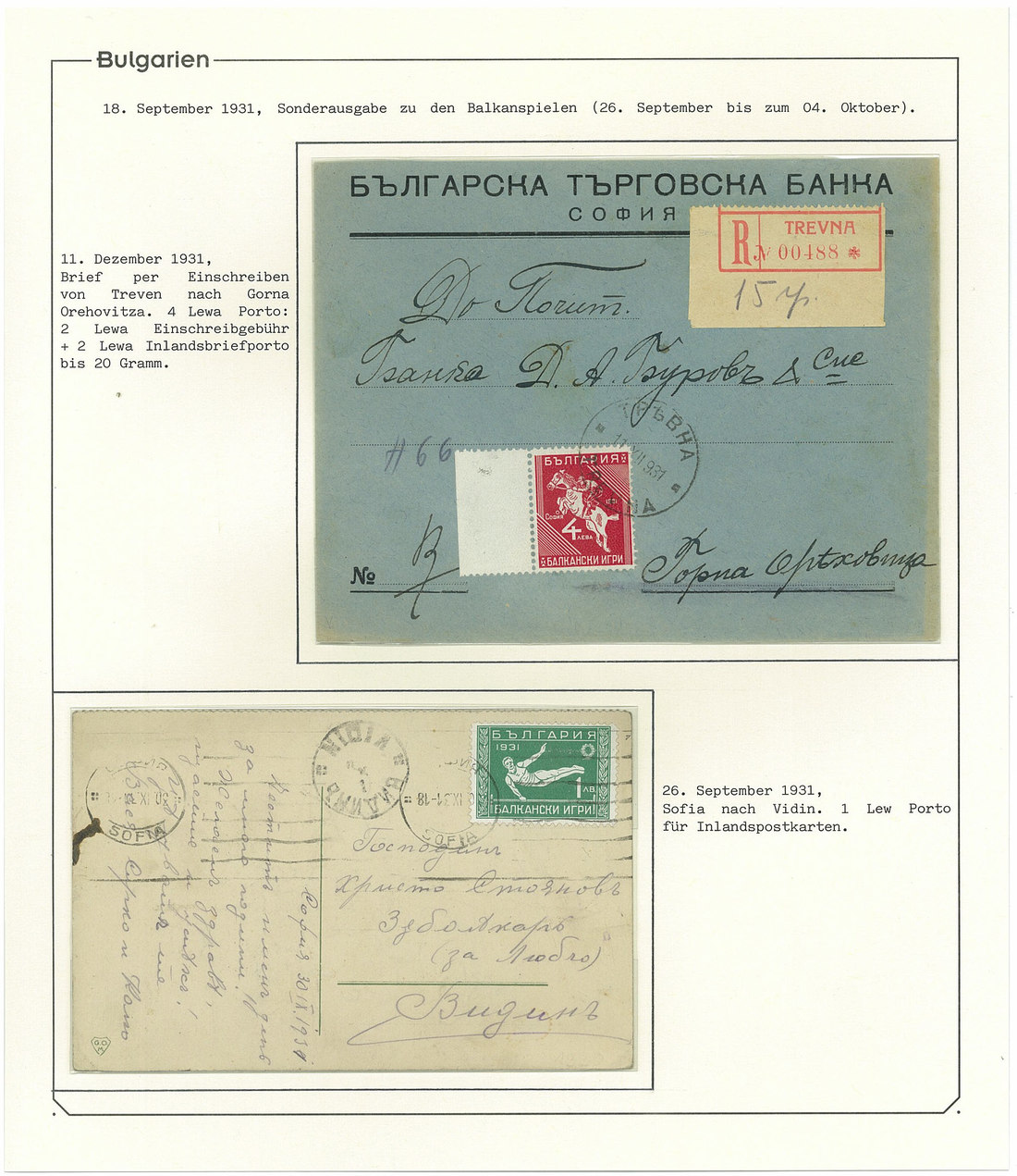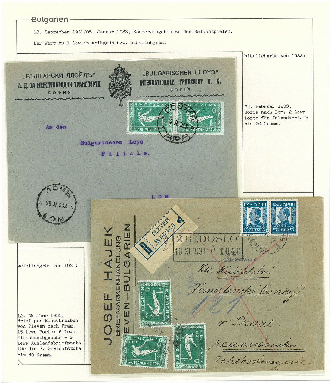 BulgariaLater Issues1931, Balkan Games Issue. A remarkable assembly containing the set n.h., low-value complete sheets cancelled to order, and 18 covers correctly paying the rate, being mainly unusual commercial correspondence, including rare usages with 10l. and 12l. denominations, and a unique usage of 1l. single franking on customs document for a parcel. A marvelous lot. Mi. 242-248. Photo