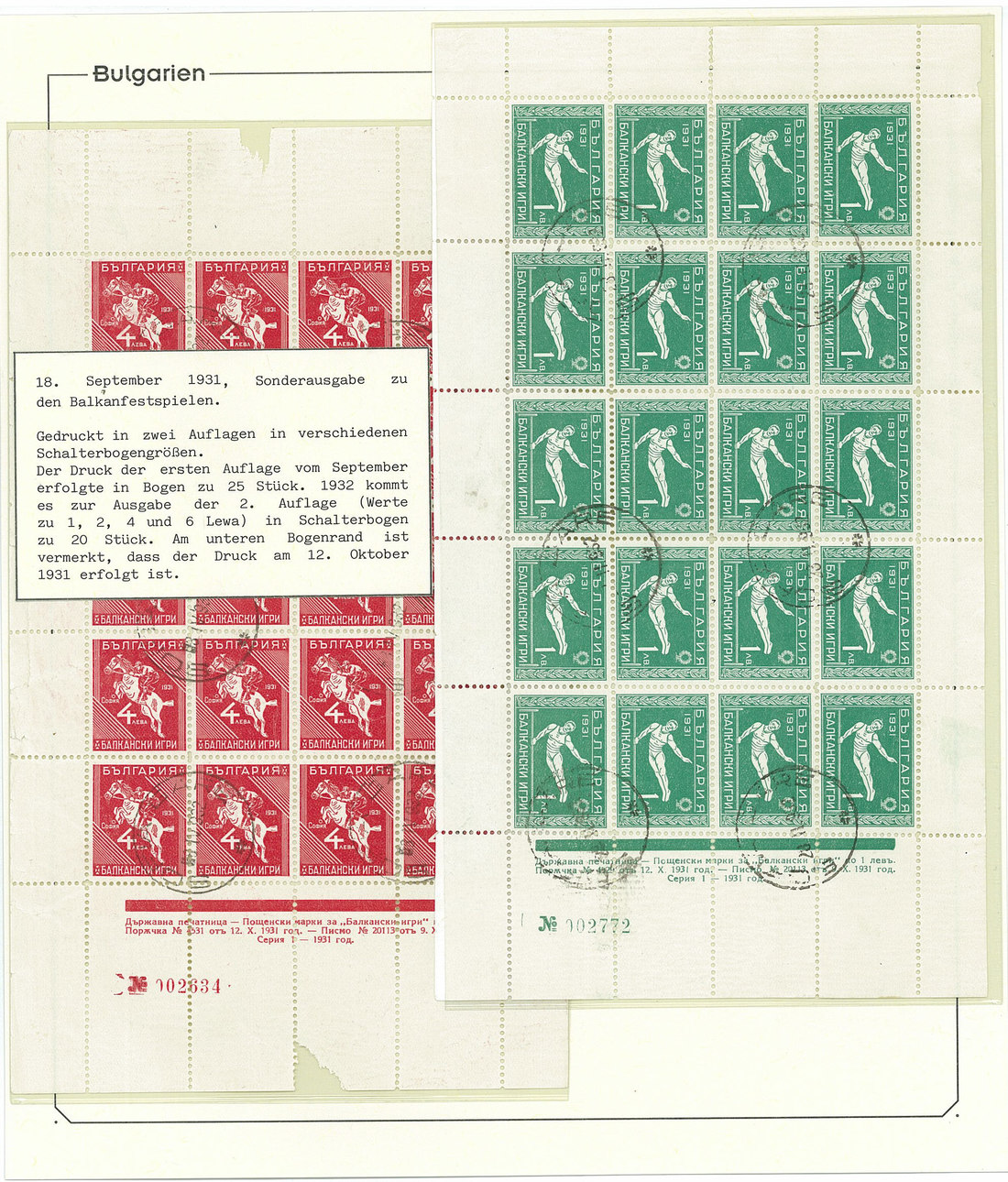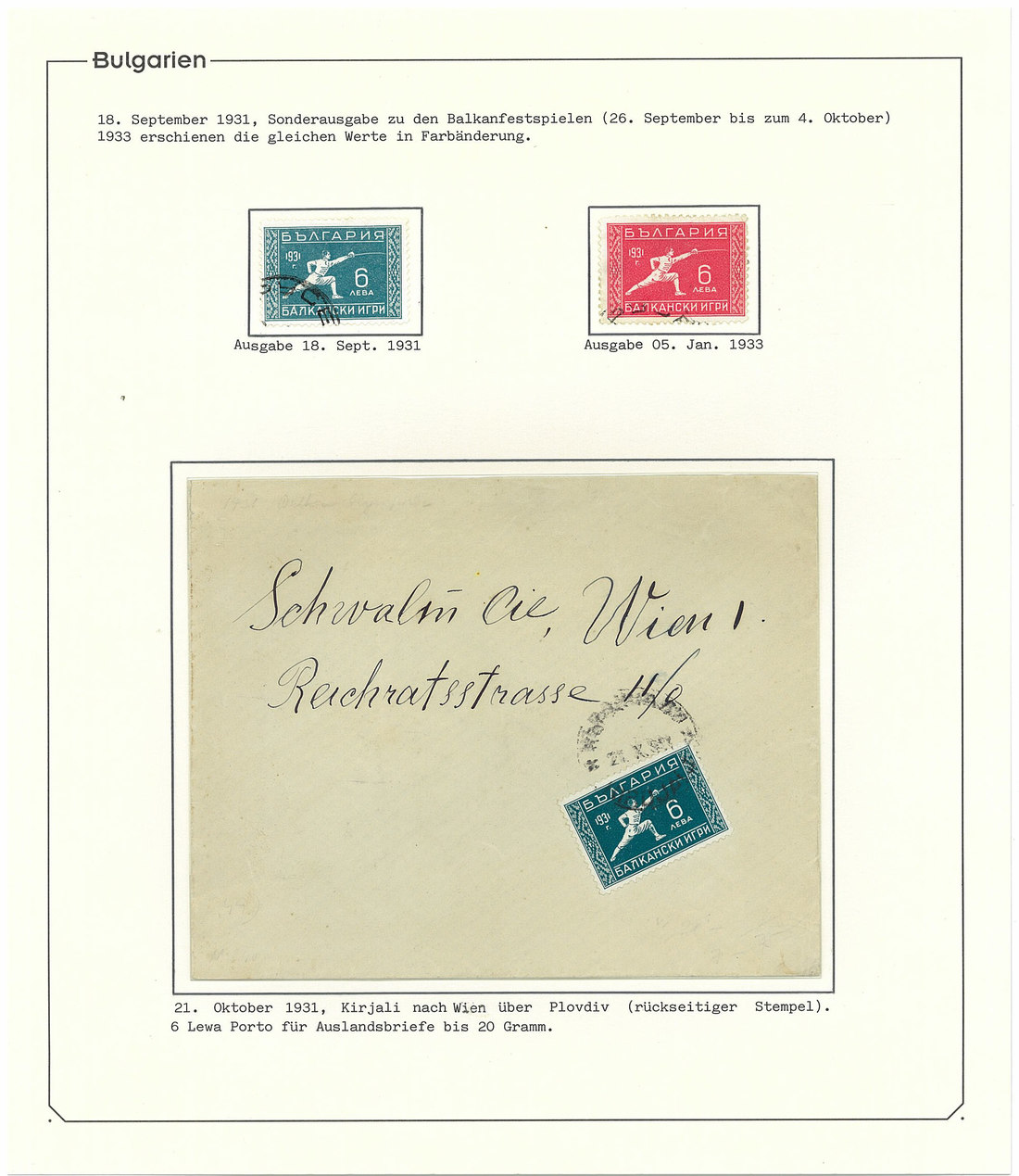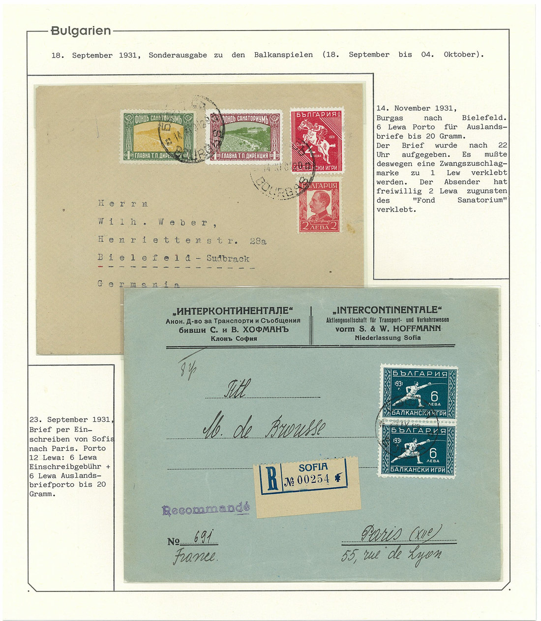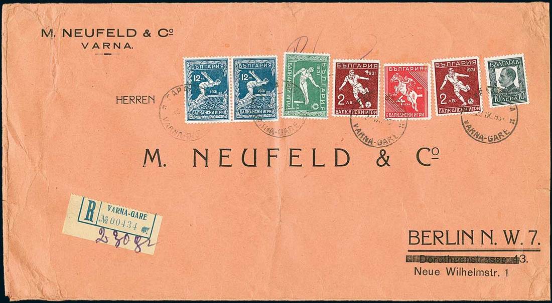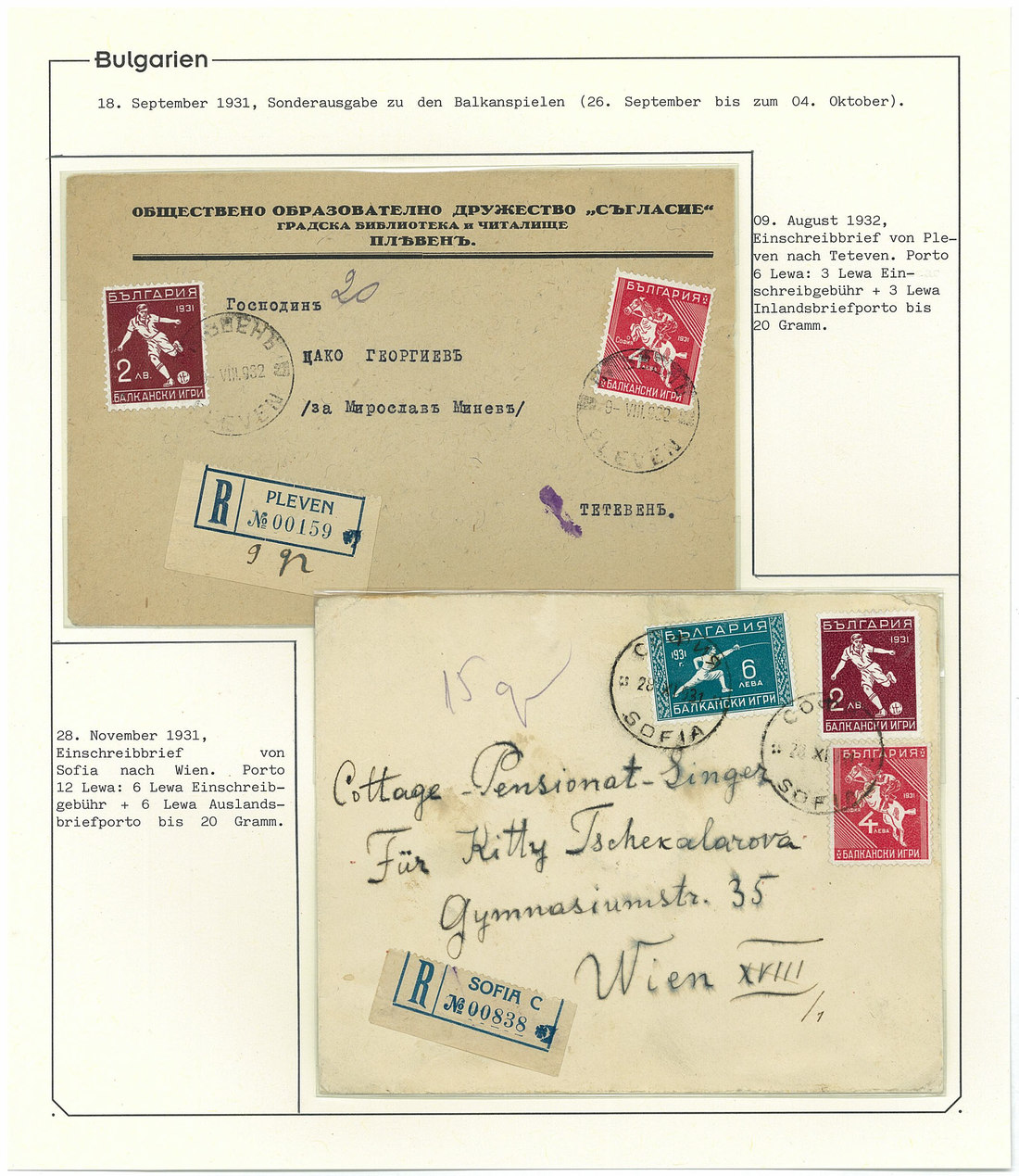 BulgariaLater Issues1931, Balkan Games Issue. A remarkable assembly containing the set n.h., low-value complete sheets cancelled to order, and 18 covers correctly paying the rate, being mainly unusual commercial correspondence, including rare usages with 10l. and 12l. denominations, and a unique usage of 1l. single franking on customs document for a parcel. A marvelous lot. Mi. 242-248. Photo