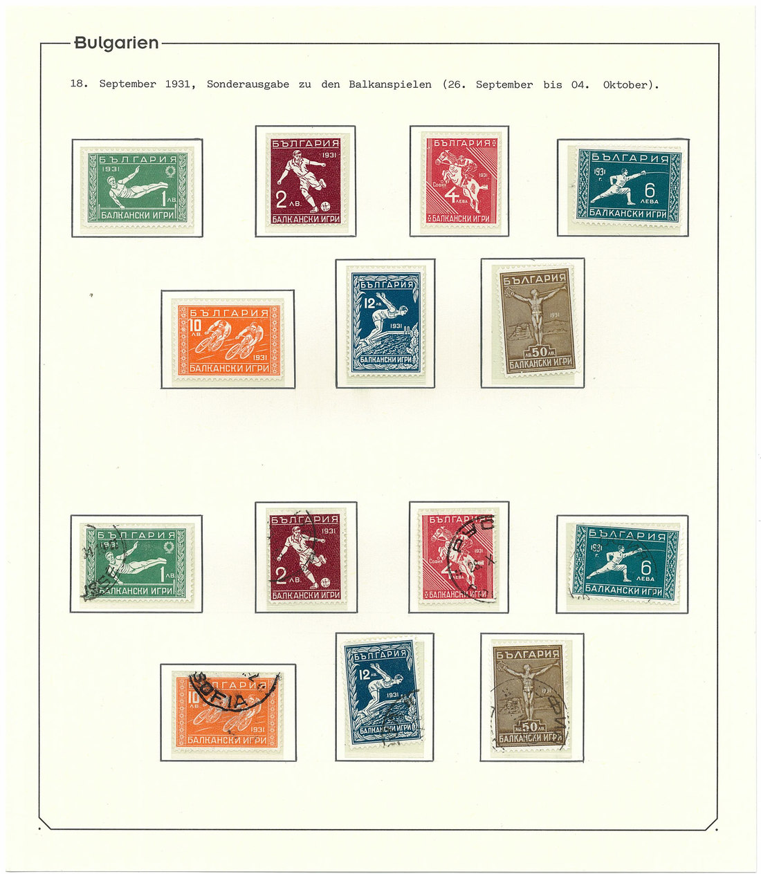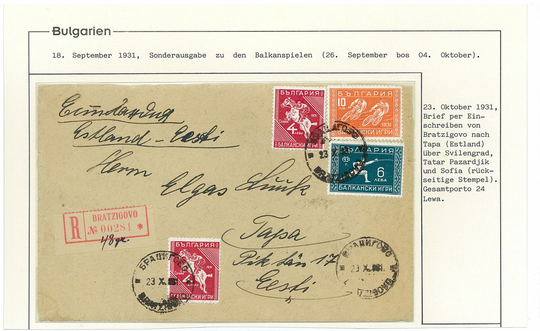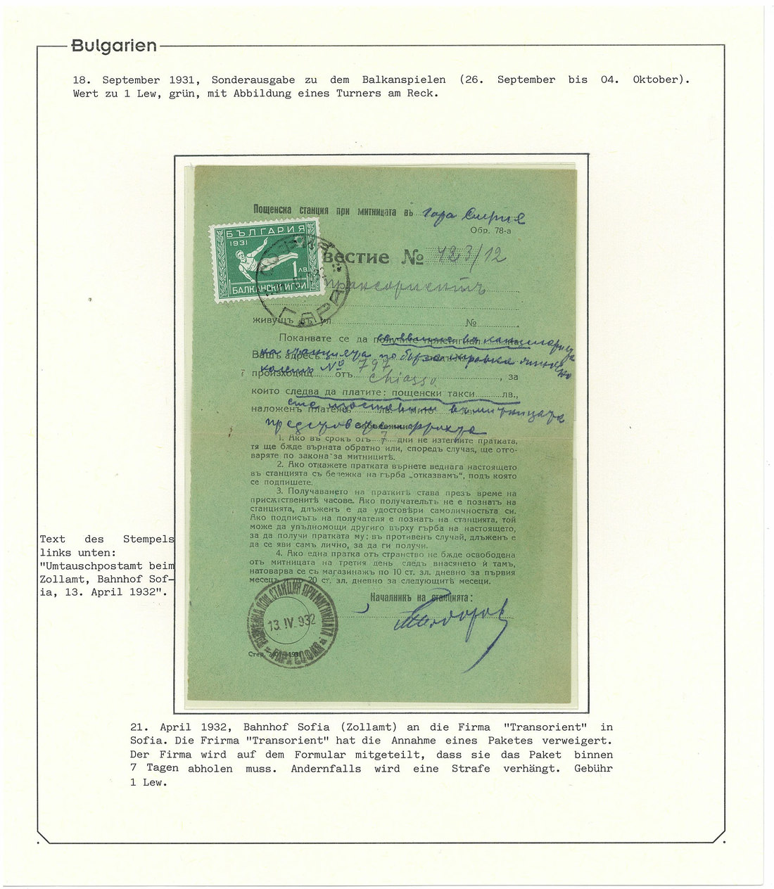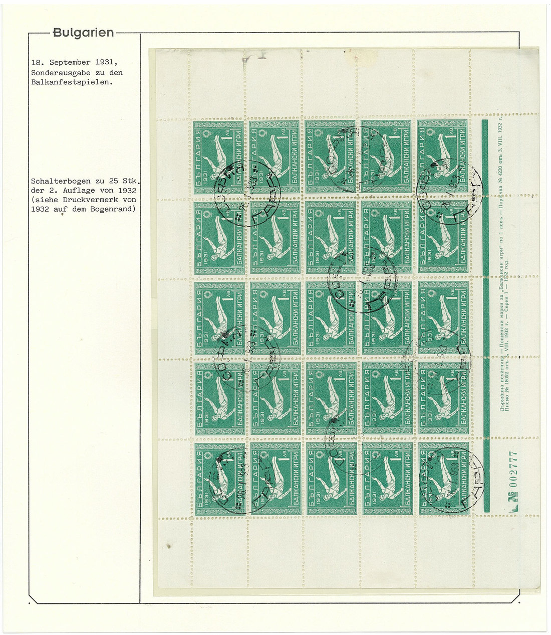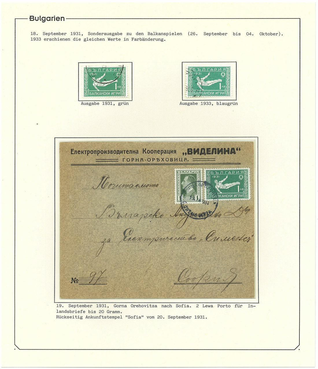 BulgariaLater Issues1931, Balkan Games Issue. A remarkable assembly containing the set n.h., low-value complete sheets cancelled to order, and 18 covers correctly paying the rate, being mainly unusual commercial correspondence, including rare usages with 10l. and 12l. denominations, and a unique usage of 1l. single franking on customs document for a parcel. A marvelous lot. Mi. 242-248. Photo