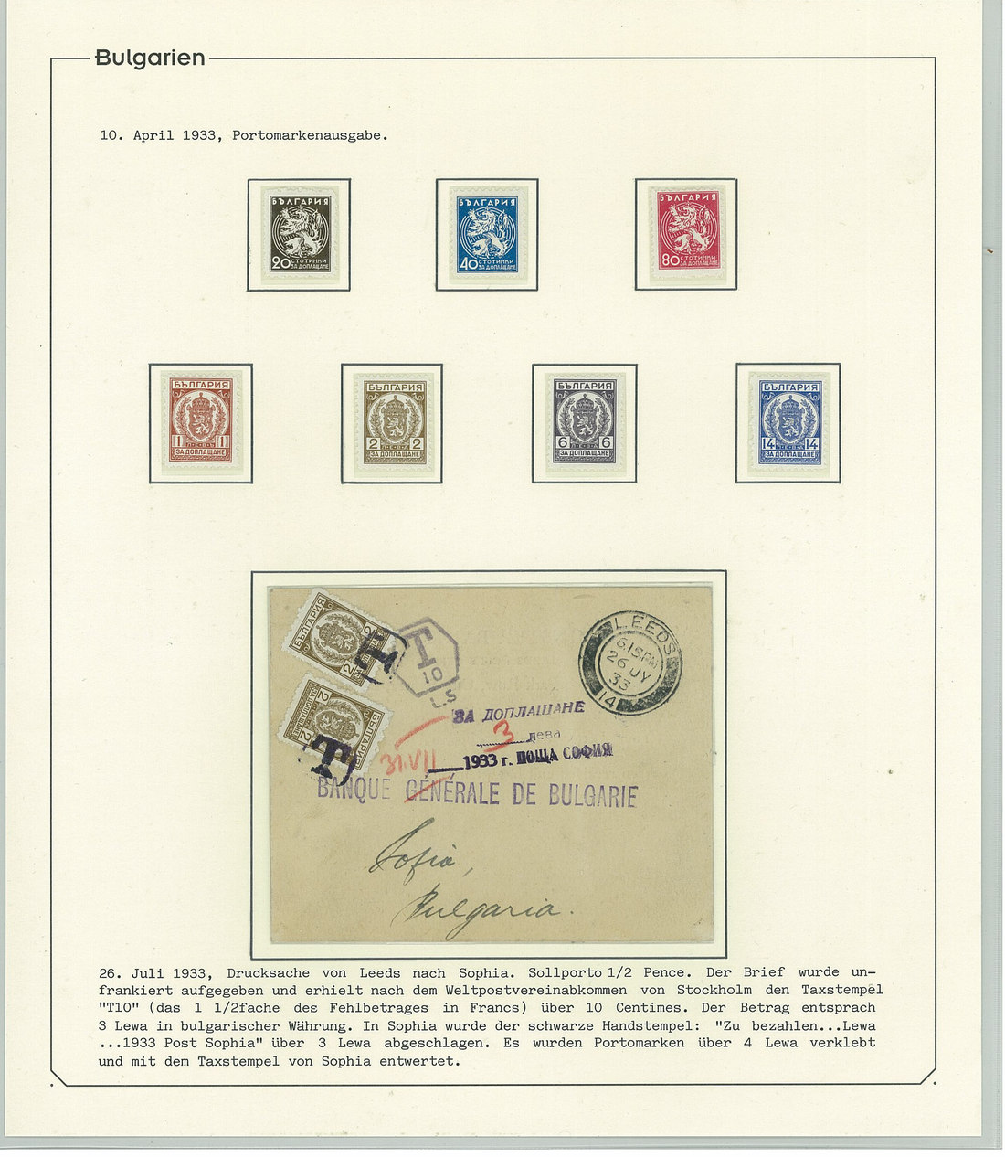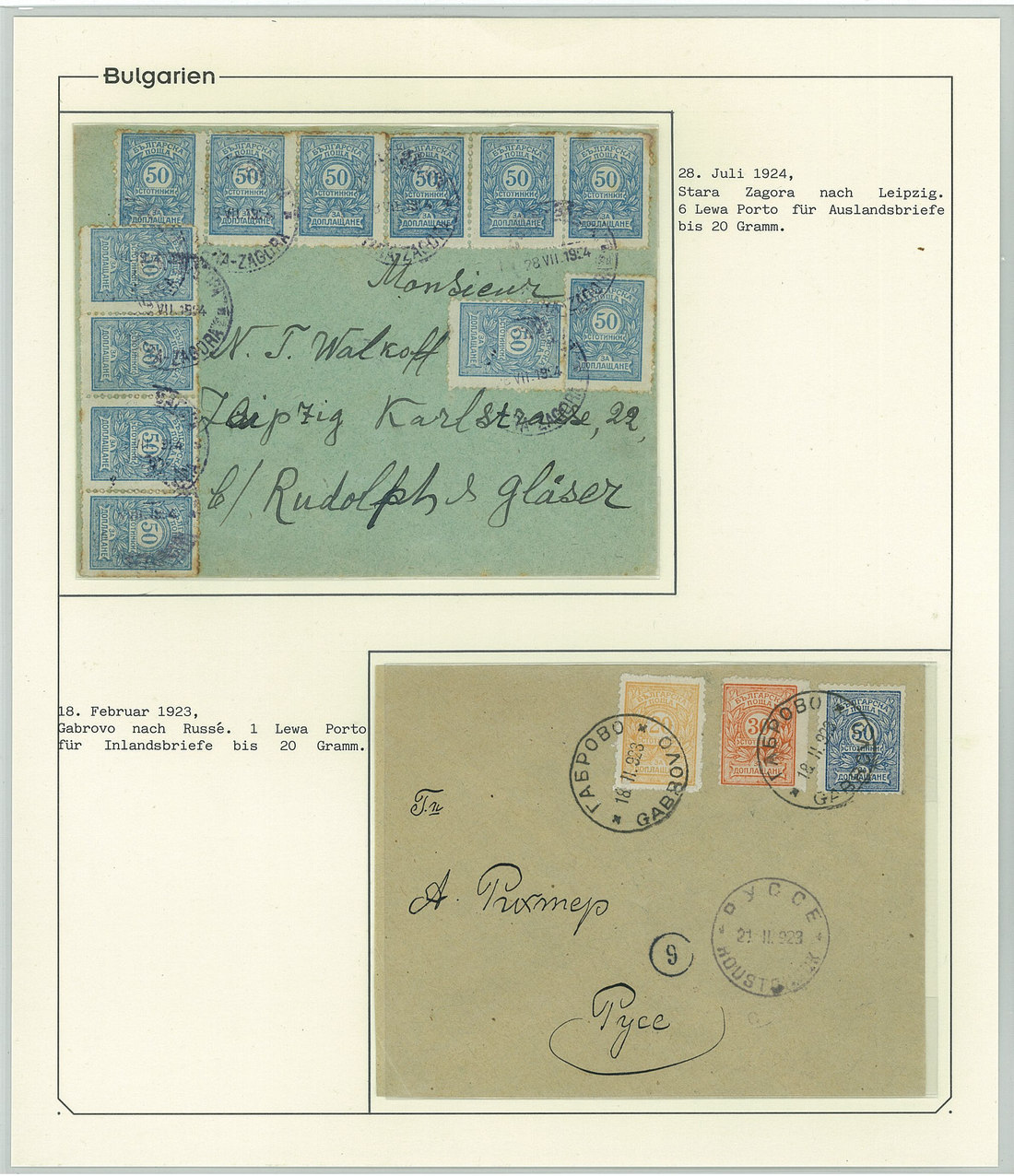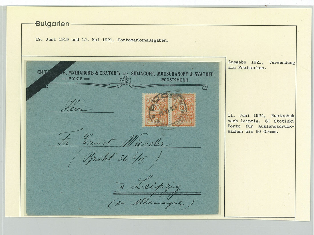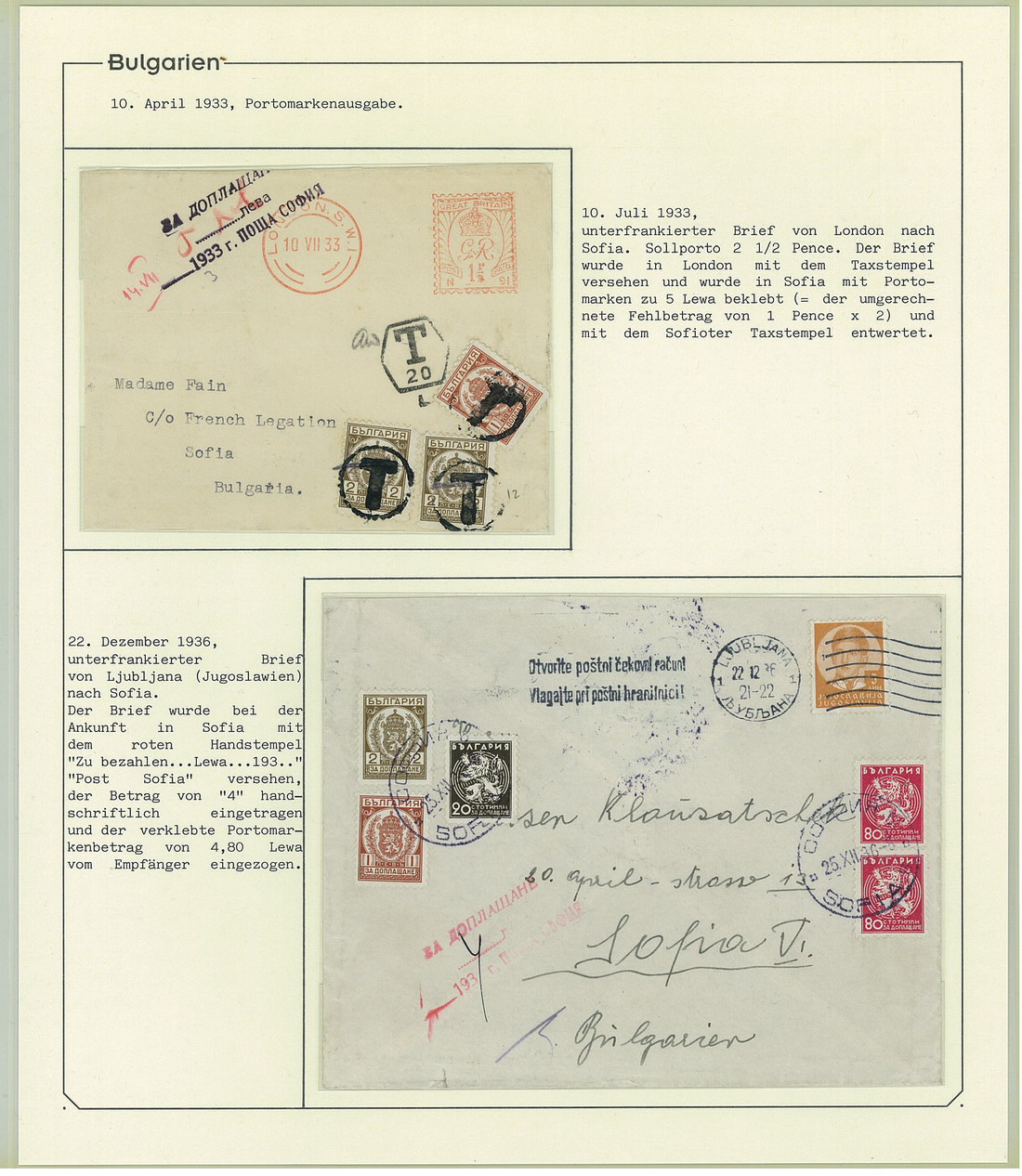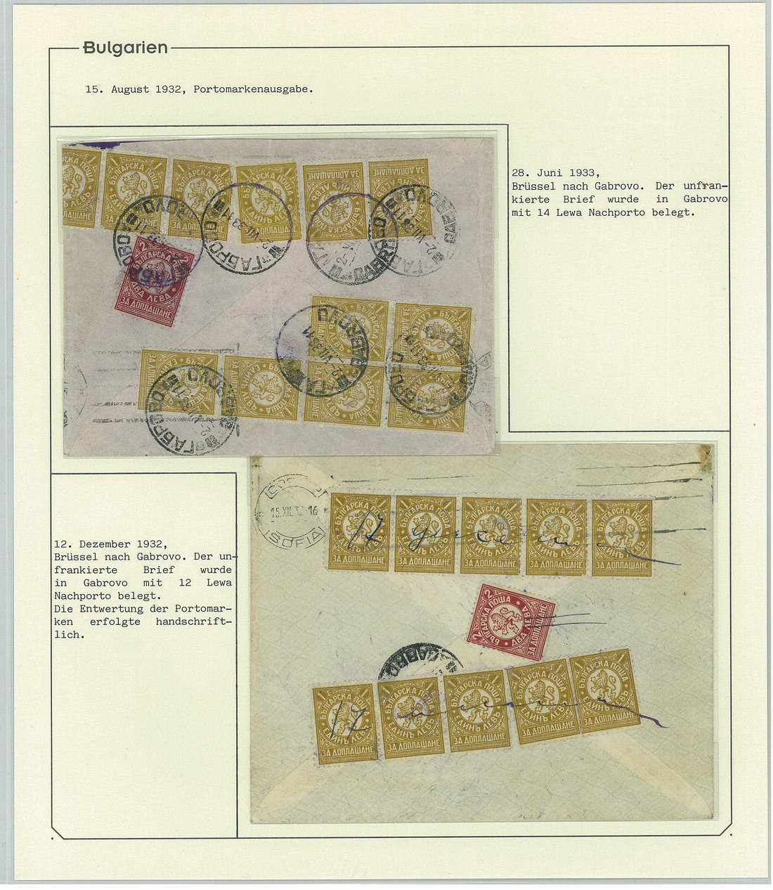 BulgariaLater Issues1919-33, Postage Dues Issues. A comprehensive collection containing stamps, inclusive of multiples, imperforates, varieties, as well as 42 covers, including the 1919-21 issues scarcely used as postage dues, 1921 1l. imperforate (one of just two covers known), the infrequently used 1933 issue, multiple frankings, and attractive combinations with foreign countries. Viewing essential. Photo