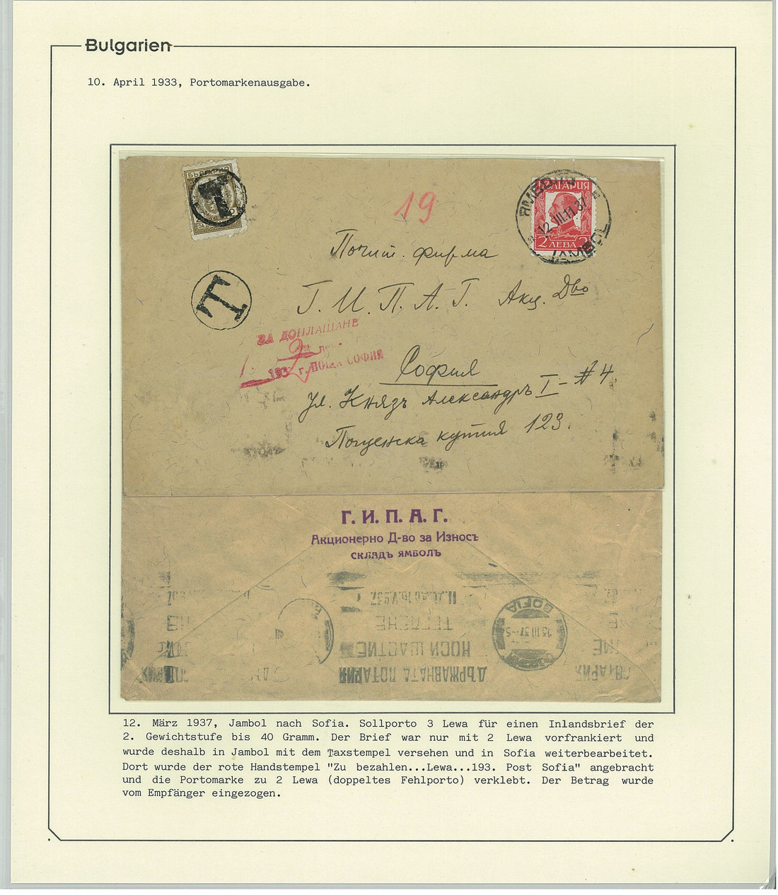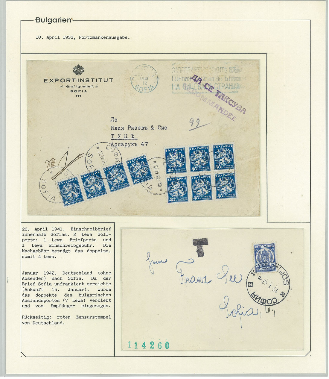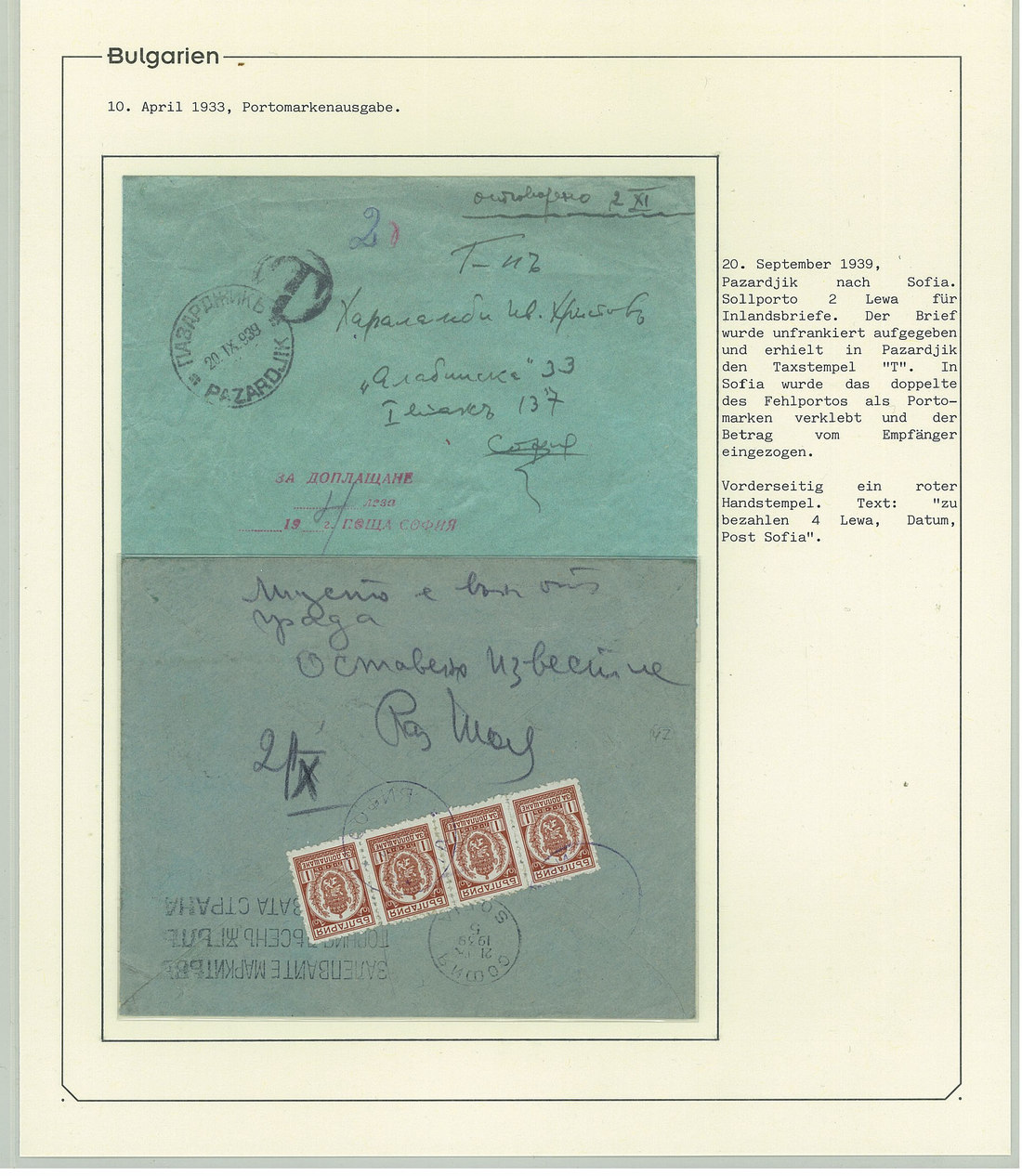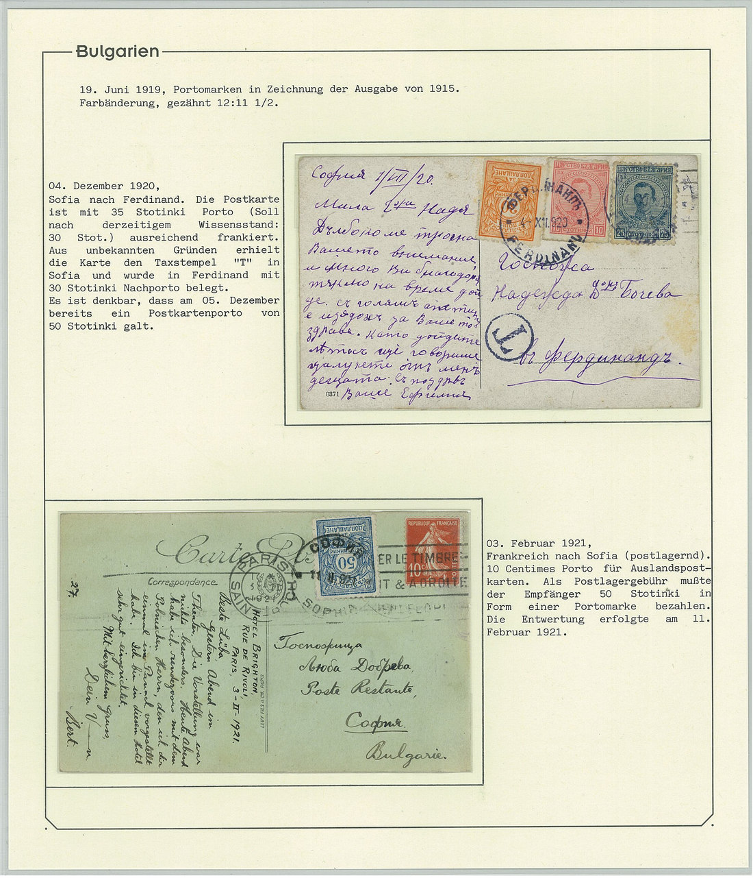 BulgariaLater Issues1919-33, Postage Dues Issues. A comprehensive collection containing stamps, inclusive of multiples, imperforates, varieties, as well as 42 covers, including the 1919-21 issues scarcely used as postage dues, 1921 1l. imperforate (one of just two covers known), the infrequently used 1933 issue, multiple frankings, and attractive combinations with foreign countries. Viewing essential. Photo