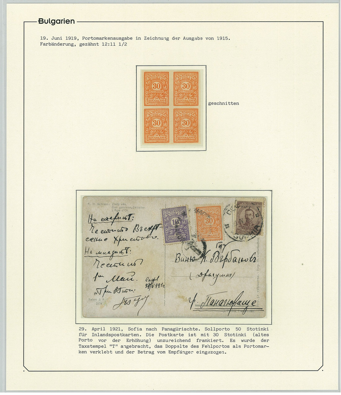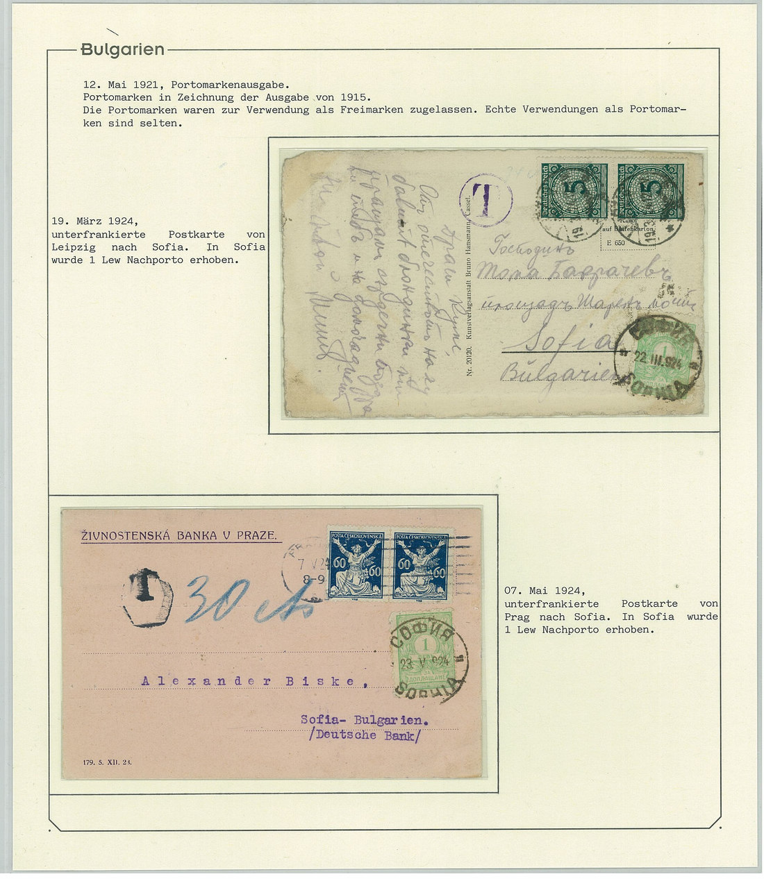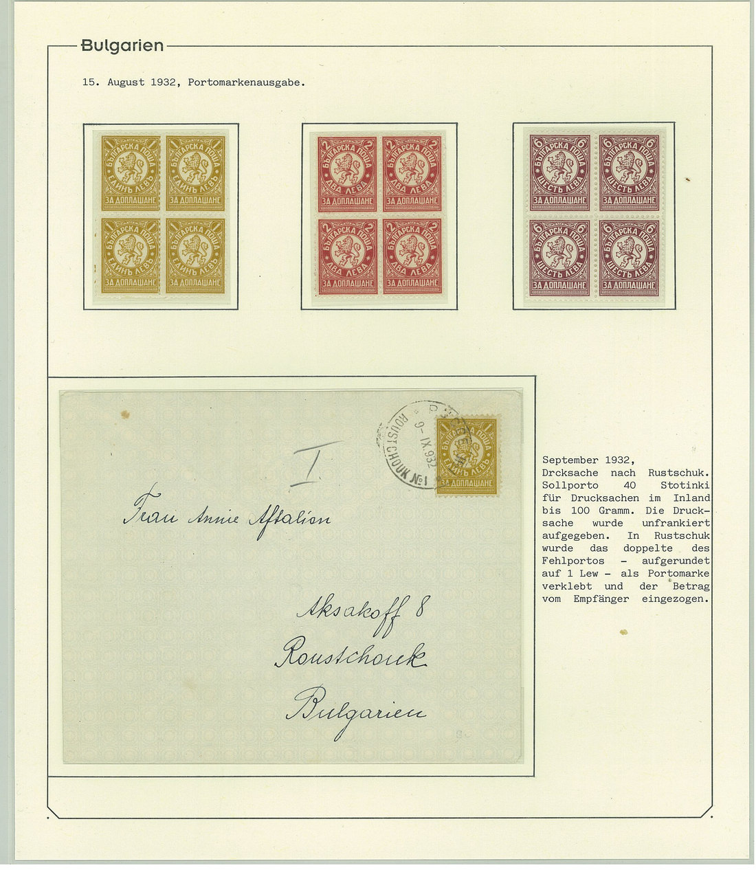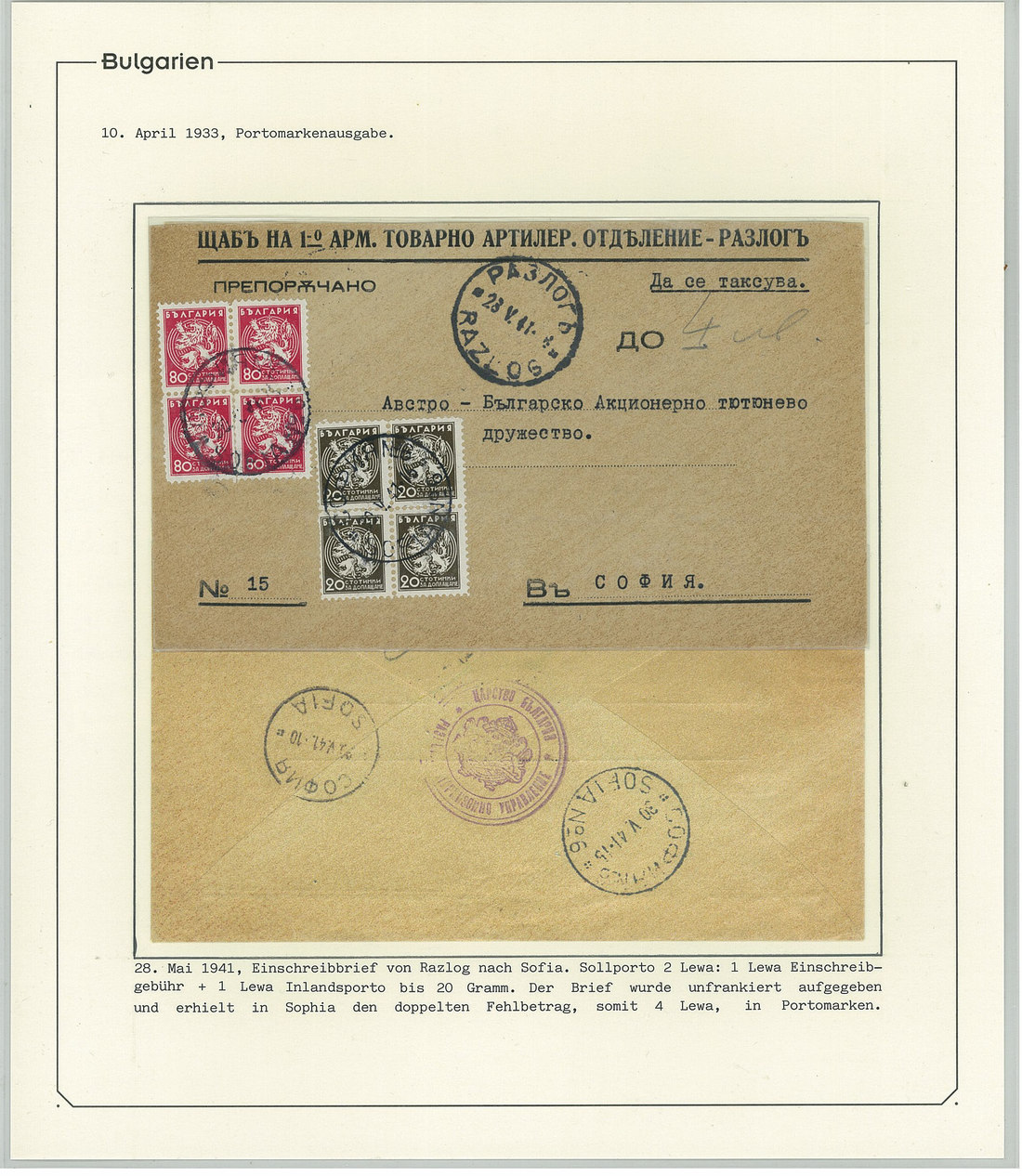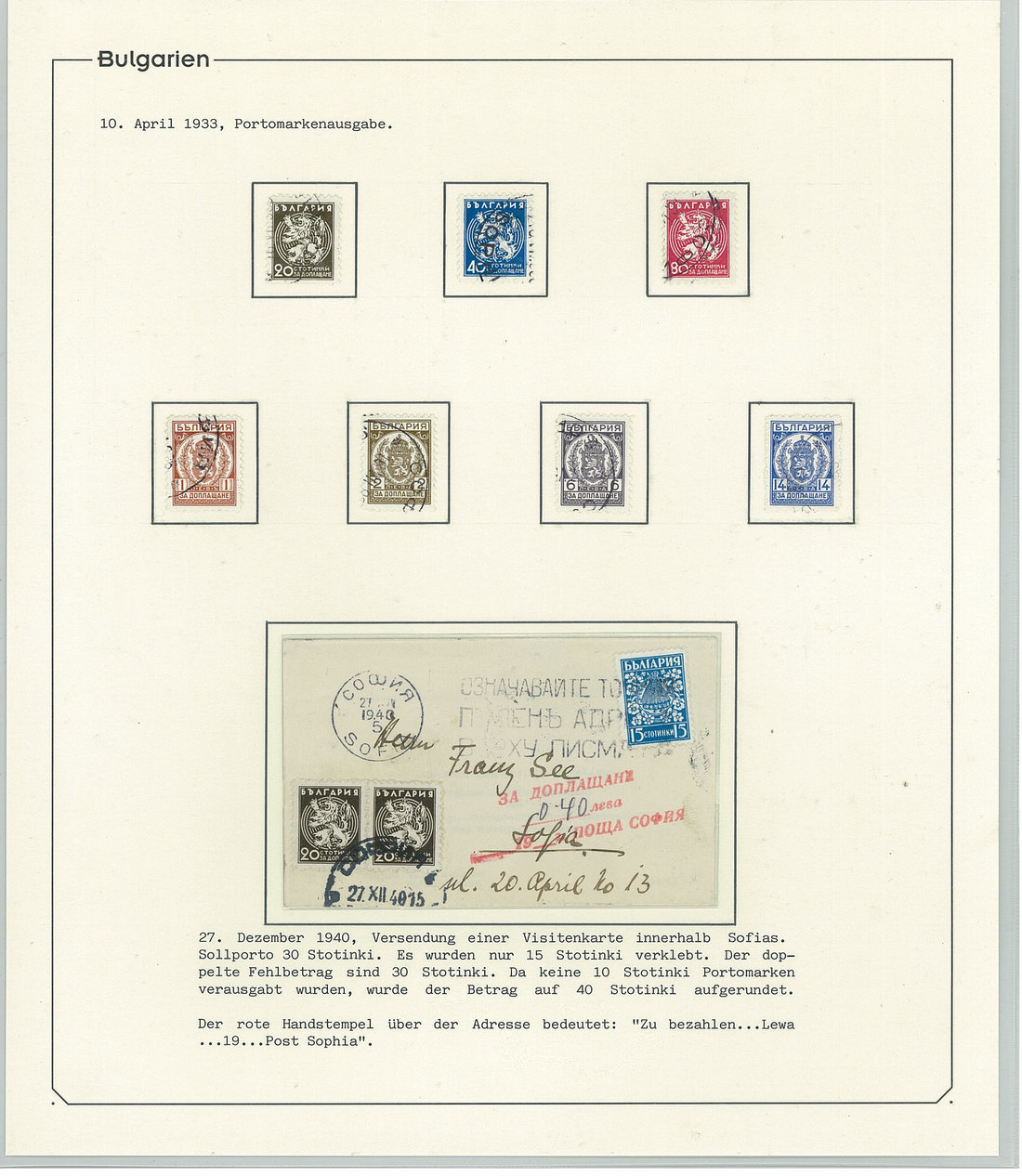 BulgariaLater Issues1919-33, Postage Dues Issues. A comprehensive collection containing stamps, inclusive of multiples, imperforates, varieties, as well as 42 covers, including the 1919-21 issues scarcely used as postage dues, 1921 1l. imperforate (one of just two covers known), the infrequently used 1933 issue, multiple frankings, and attractive combinations with foreign countries. Viewing essential. Photo