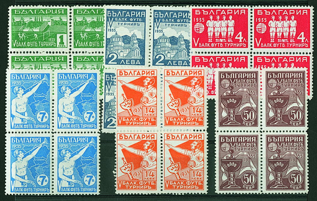 BulgariaLater Issues1935, Balkan Football Tournament, complete set of six values, very fresh in blocks of four, never hinged. Superb and rare. Mi. 274-279; € 2,200++. Photo