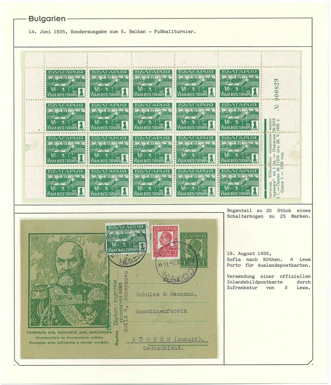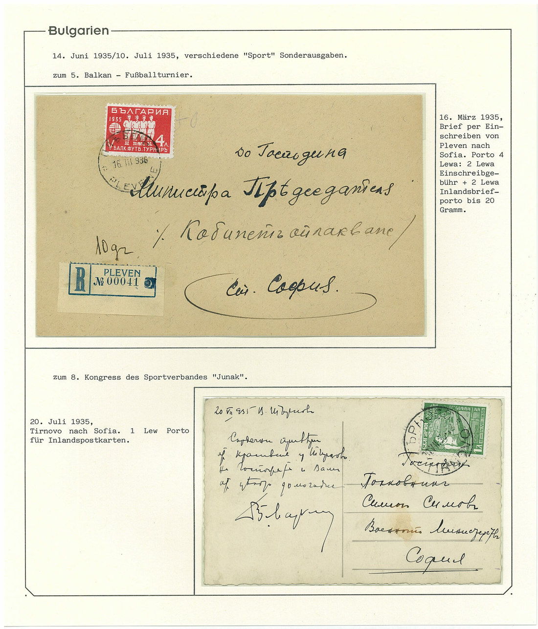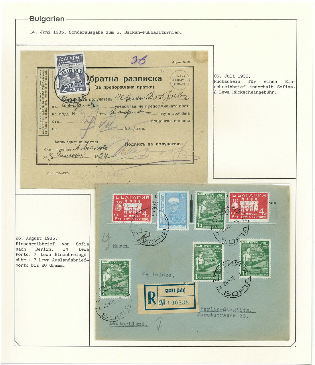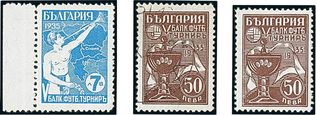 BulgariaLater Issues1935, Balkan Football Tournament Issue. Selection of 35 stamps including the set n.h. and used, 7l. with "broken Greek border" variety, 1l. part sheet of 15, six unusual covers correctly paying the rate with single and mixed issues frankings, and scarce acknowledgement of receipt form. A rare and very desirable issue. Mi. 274-279. Photo