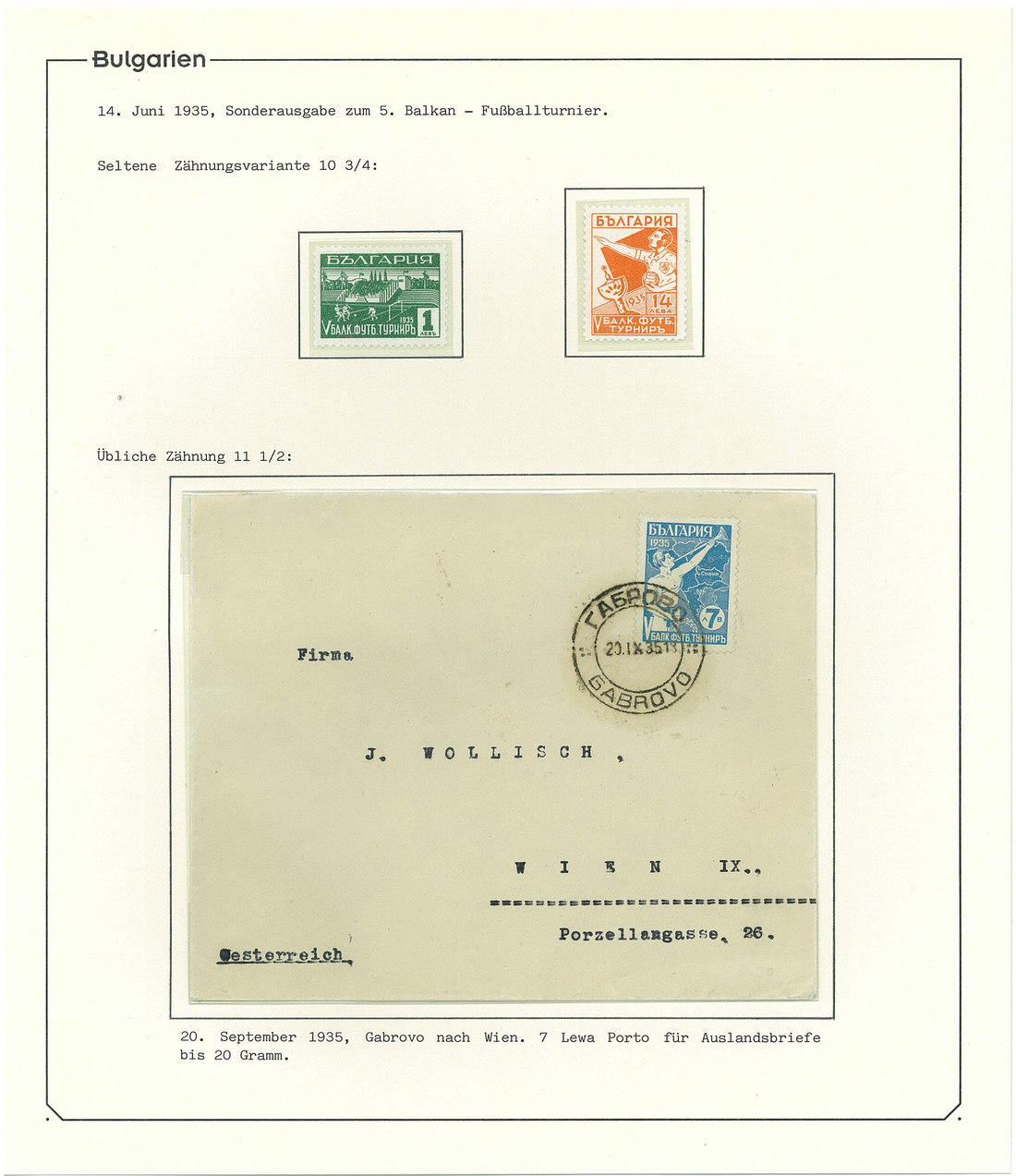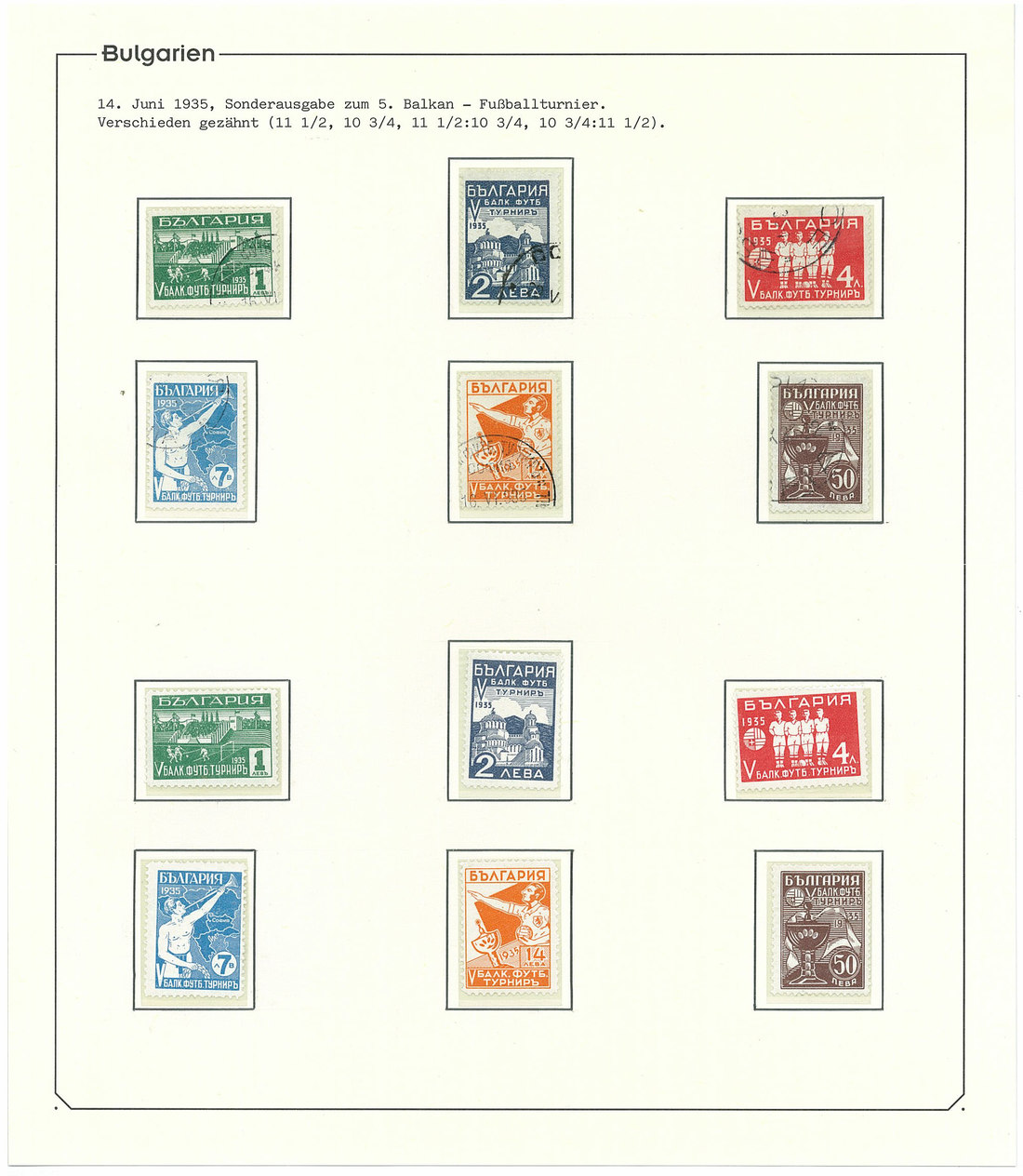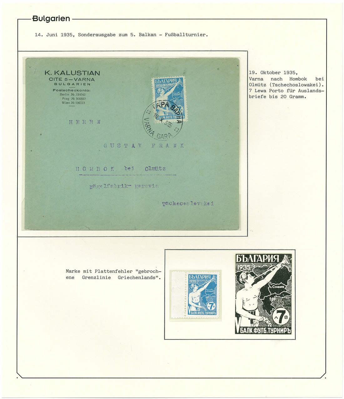 BulgariaLater Issues1935, Balkan Football Tournament Issue. Selection of 35 stamps including the set n.h. and used, 7l. with "broken Greek border" variety, 1l. part sheet of 15, six unusual covers correctly paying the rate with single and mixed issues frankings, and scarce acknowledgement of receipt form. A rare and very desirable issue. Mi. 274-279. Photo