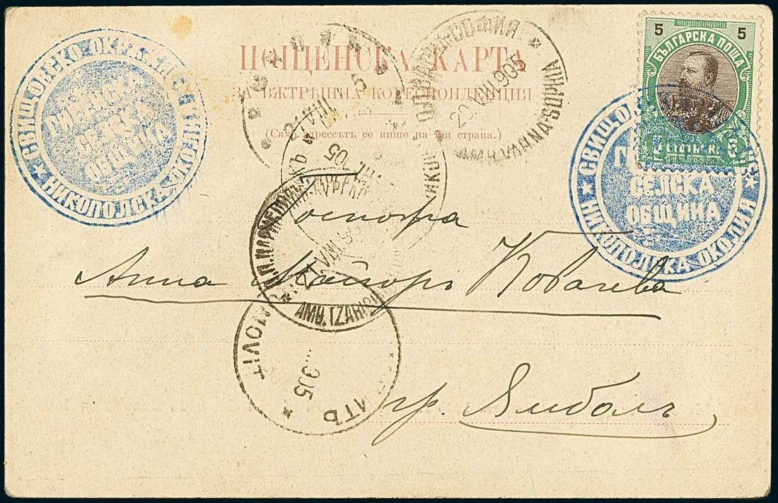 BulgariaRural Mail1905, Aug. 18. Postcard from village Gigen to Jambol, franked by 1901 5st. tied by superb strike of negative "District Svishtov/Municipality of Nikopol/Rural Community of Gigen" handstamp, repeated at left, with various c.d.s.'s in centre including Somovit and travelling "Varna-Sofia" & "Tsaribrod-Burgas". The only example recorded of this postmark, described by Hitzler in his certifcate as "the most beautiful cover of the Bulgarian village mail"; very few items with other negative seals are also recorded, being of poorer quality. Cert. Hitzler. Photo