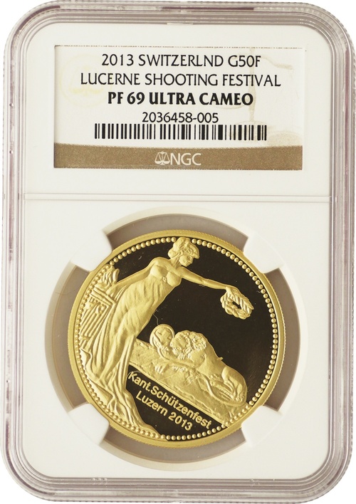 Switzerland, Lucerne Shooting Festival 50 Francs Gold Pieforts Proof Hab89b 2013, NGC PF69 ULTRA CAMEO